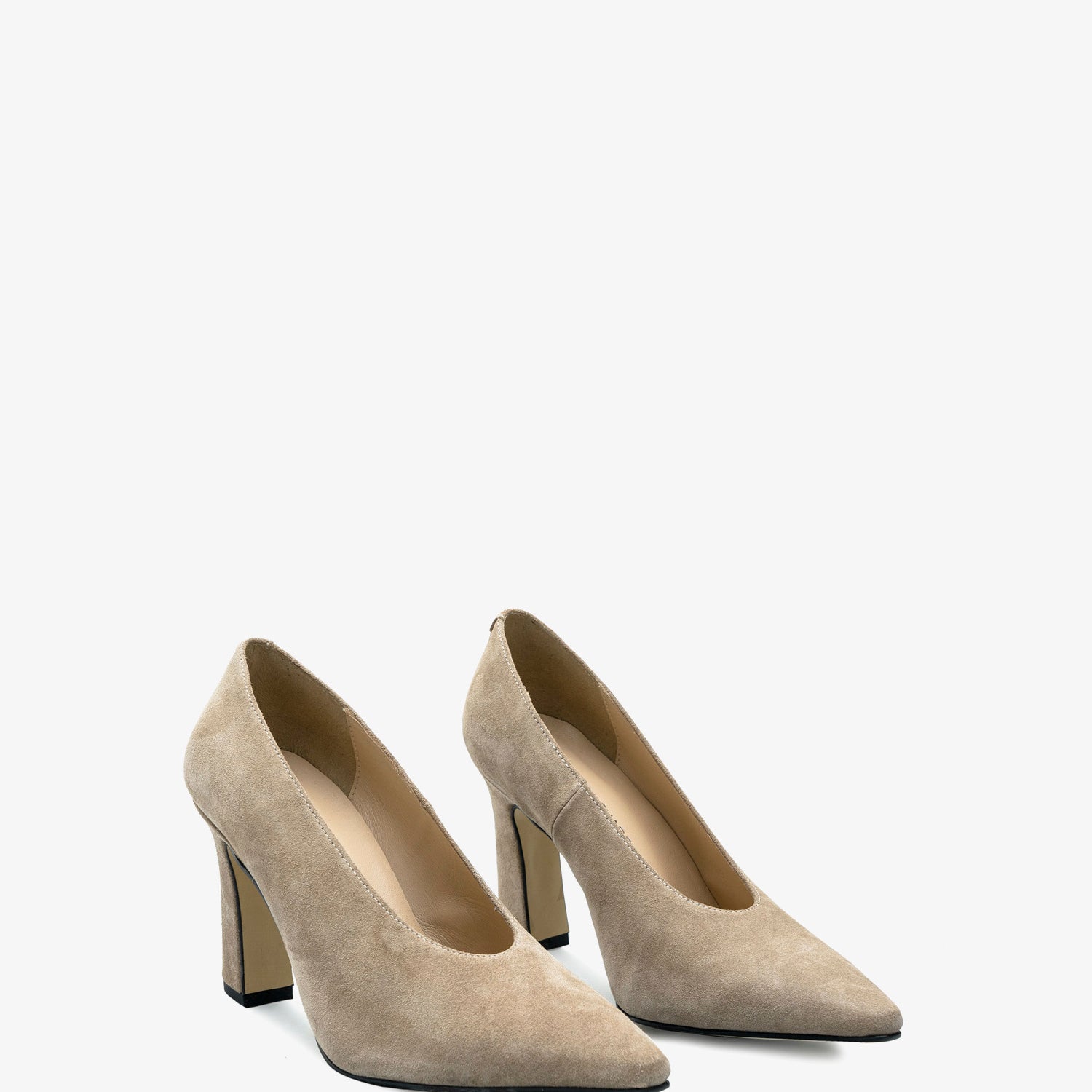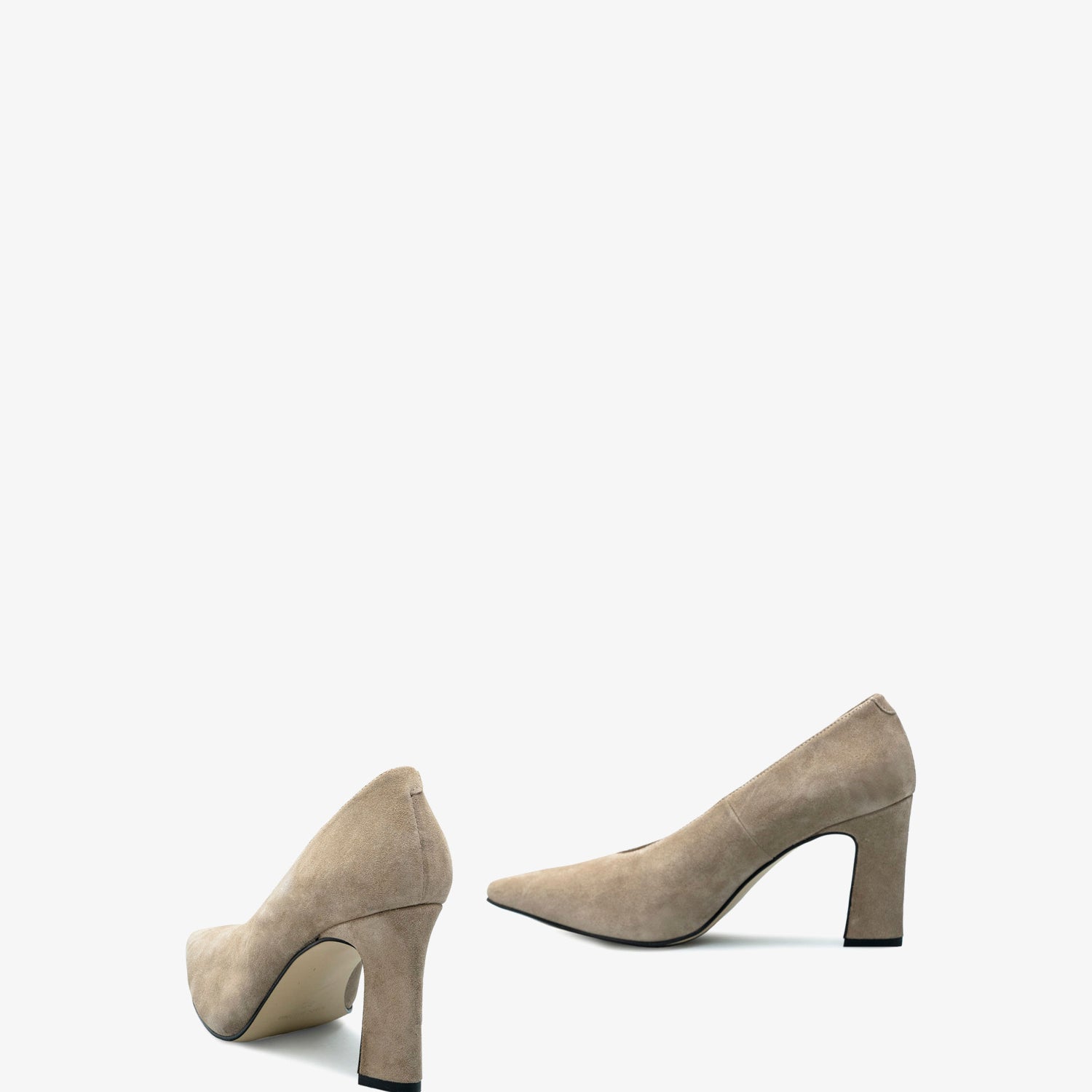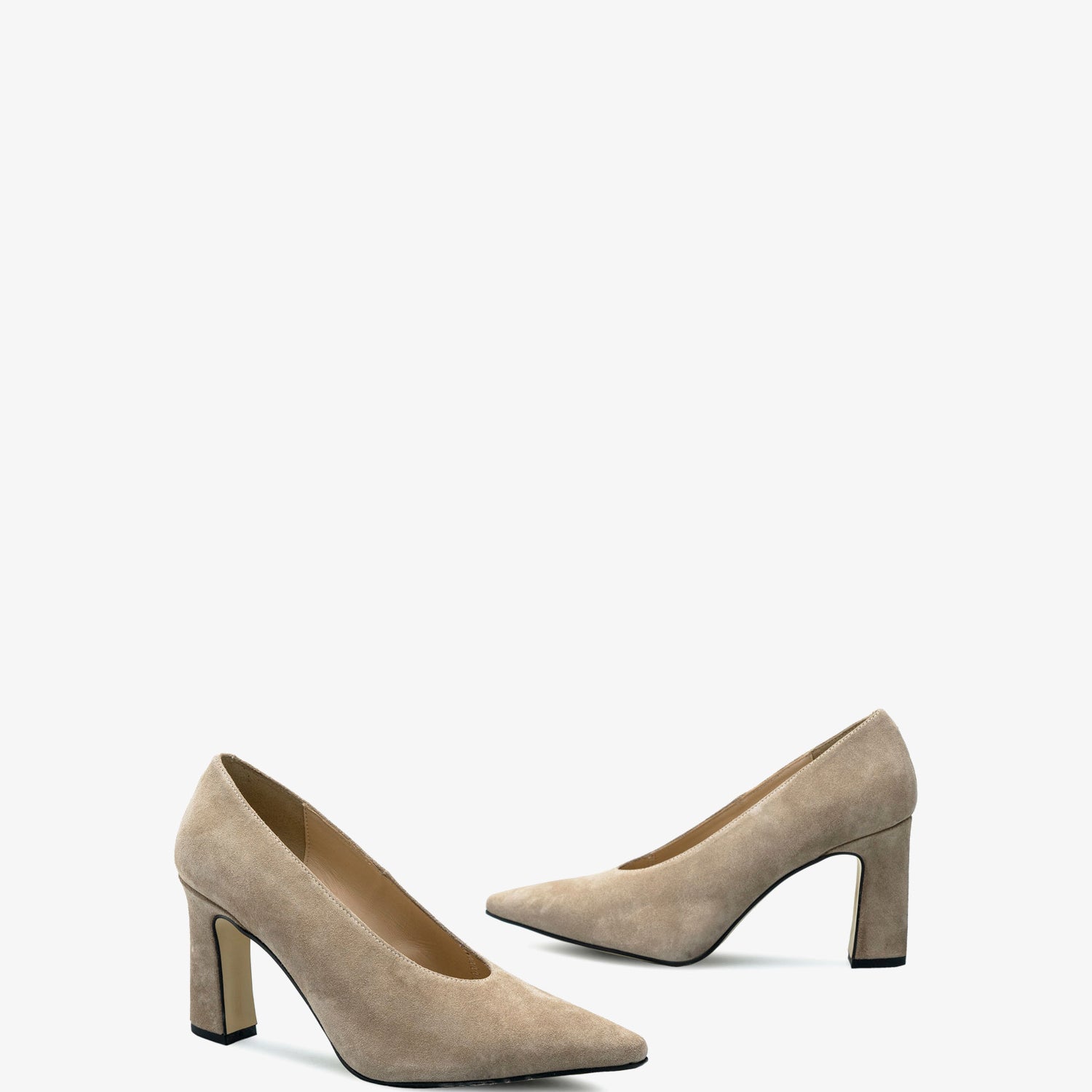 Light brown split leather stilettos. Pointed toe. Inner lining in camel-colored leather. Wide matching 8,5cm/ 3.34in heel for small sizes from 32 to 35. 9,5cm/ 3.74in heel for large sizes from 42 to 45. Made in Spain.