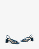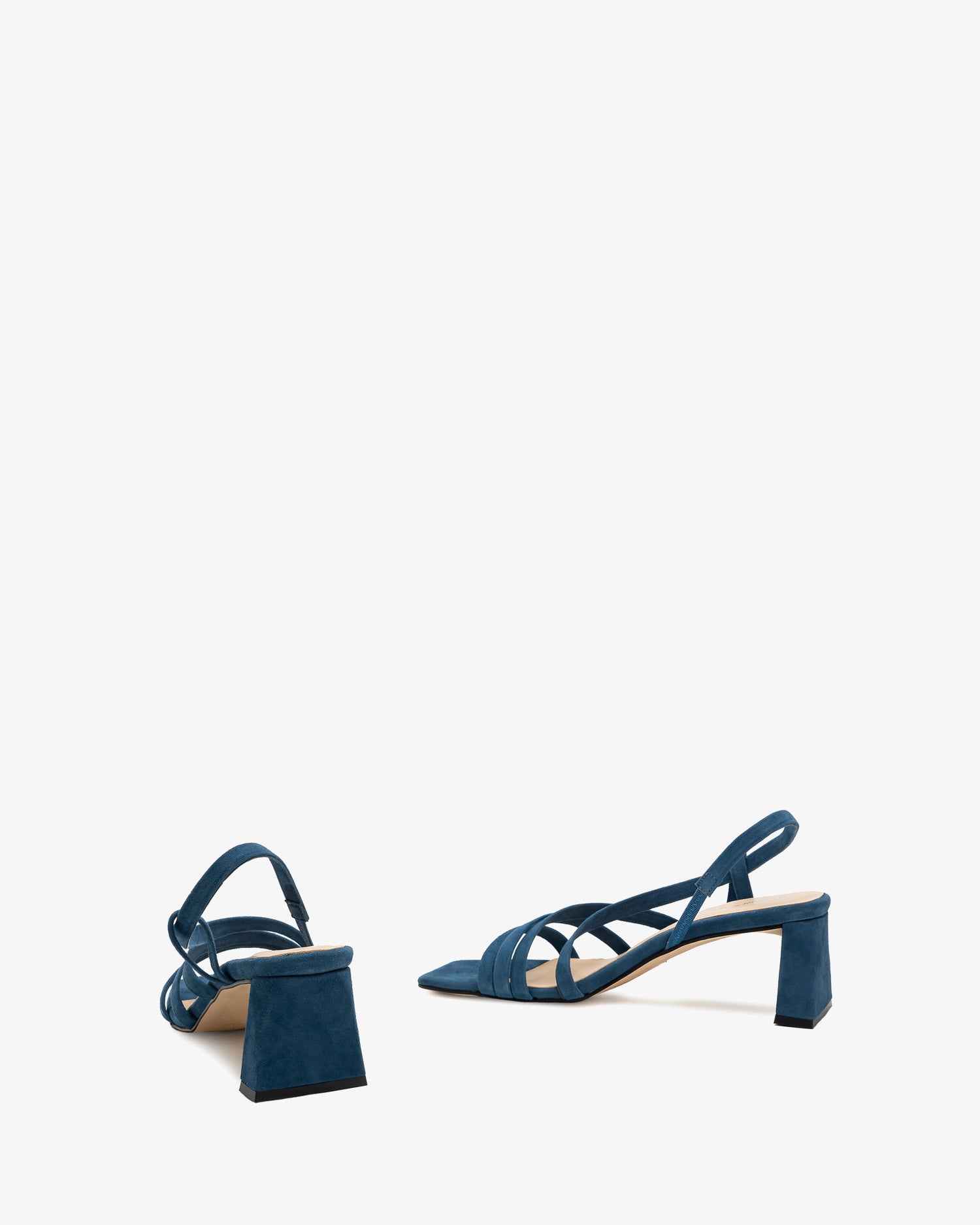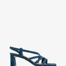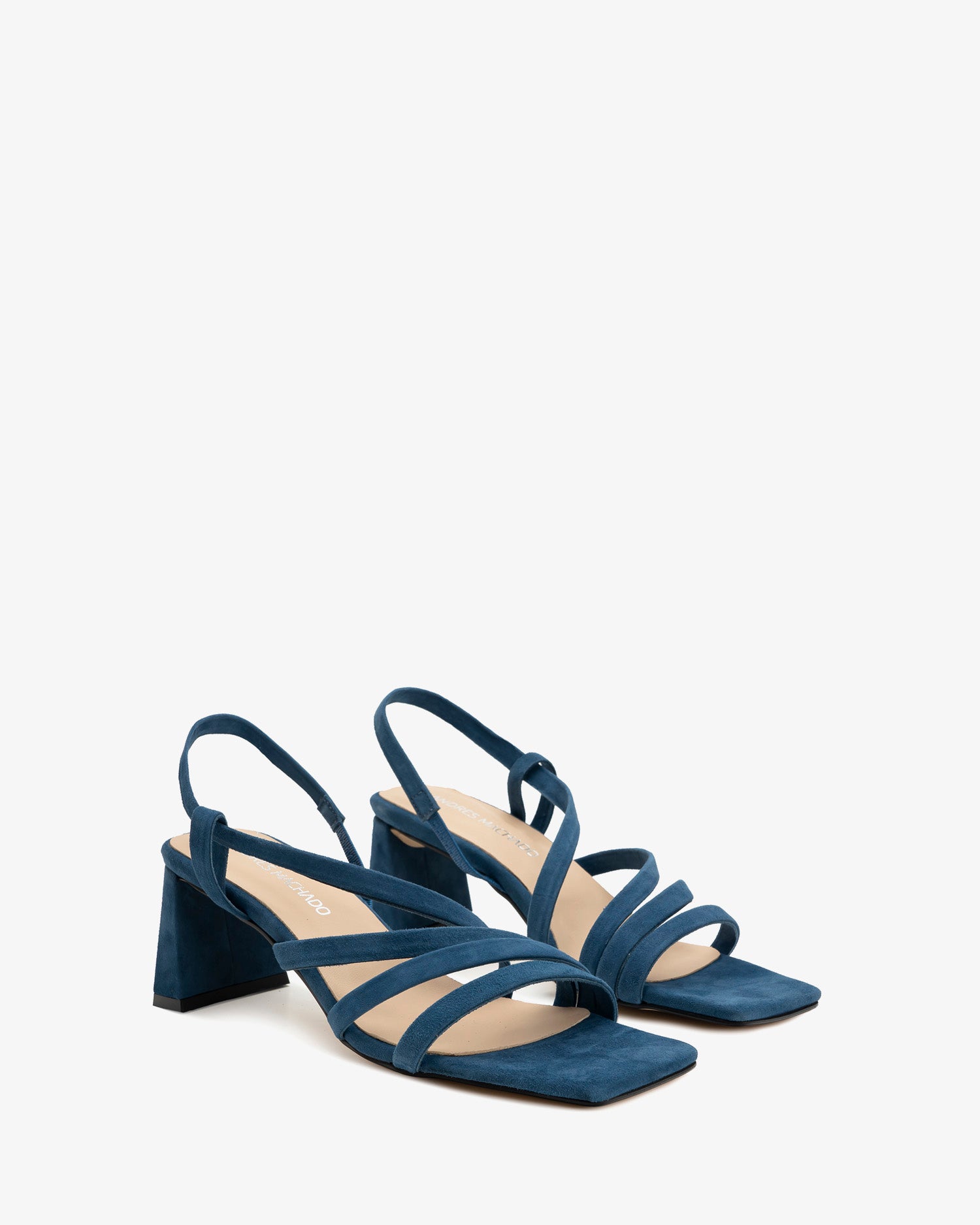 Sandals in blue split leather. Designed with matching thin straps crossing diagonally over the instpep and around the ankle with matching elastic for extra support. Rectangular heel lined in matching split leather. Available in sizes 32 to 45 EU. The heel is 5,5 cm / 2.16`` high for sizes from 32 to 38 EU. The heel is 6 cm / 2.36`` high for sizes from 39 to 45 EU.