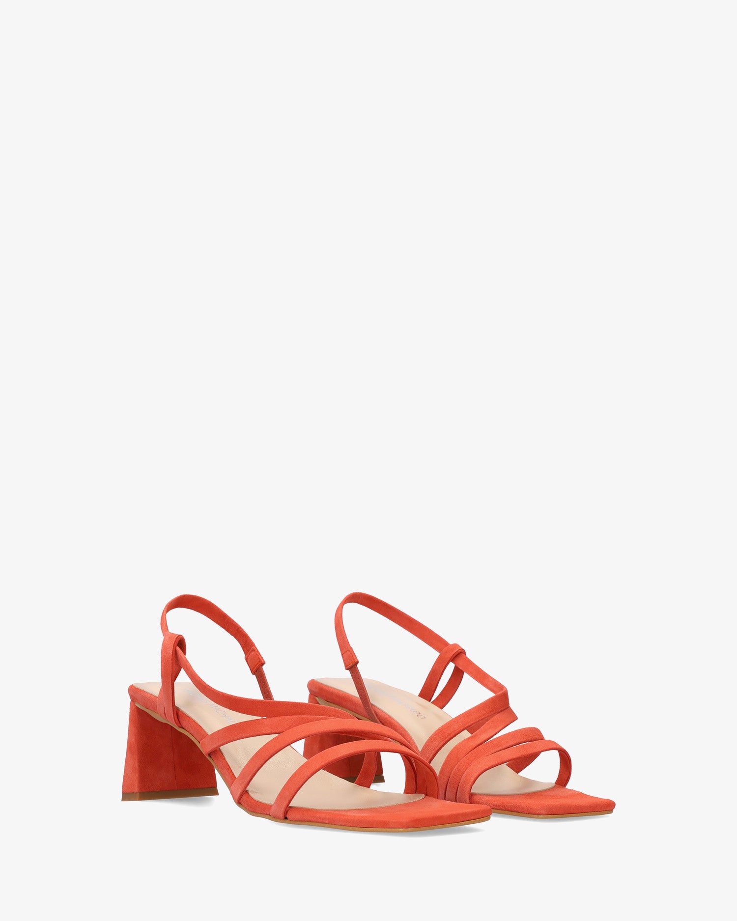 Sandals in brick-red split leather. Designed with matching thin straps crossing diagonally over the instpep and around the ankle with matching elastic for extra support. Rectangular heel lined in matching split leather. Available in sizes 32 to 45 EU. The heel is 5,5 cm / 2.16`` high for sizes from 32 to 38 EU. The heel is 6 cm / 2.36`` high for sizes from 39 to 45 EU.