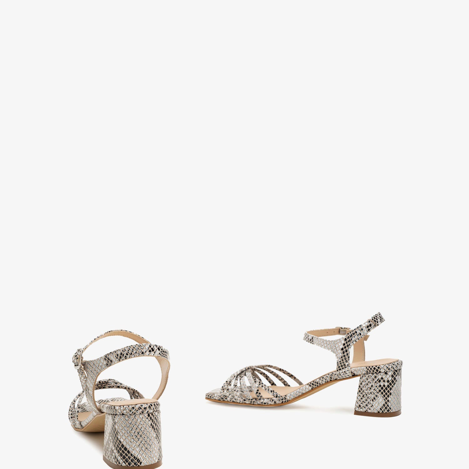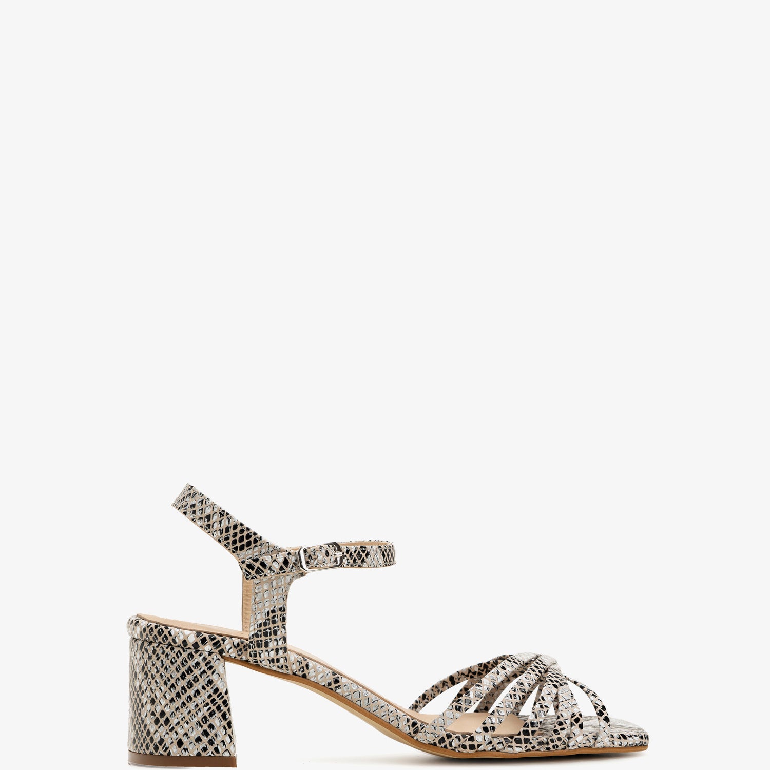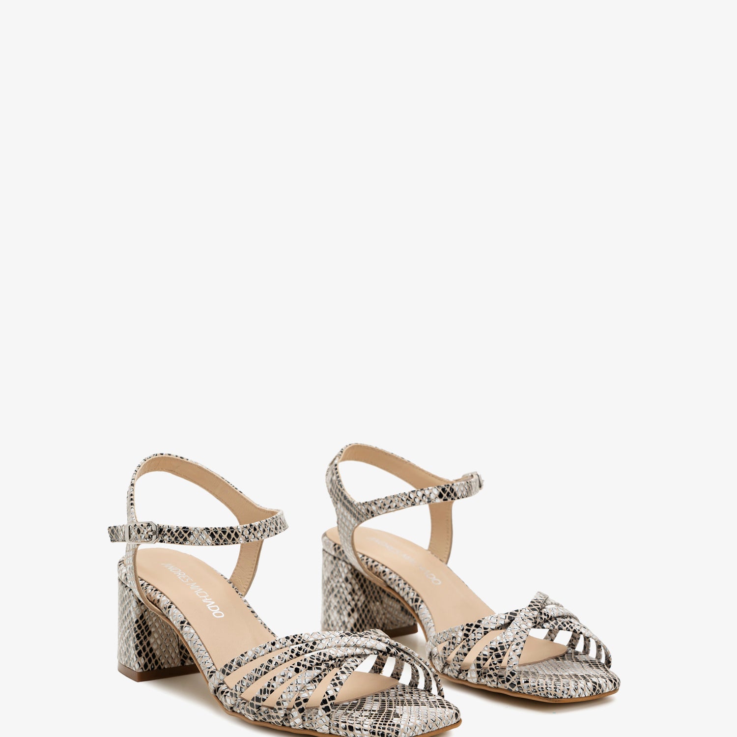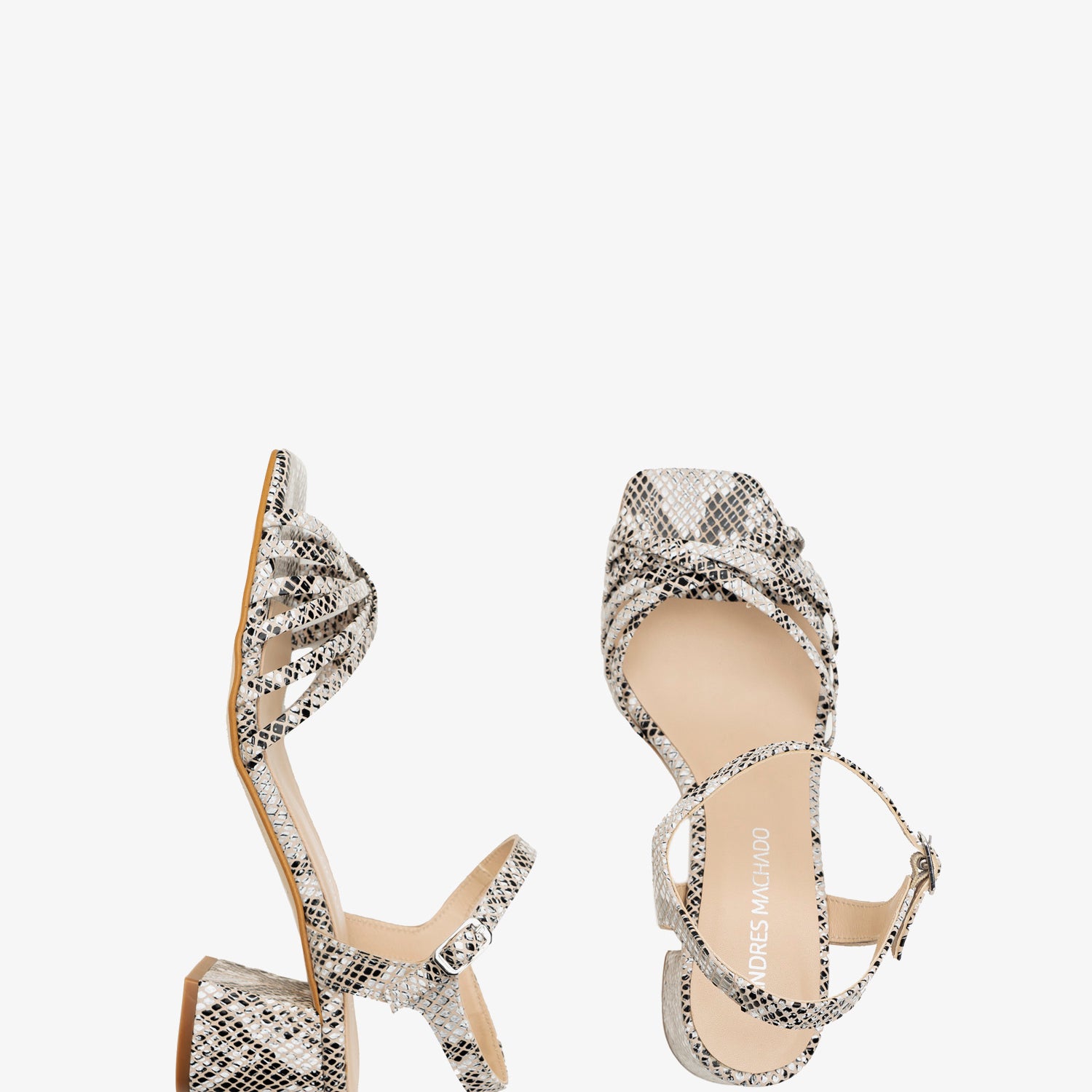Sandals in brown snake print leather. Designed with thin matching straps crossed over the instep. Buckled strap closure around the ankle. Finished in a square, open toe. Available in sizes 32 to 45 EU. The heel is 6 cm / 2.36`` high for small sizes from 32 to 35 EU. The heel is 6 cm / 2.36`` high for medium sizes from 36 to 41 EU. The heel is 6 cm / 2.36`` high for large sizes from 42 to 45 EU. Made in Spain.
