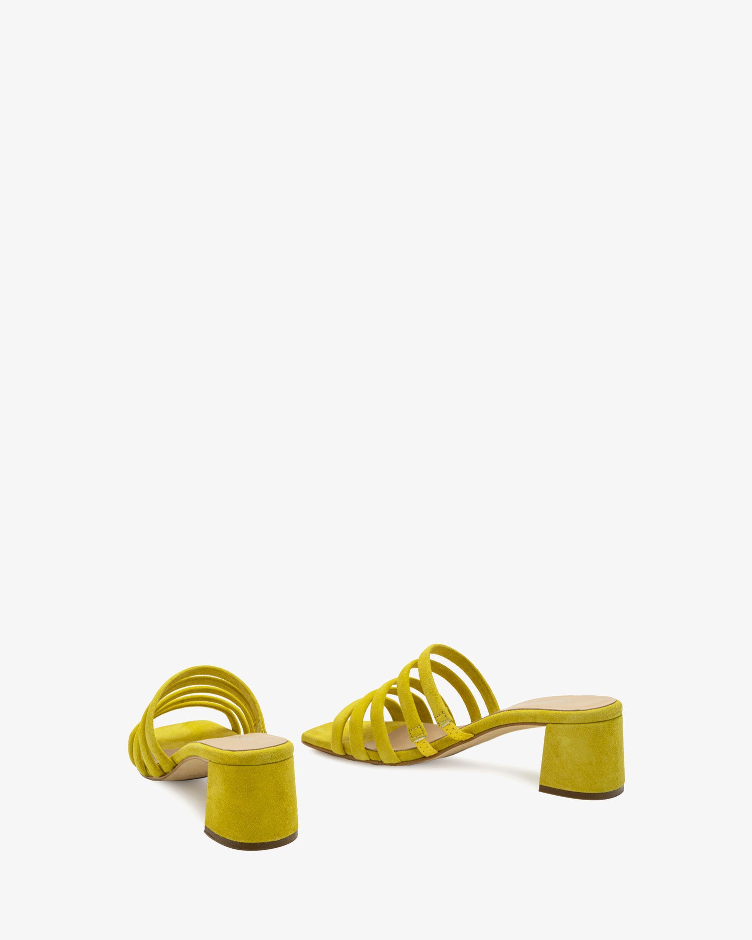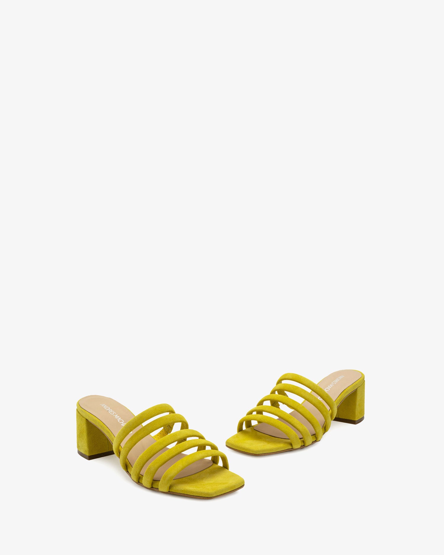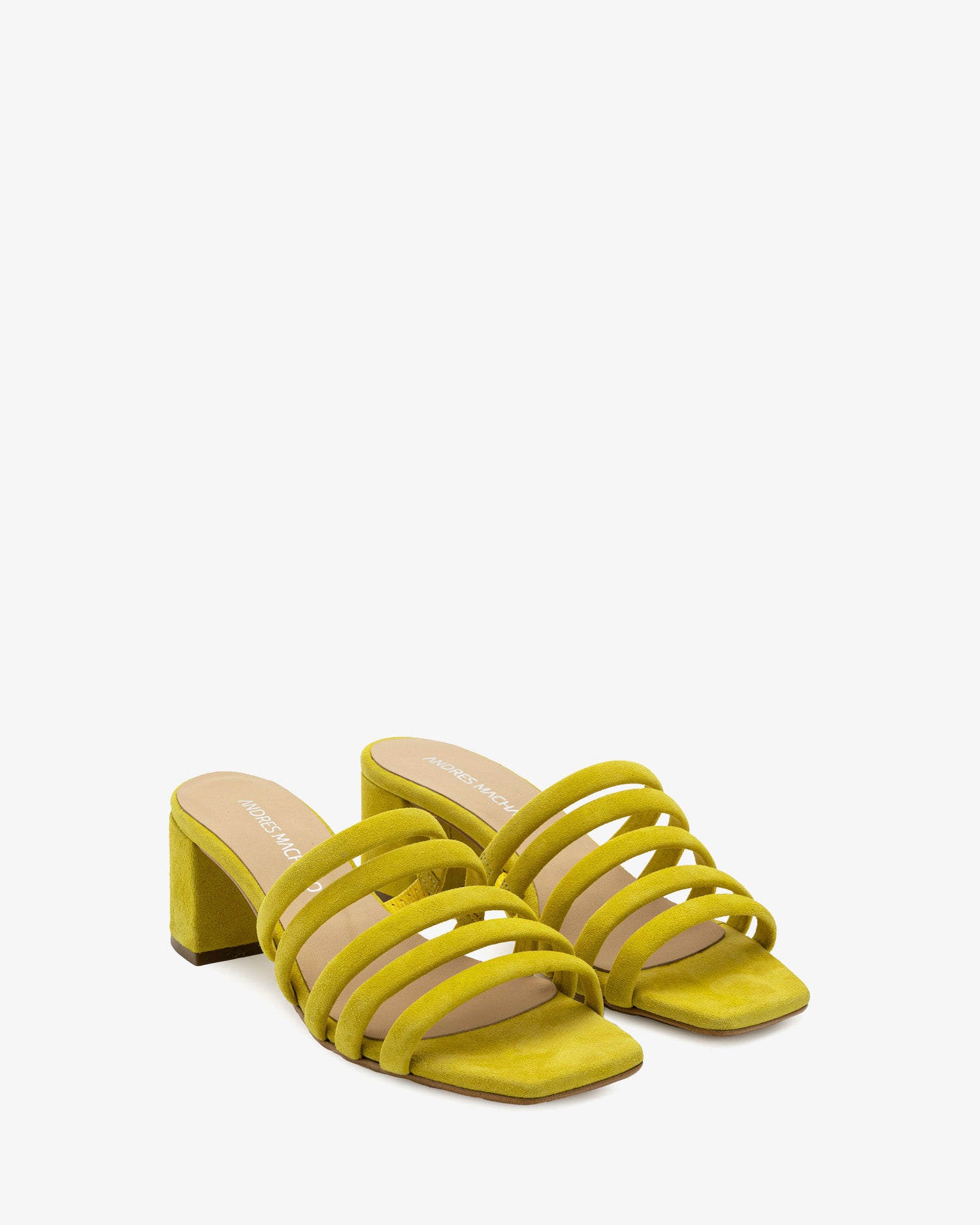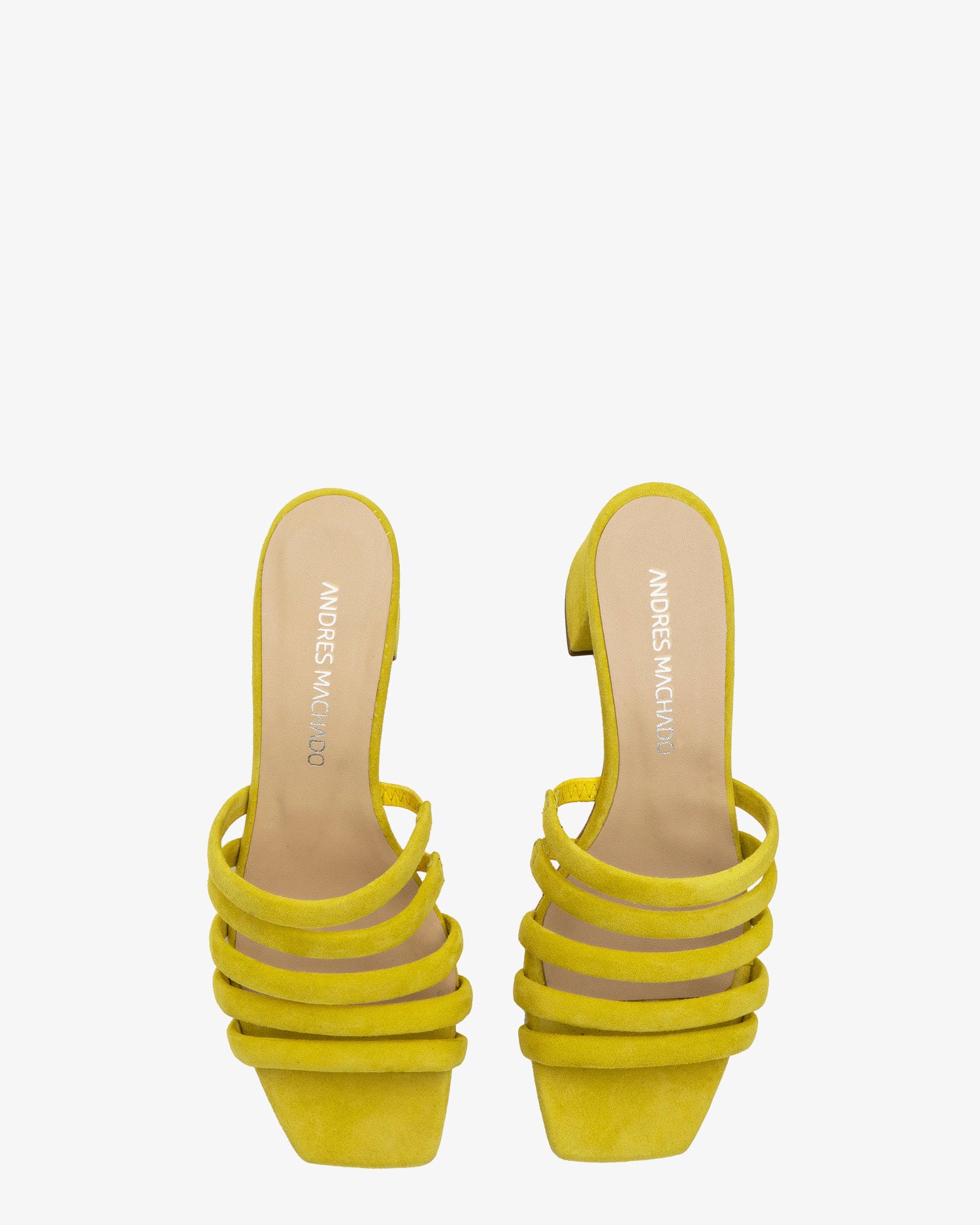 Mules made of Yellow suede leather. They feature 5 tubular straps, the first 2 straps with mini-elastics on the inner-side for great adjustment to the foot. Square toe. Insole in leather. Matching lined block heel of 2.36" / 6 cm of height for the small sizes from UK 0.5 to 2.5 / EU 32 to 35. Heel of 2.56" / 6.5 cm of height for the large sizes from UK 8 to 10.5 / EU 42 to 45. MADE IN SPAIN.