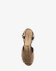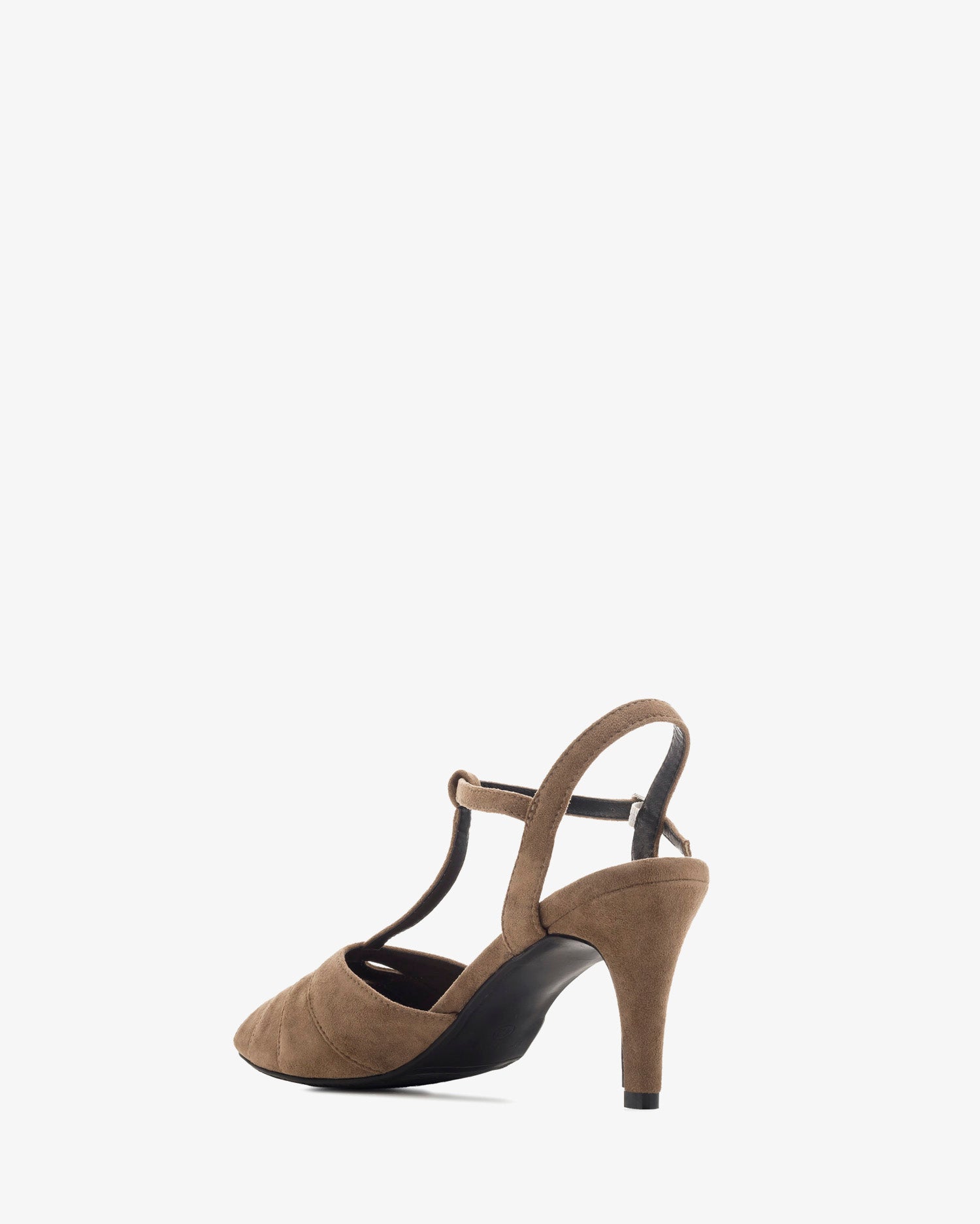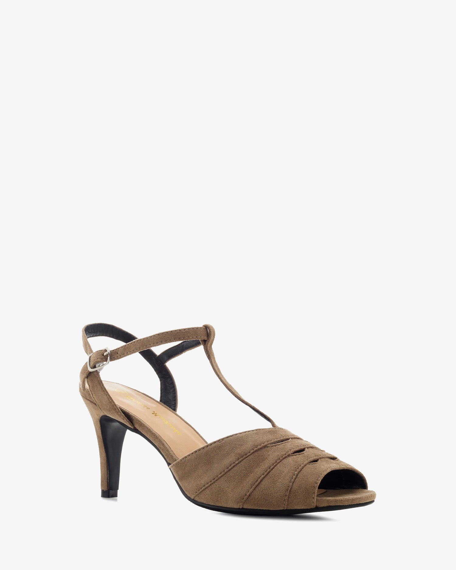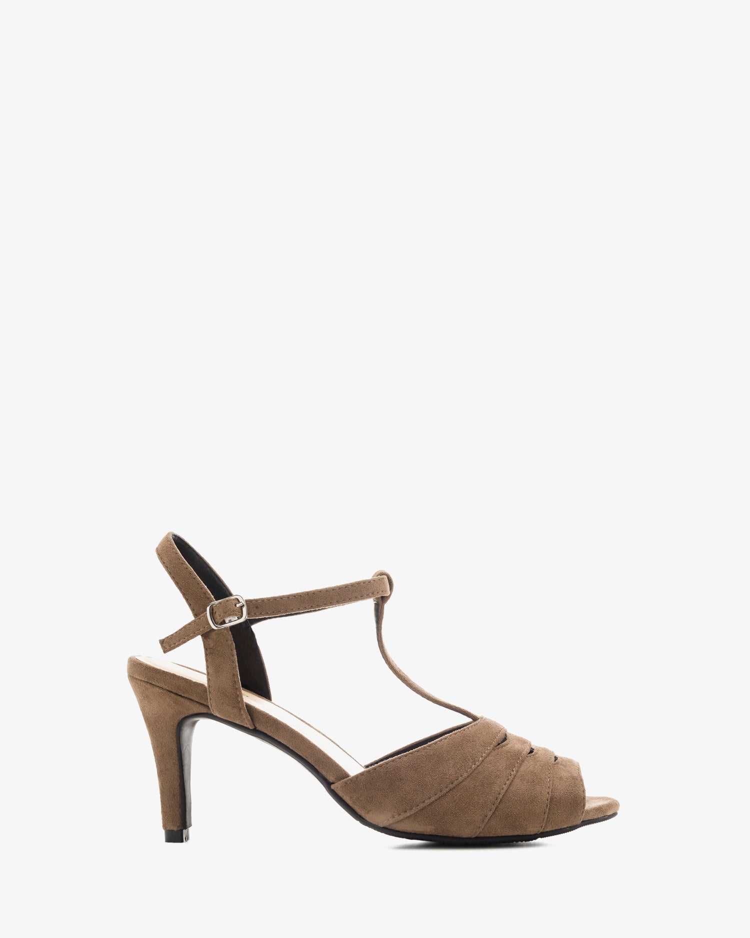 Sandals made of Earth-coloured manmade suede. 4 overlapping upper bands with matching coloured stitching. T-Bar strap and ankle strap buckle closure. Matching lined stiletto mid-heel of 3.54" / 9 cm for Small sizes from UK 0.5 to 2.5 / EU 32 to 35. Matching lined stiletto mid-heel of 3.93" / 10 cm for Big sizes from UK 8 to 10.5 / EU 42 to 45.