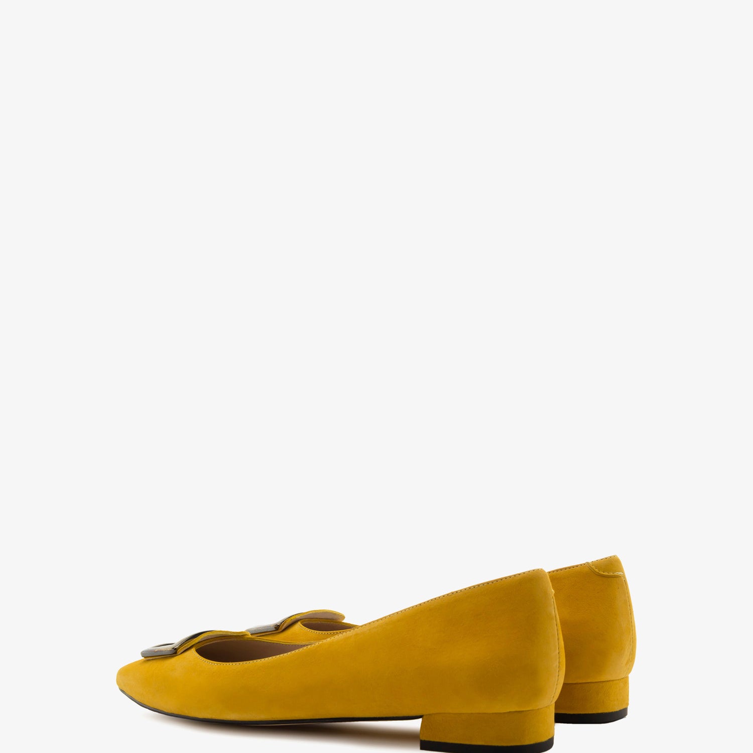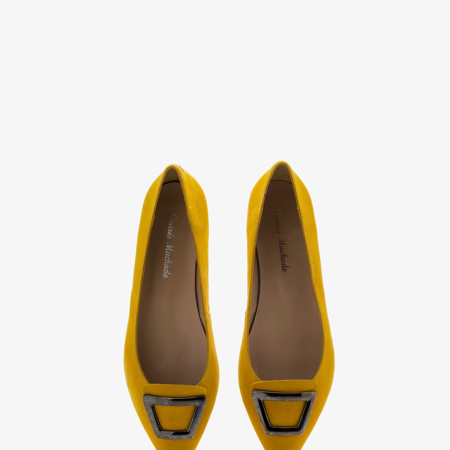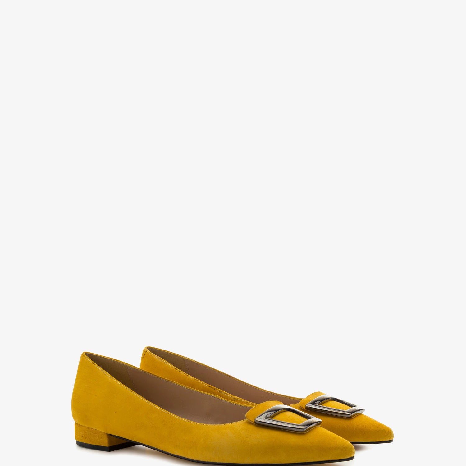 Loafers made of high quality Suede Leather in Mustard colour. Decorative square-shaped metallic trim on the upper. Fine tip and leather interior lining. Toned-covered mini-heel of 0.79" / 2 cm for Small sizes from UK 0.5 to 2.5 / EU 32 to 35 and for Big sizes from UK 8 to 10.5 / EU 42 to 45. Made in Spain.