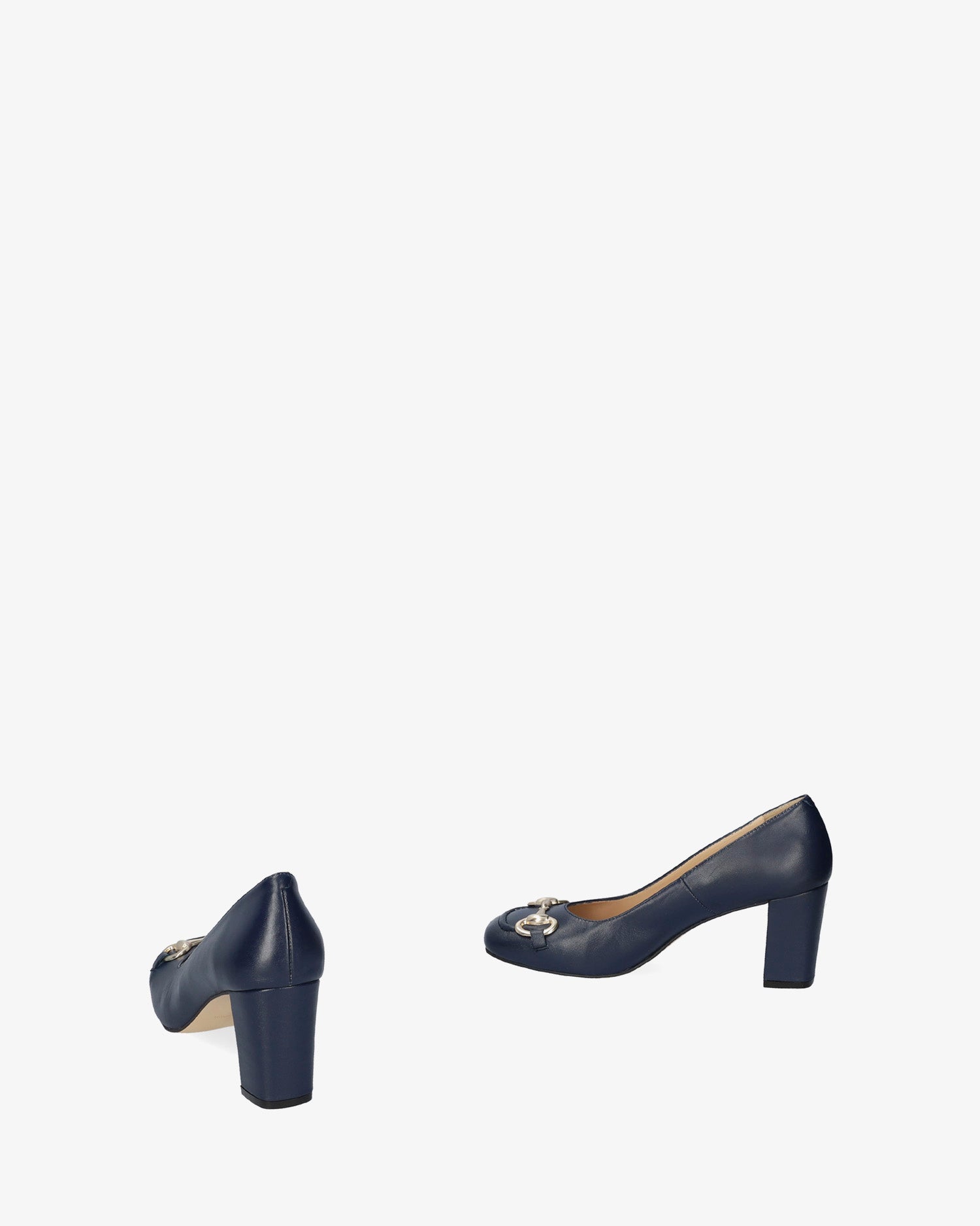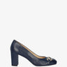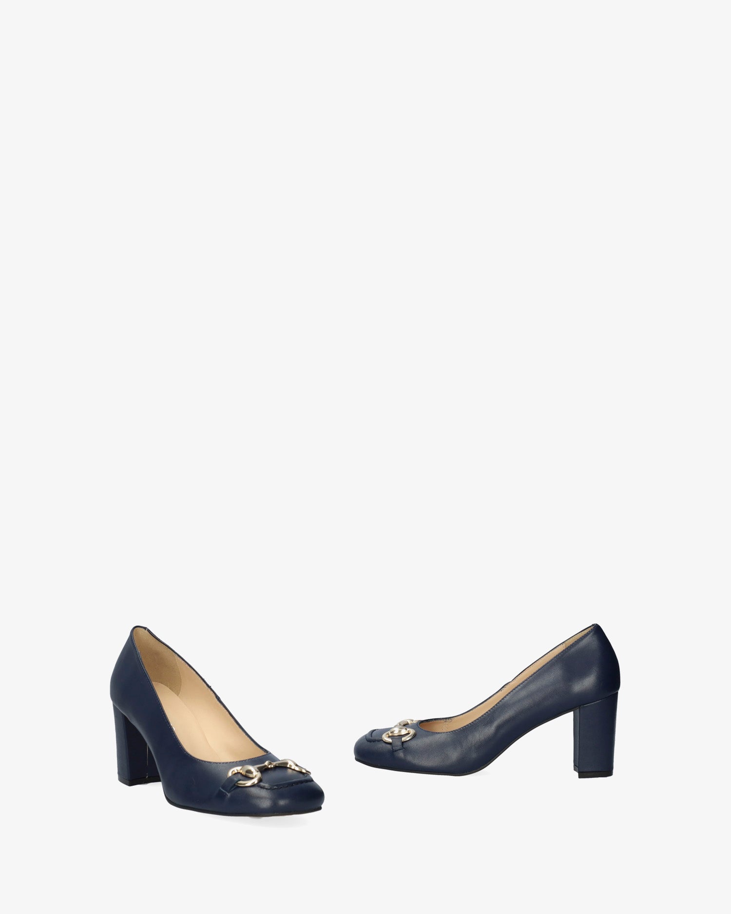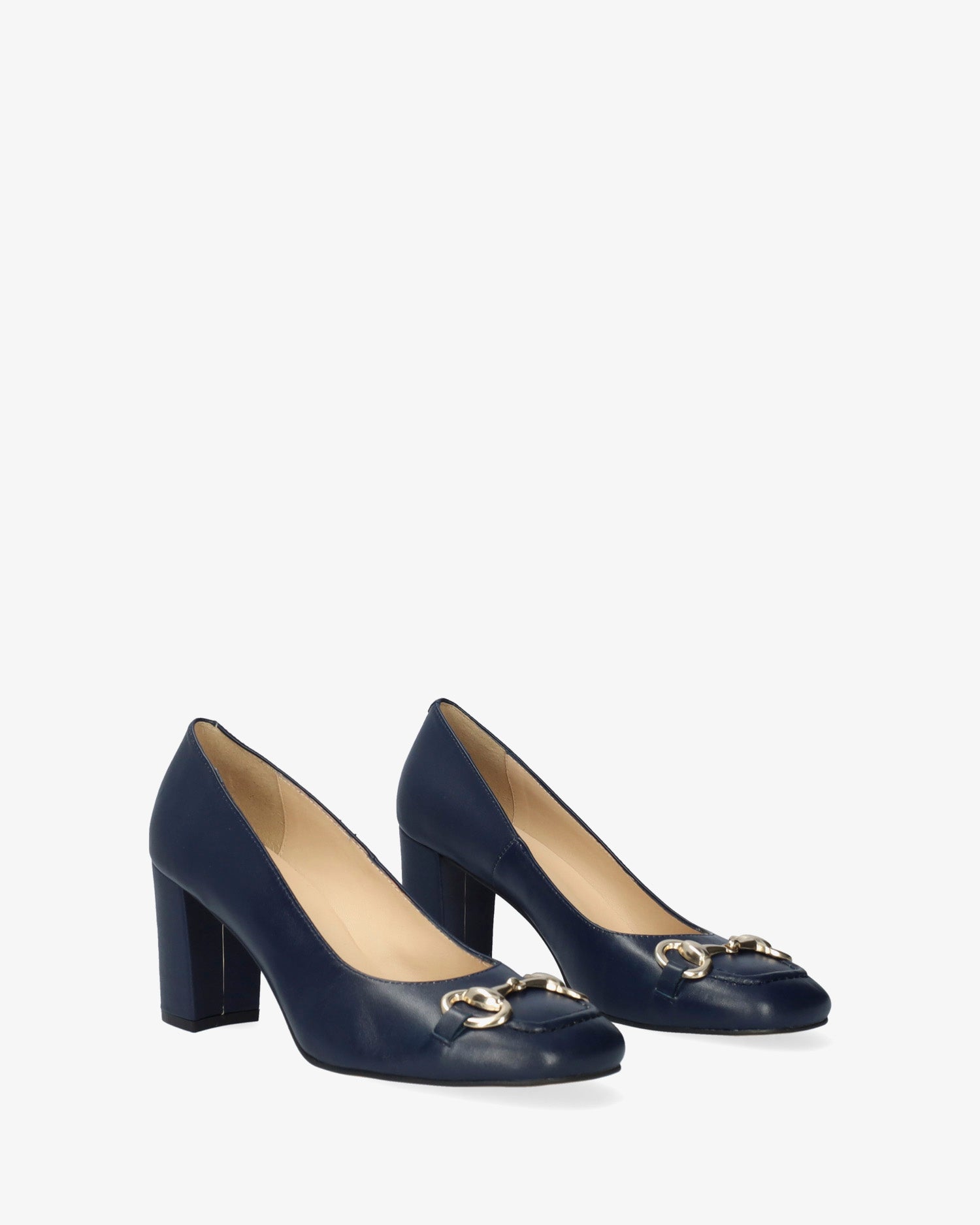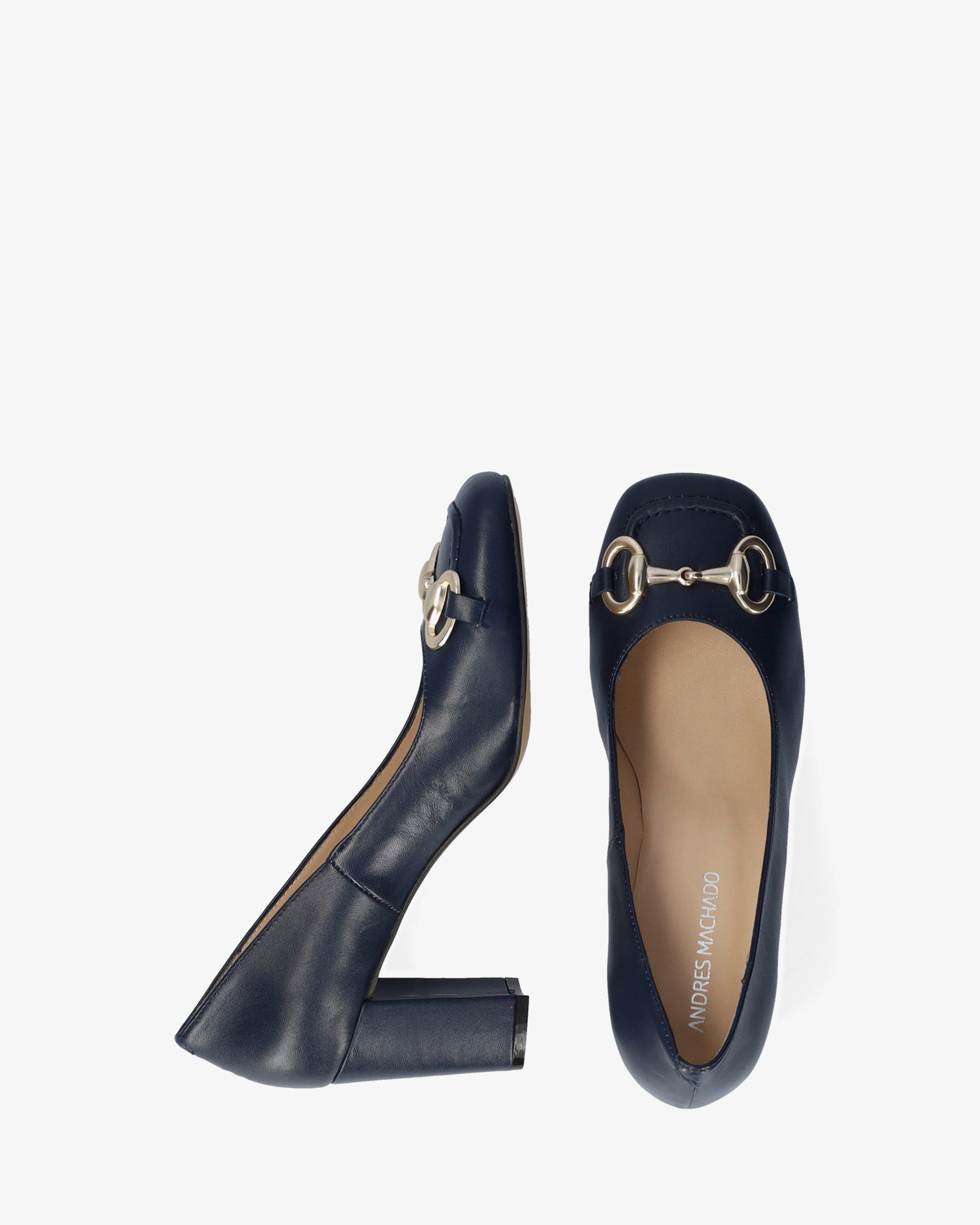 Vintage style shoes in navy leather. Metallic gold buckle detail on the vamp. Finished in a square toe. Beige leather inner lining. The wide heel, lined in matching leather, is 7 cm / 2.75`` high for small sizes from 32 to 35 EU, 7.5 cm / 2.95`` high for medium sizes from 36 to 41 EU and 7.5 cm / 2.95`` high for large sizes from 42 to 45 EU. Spanische Herstellung.