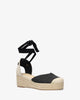 Wedge sandals in black coloured raffia-like fabric. Semi-backless design with a stitched thread strap at the heel. Round, closed toe with stitched thread reinforcement at the front. Fastened with wide white ankle laces. Wedges and front platform in jute. Wedge measures 2,75", and the platform measures 1,18" for small sizes from 32 to 35. Wedge measures 2,75", and the platform measures 1,18" for large sizes from 42 to 45.