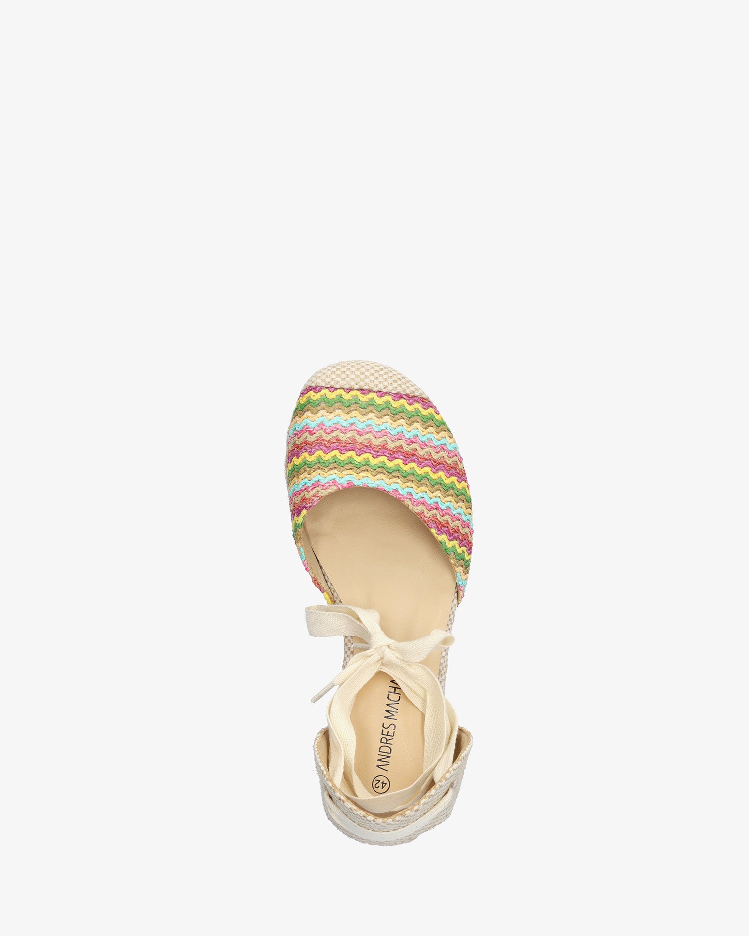 Wedge sandals in multi coloured raffia-like fabric. Semi-backless design with a stitched thread strap at the heel. Round, closed toe with stitched thread reinforcement at the front. Fastened with wide white ankle laces. Wedges and front platform in jute. Wedge measures 2,75", and the platform measures 1,18" for small sizes from 32 to 35. Wedge measures 2,75", and the platform measures 1,18" for large sizes from 42 to 45.