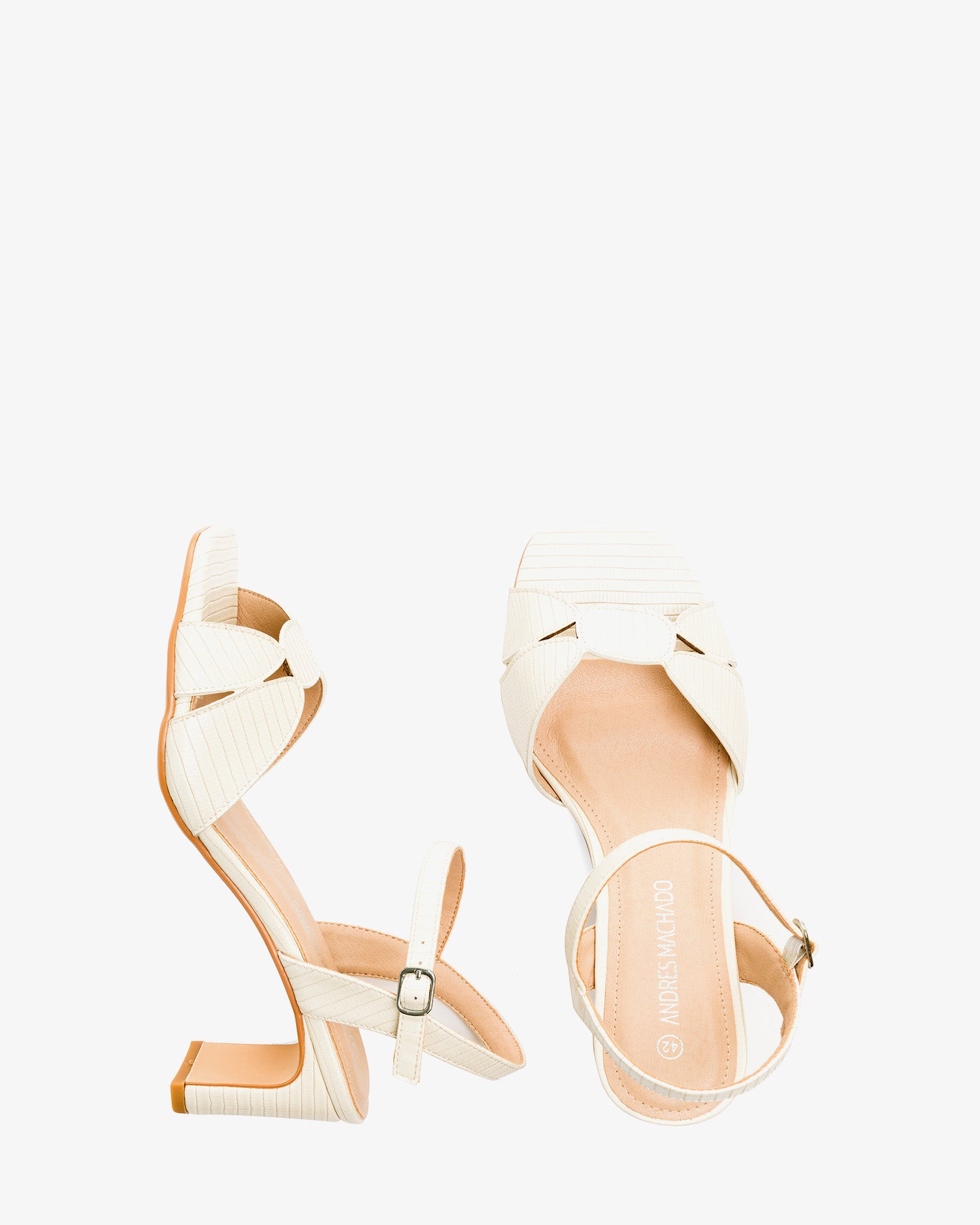White embossed faux leather sandals with wide heel. Slingback design featuring wide, matching oval straps over the vamp. Buckled strap closure around the ankle. Square and open toe box. The matching heel is 7cm /2,75`` for small sizes from 32 to 35 EU. The matching heel is 7,5cm /2,95`` for small sizes from 42 to 45 EU.
