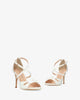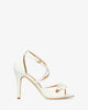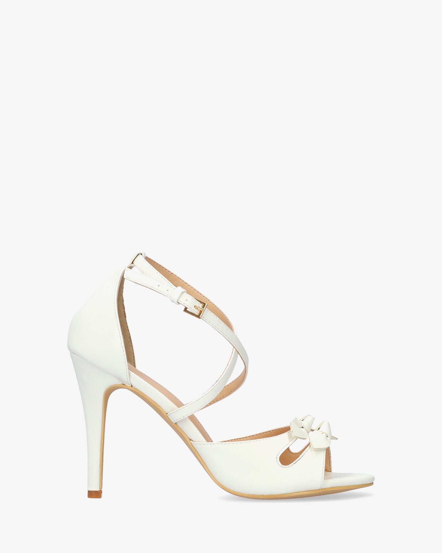 White soft color high-heeled sandals. Covered heel design with two straps and mini-knots in the front, matching the color. Metallic buckle closure with two thin crossed straps on the instep. Open-toe. Heel height of 3,74" for small sizes from 32 to 35. Heel height of 4,33" for large sizes from 42 to 45.