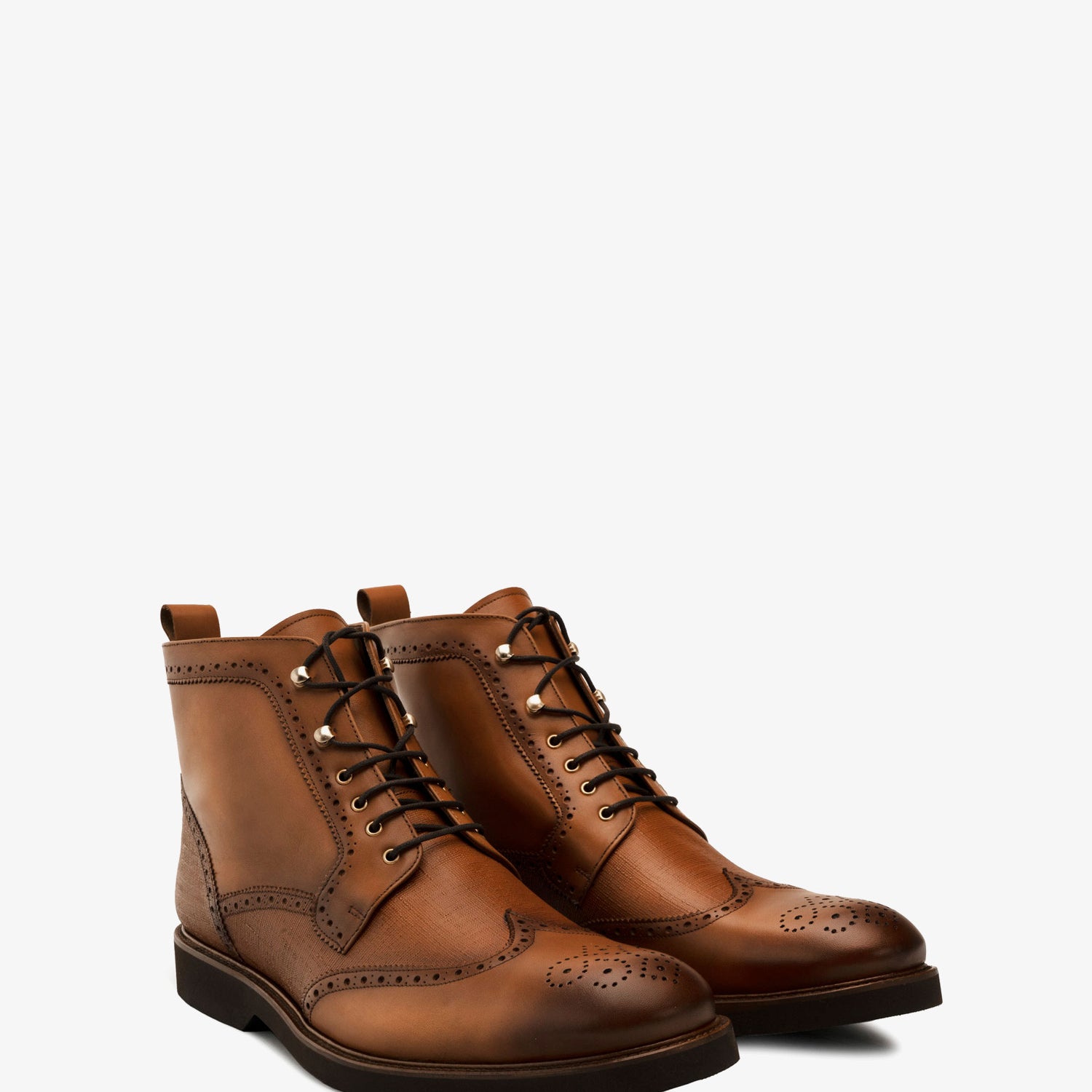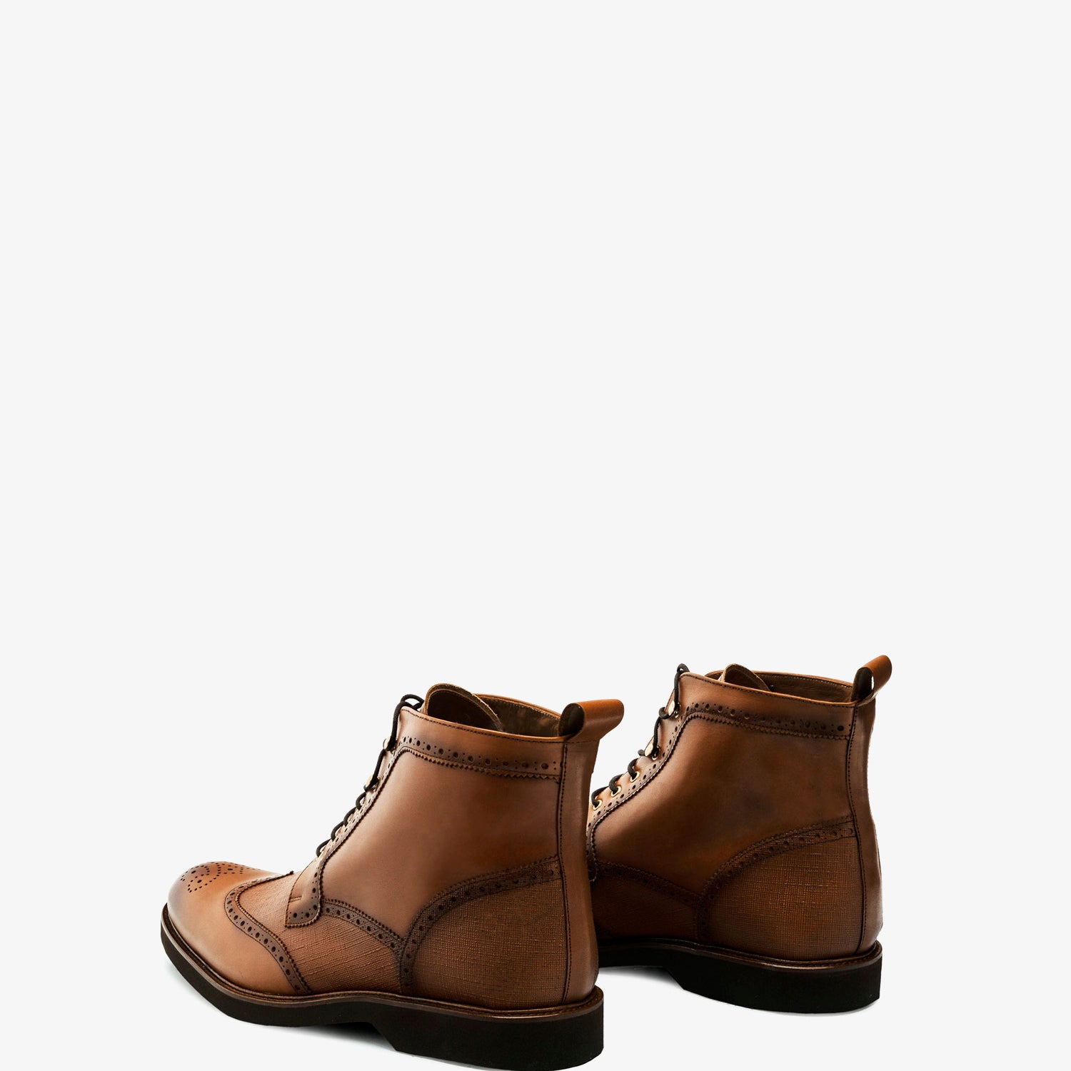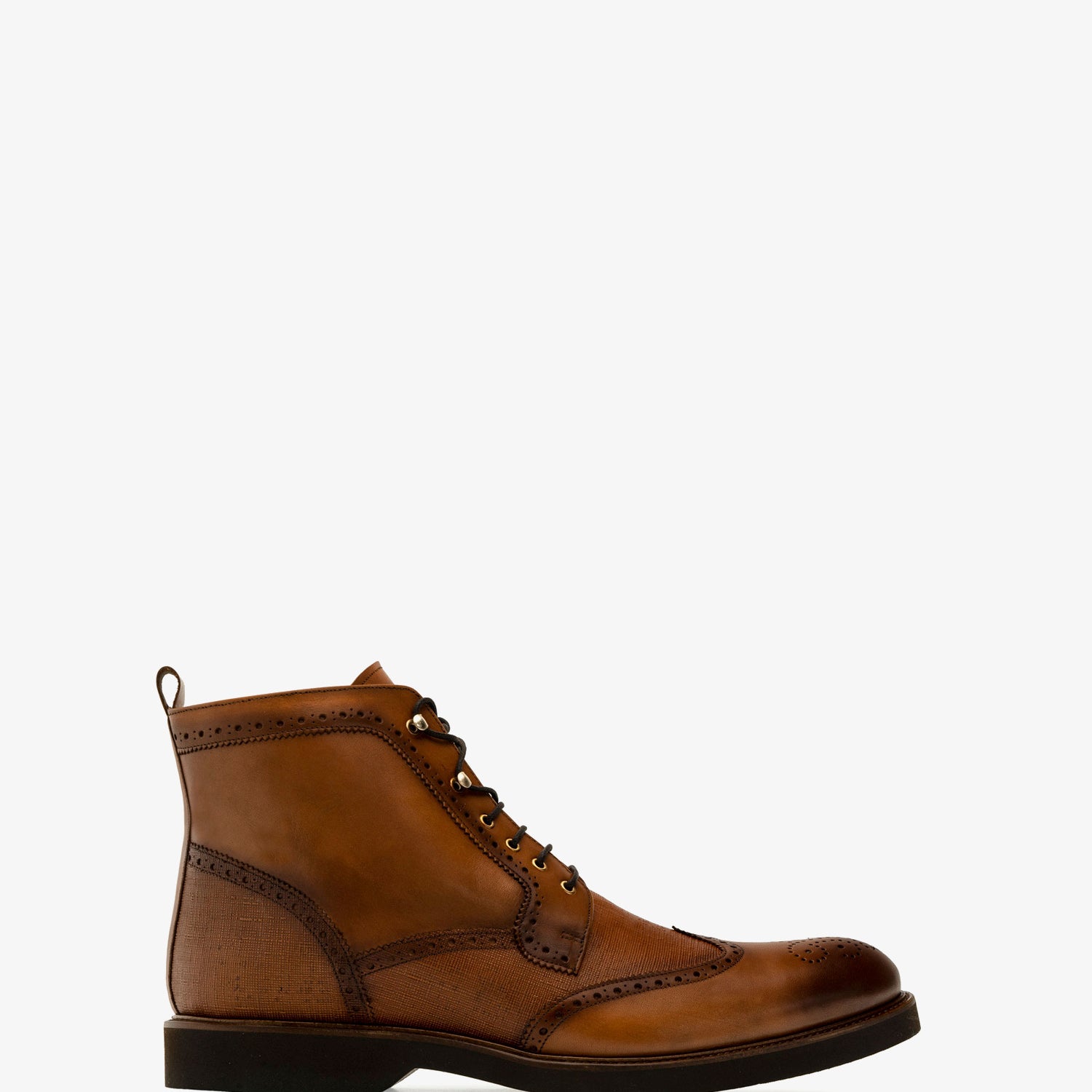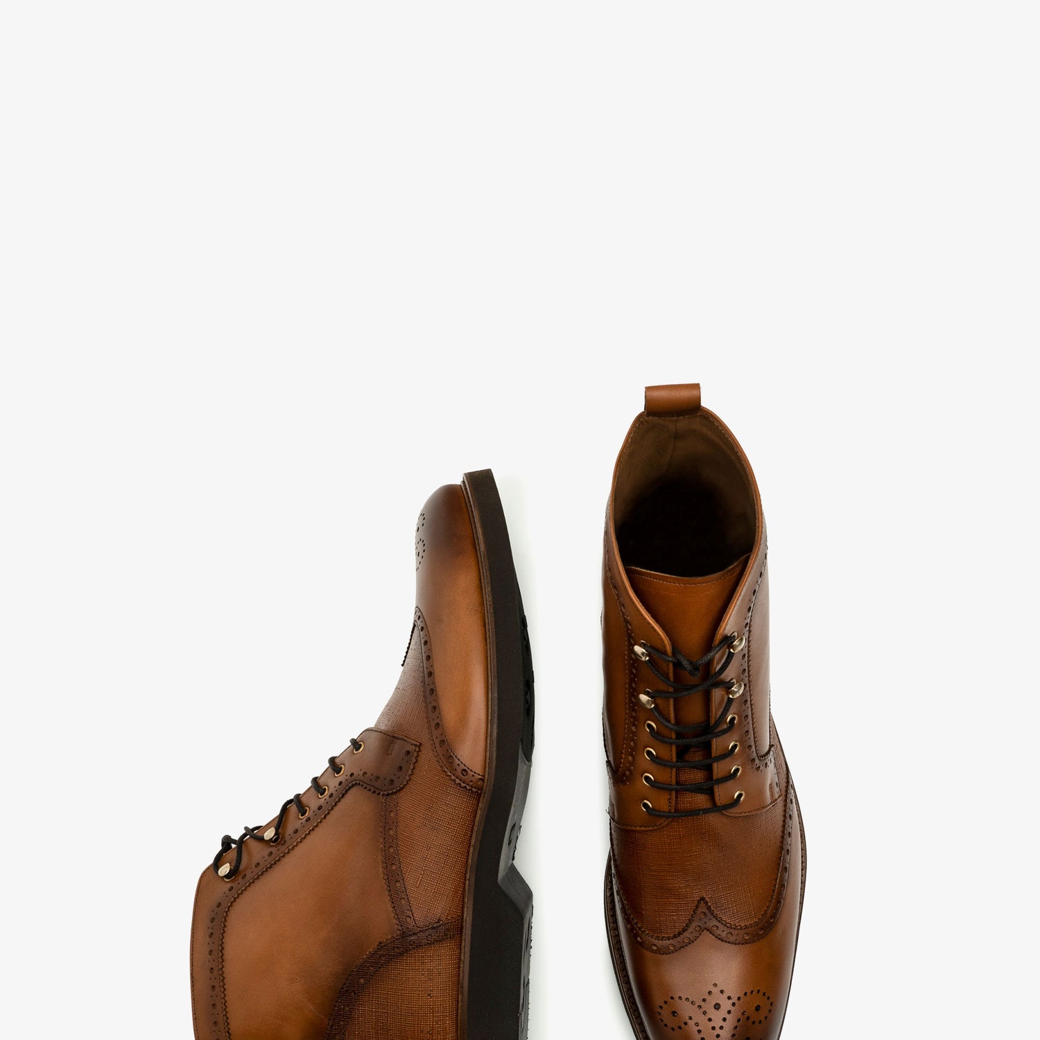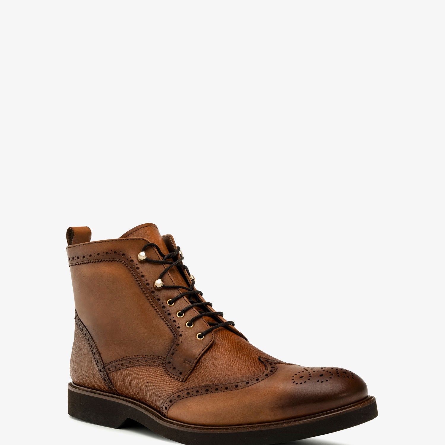 Men`s boot in brown leather. Decorative cutouts and colour matching engravings on the upper and tongue. Pull tab at the rear. Brown lace closure. Inner lining in camel-coloured leather. Rubber sole. Large men`s sizes from 47 to 50 and size 44. Made in Spain