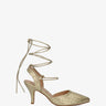 Gold woven faux leather court shoes. Finished in a pointed toe and mid heel. Slingback design and lace-up closure around the ankles. The thin, matching heel is 2,75`` for small sizes from 32 to 35 EU. The thin, matching heel is 3,54`` for small sizes from 42 to 45 EU.