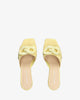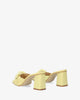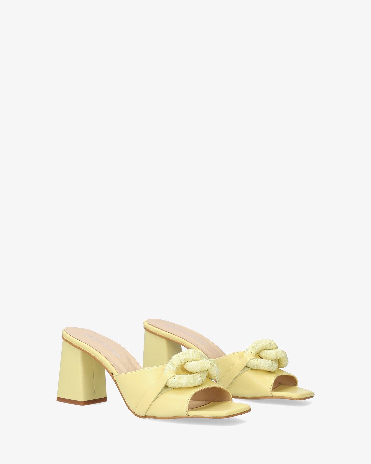 Yellow leather sandals. Wide strap design featuring a maxi chain link detail in matching raffia on the vamp. Finished in a square toe box. The matching square heel is 7,5cm /2,95`` high for small sizes from 32 to 35 EU. The heel is 9cm /3,54`` high for large sizes from 42 to 45 EU. Made in Spain