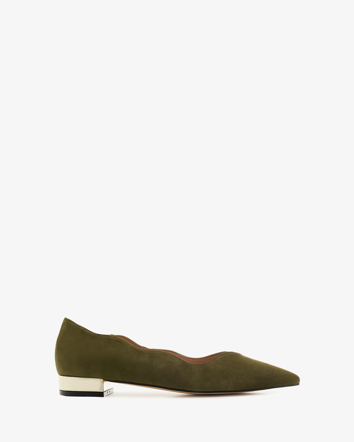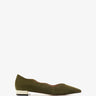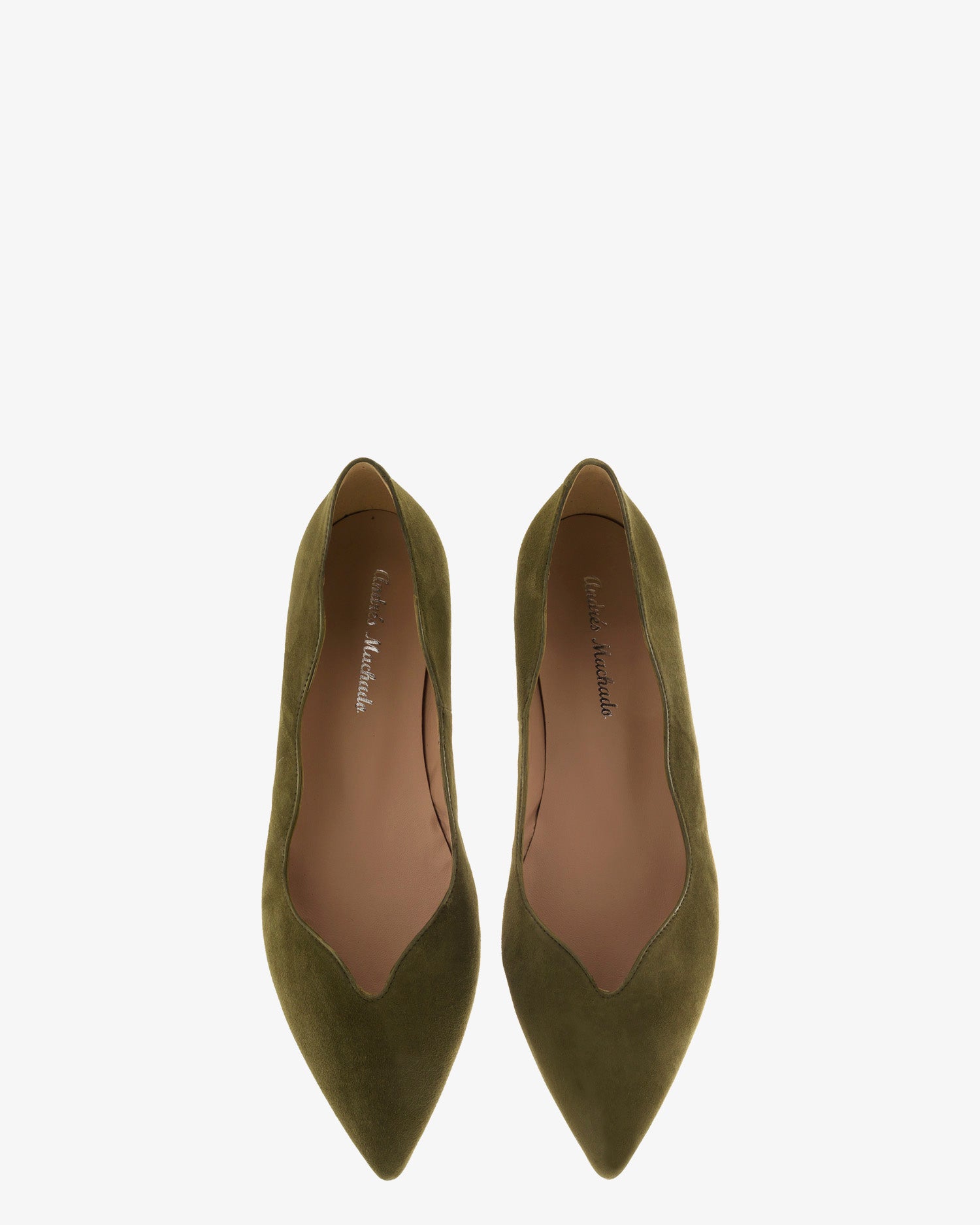 Ballerines en Daim de couleur Vert Olive. Détail de décolleté en forme de V et bord en forme d´ondes. Bout pointu. Talons effet métallisé doré d´hauteur de 2,5 cm pour les Petites Pointures du 32 au 35. Talons d´hauteur de 2,5 cm pour les Grandes Pointures du 42 au 45. Fabriquées en Espagne.