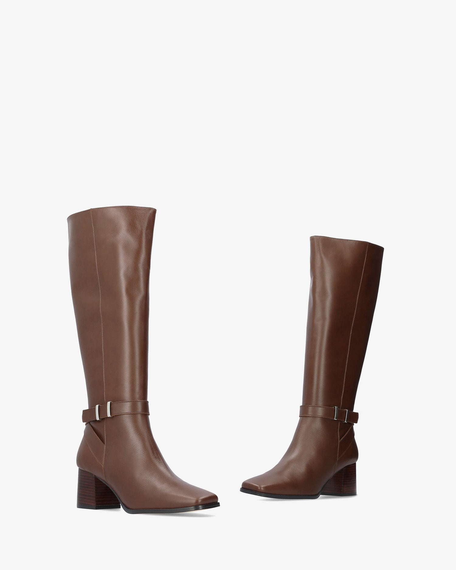 Botte montante en cuir marron, avec fermeture éclair ton sur ton à l`intérieur et boucle décorative à la cheville. Bout carré et doublure intérieure en cuir. Talon large de 5,5 cm pour les petites pointures du 32 au 35, et de 6,5 cm pour les grandes pointures du 43 au 45. Fabriquée en Espagne. Ce modèle peut varier par rapport à la norme, nous vous recommandons de vérifier les cms de la semelle intérieure.