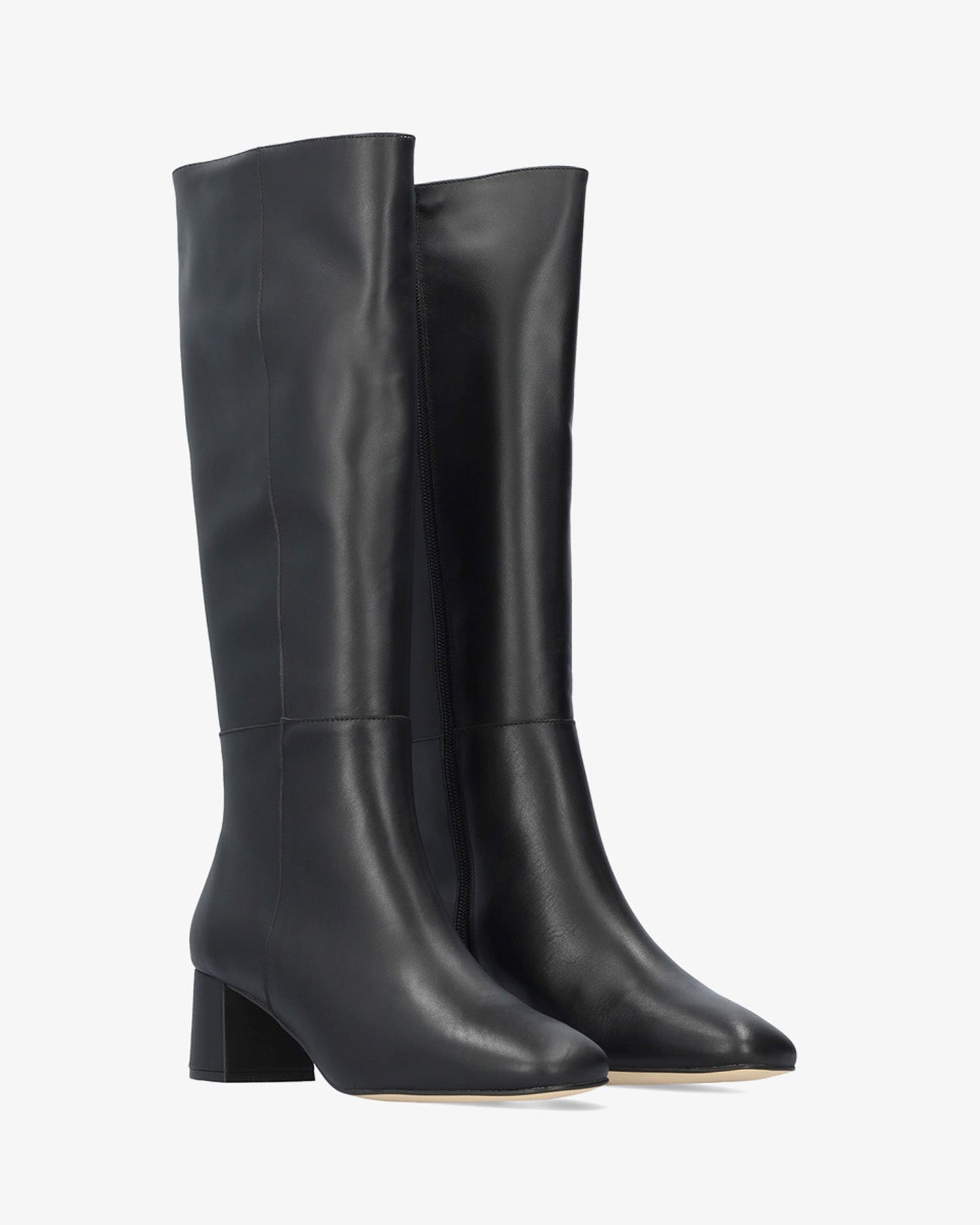 Botte haute en cuir noir, avec surpiqûres décoratives en fil assorti sur la tige. Elle est dotée d`une fermeture éclair de la même couleur à l`intérieur de la tige. Bout rond et doublure en cuir beige. Talon large doublé ton sur ton, hauteur 5 cm pour les petites pointures du 33 au 35, hauteur 5,5 cm pour les grandes pointures du 43 au 45. Fabriquée en Espagne. Ce modèle peut varier par rapport à la norme, nous vous recommandons de vérifier les cms de la semelle intérieure.