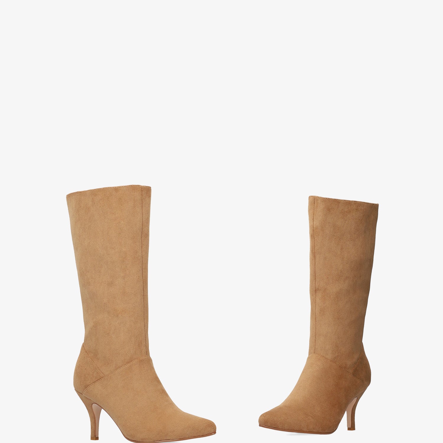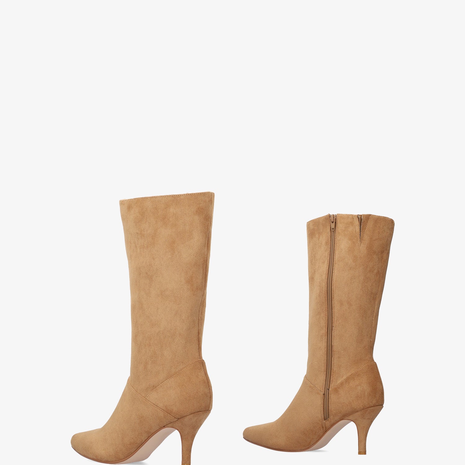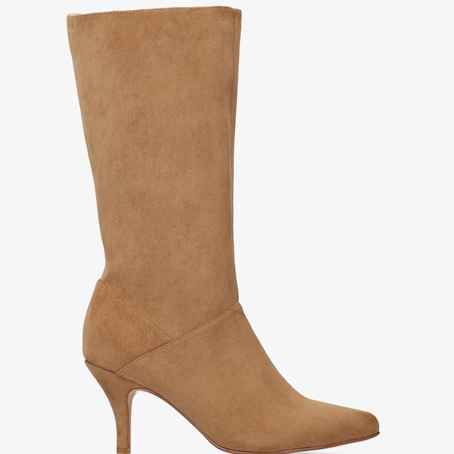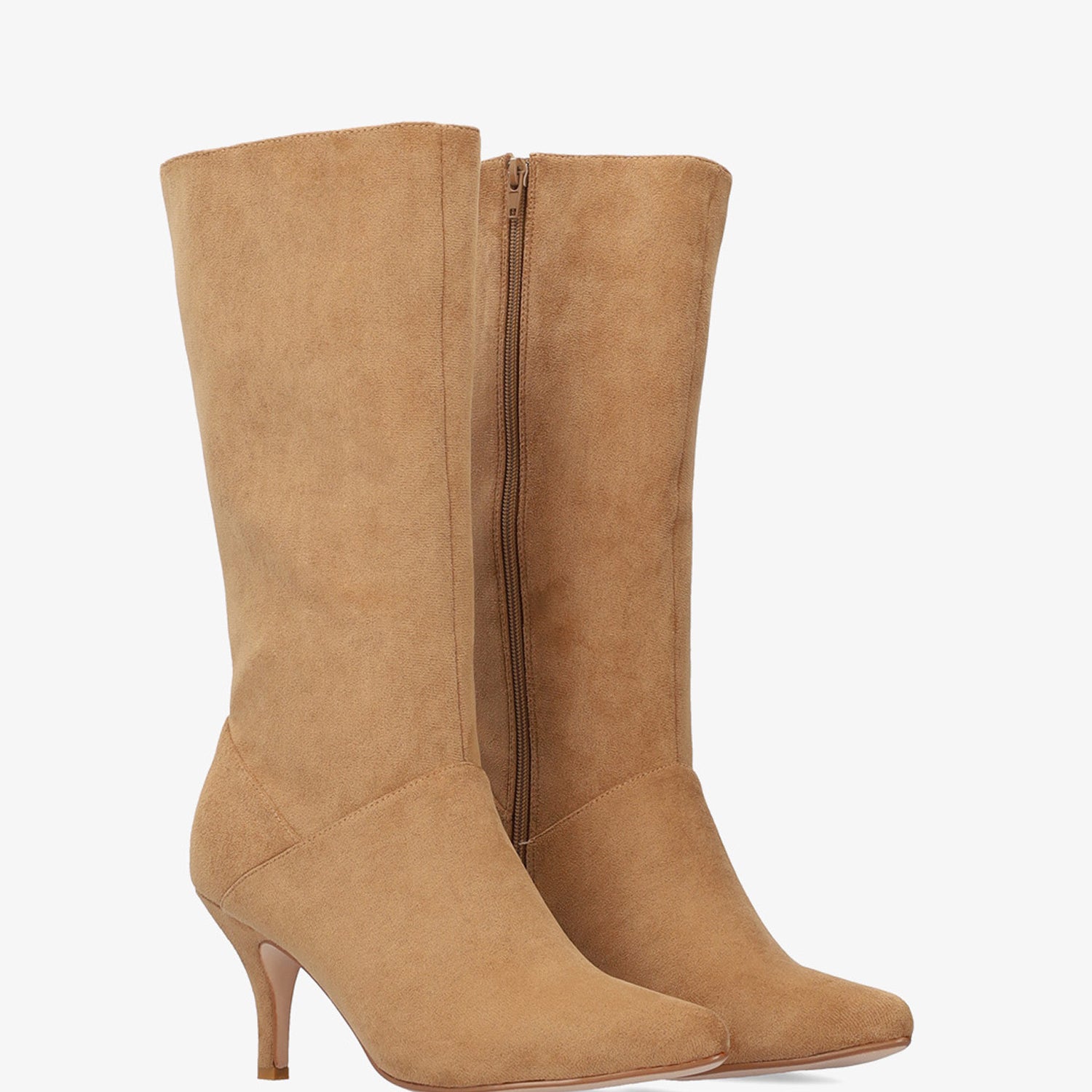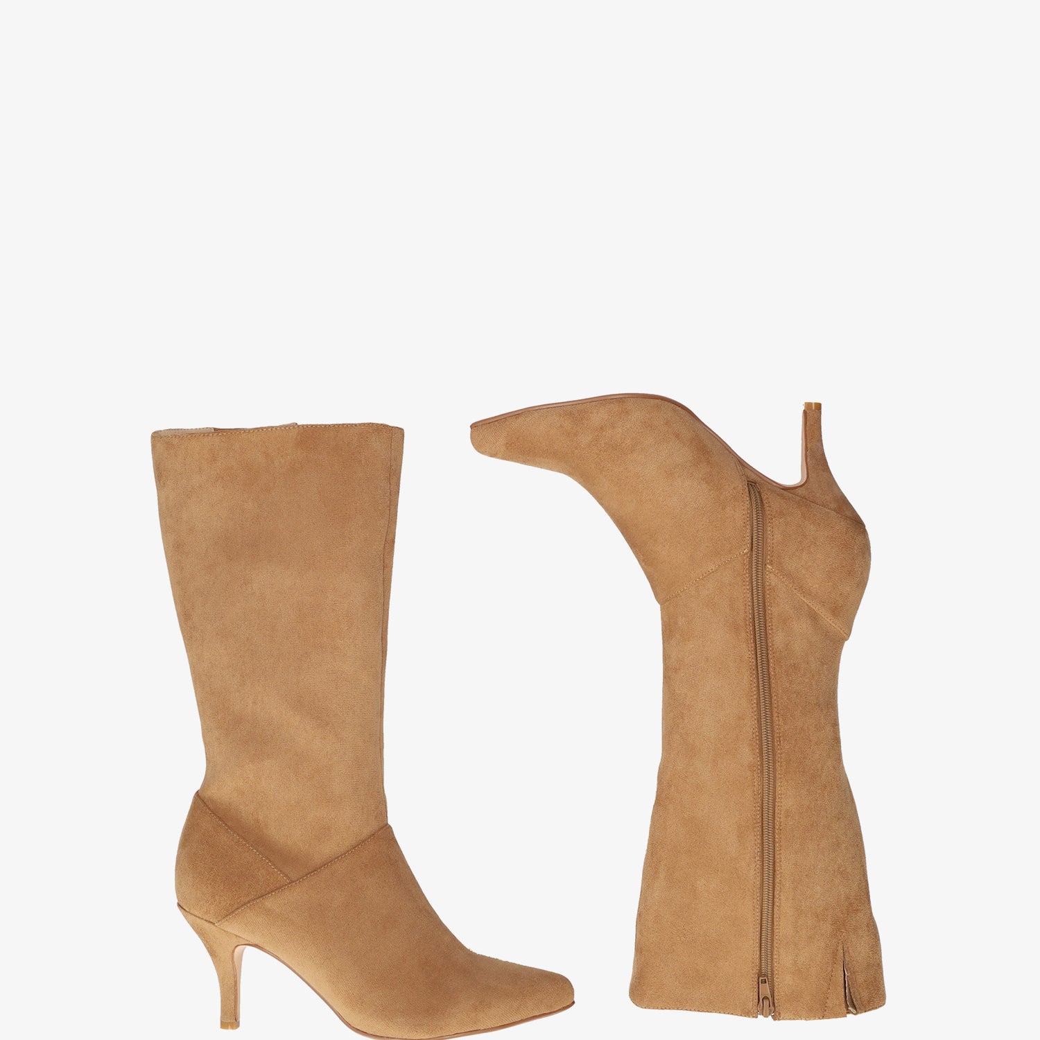 Botte en suédine de couleur marron. Fermeture zippée latérale et élastique ton sur ton. Coutures décoratives sur le côté extérieur du cou-de-pied. Bout en pointe fine. Talon fin doublé ton sur ton de 6,5 cm pour les petites pointures du 32 au 35 et de 8,5 cm pour les grandes pointures du 42 au 45.