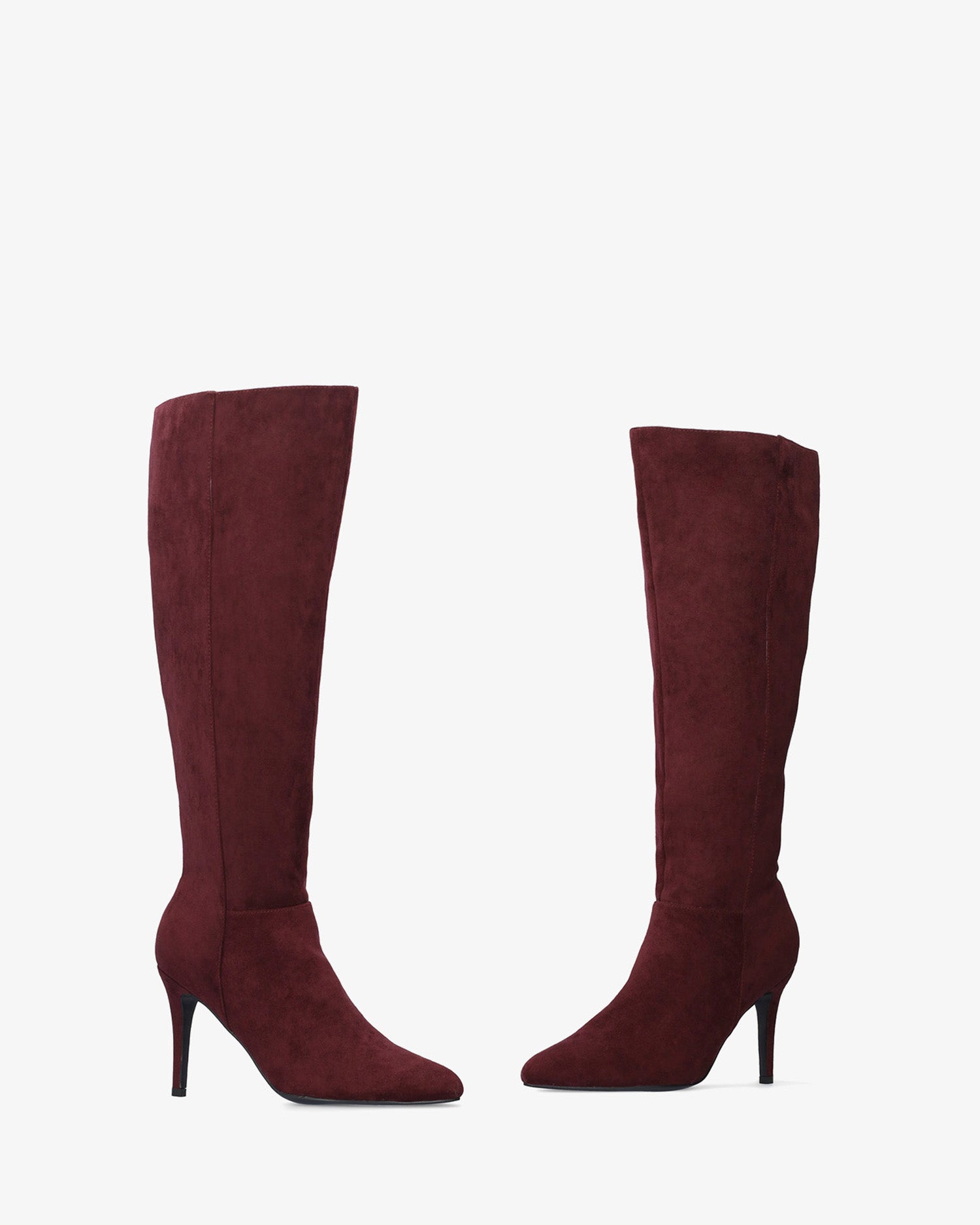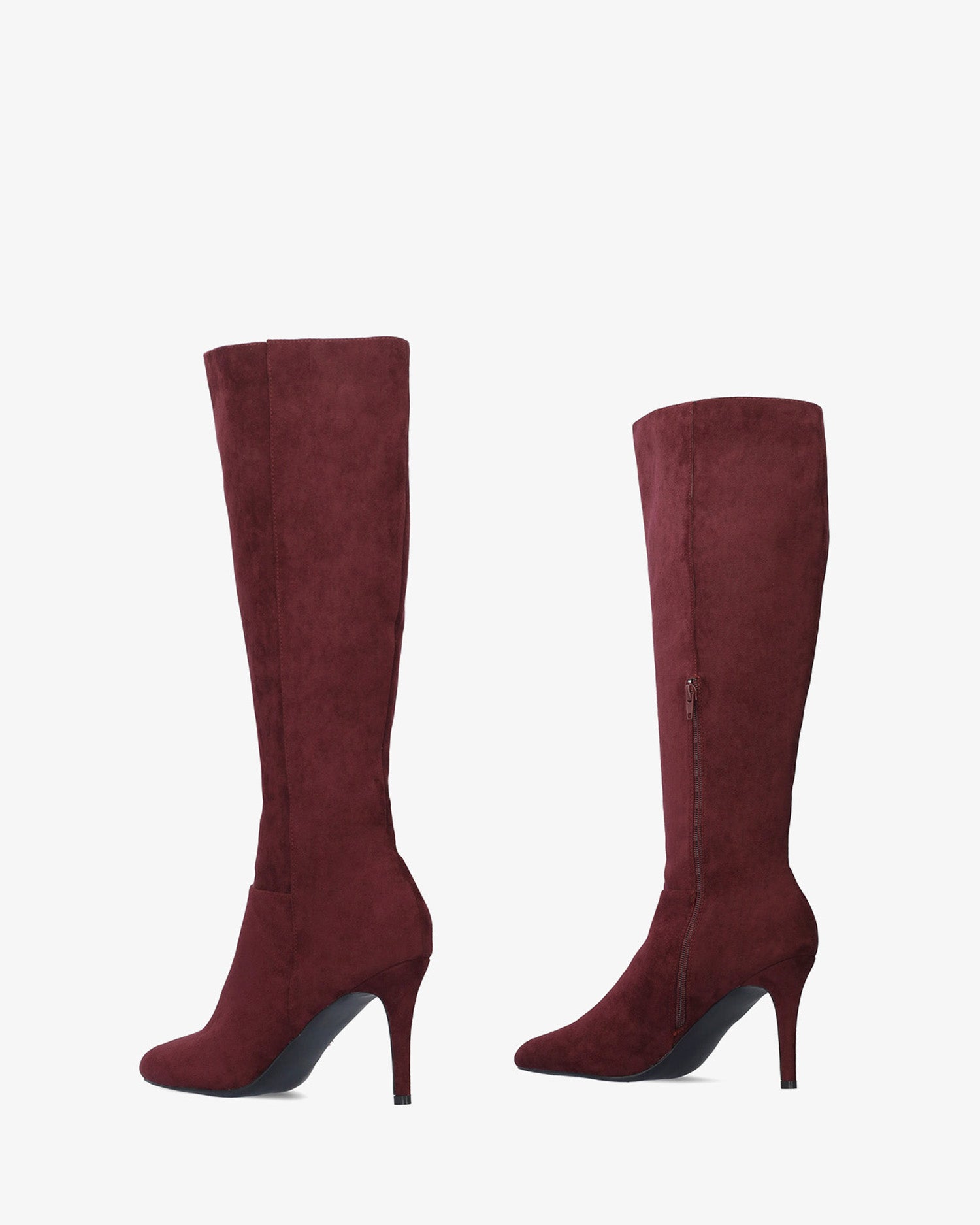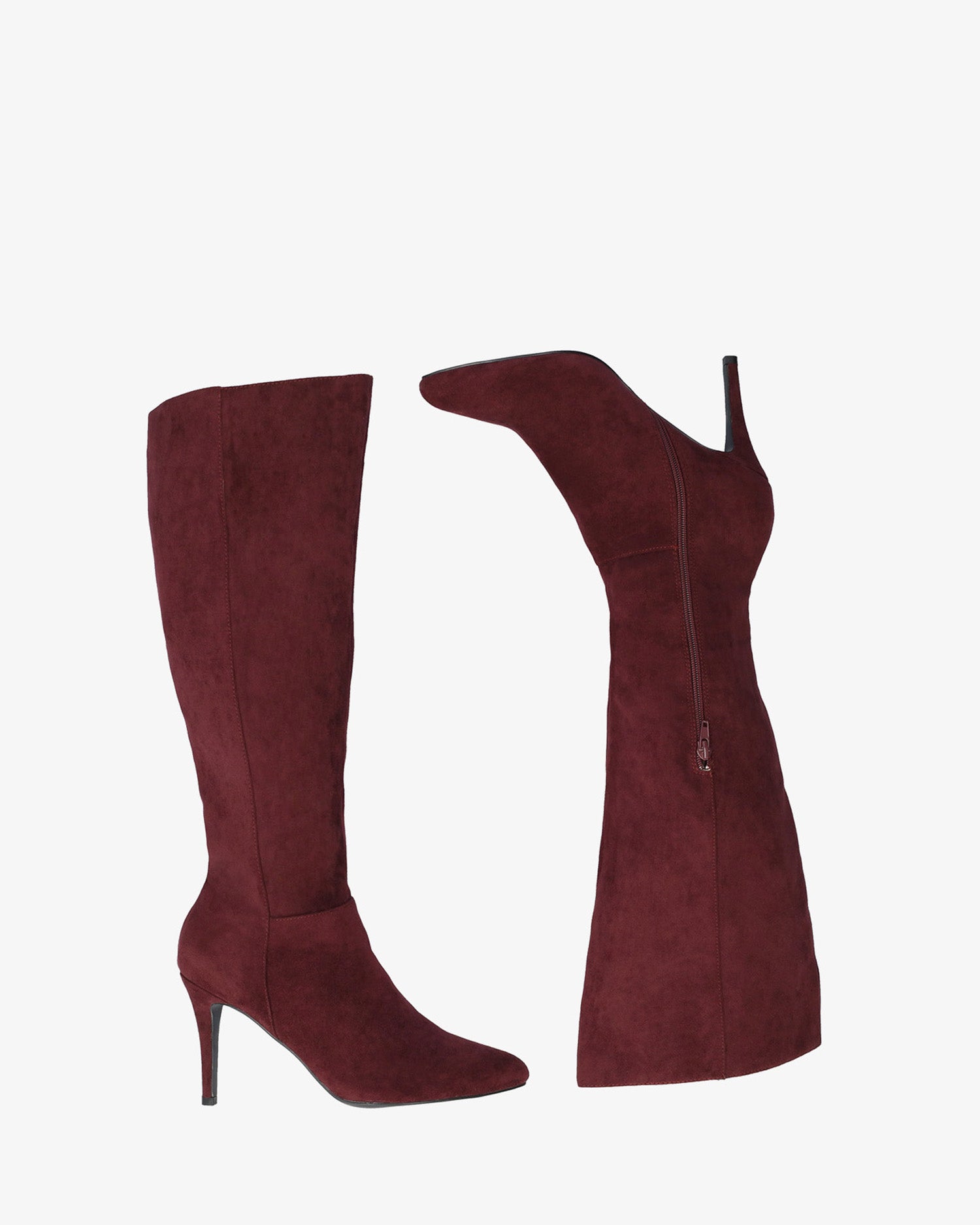 Botte haute en suédine bordeaux. Fermeture zippée à mi-hauteur de la tige. Bout en pointe fine. Talon fin du même ton de 7,5 cm pour les petites pointures du 32 au 35 et de 10 cm pour les grandes pointures du 42 au 45.