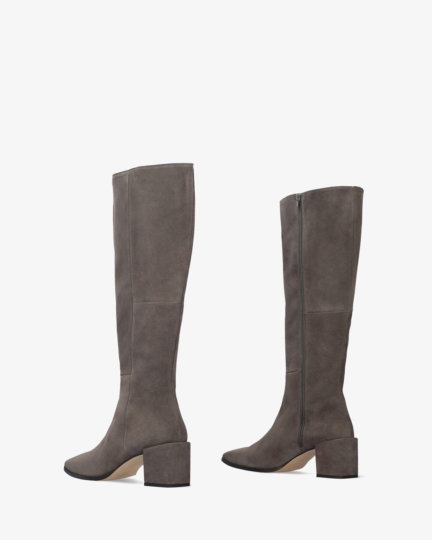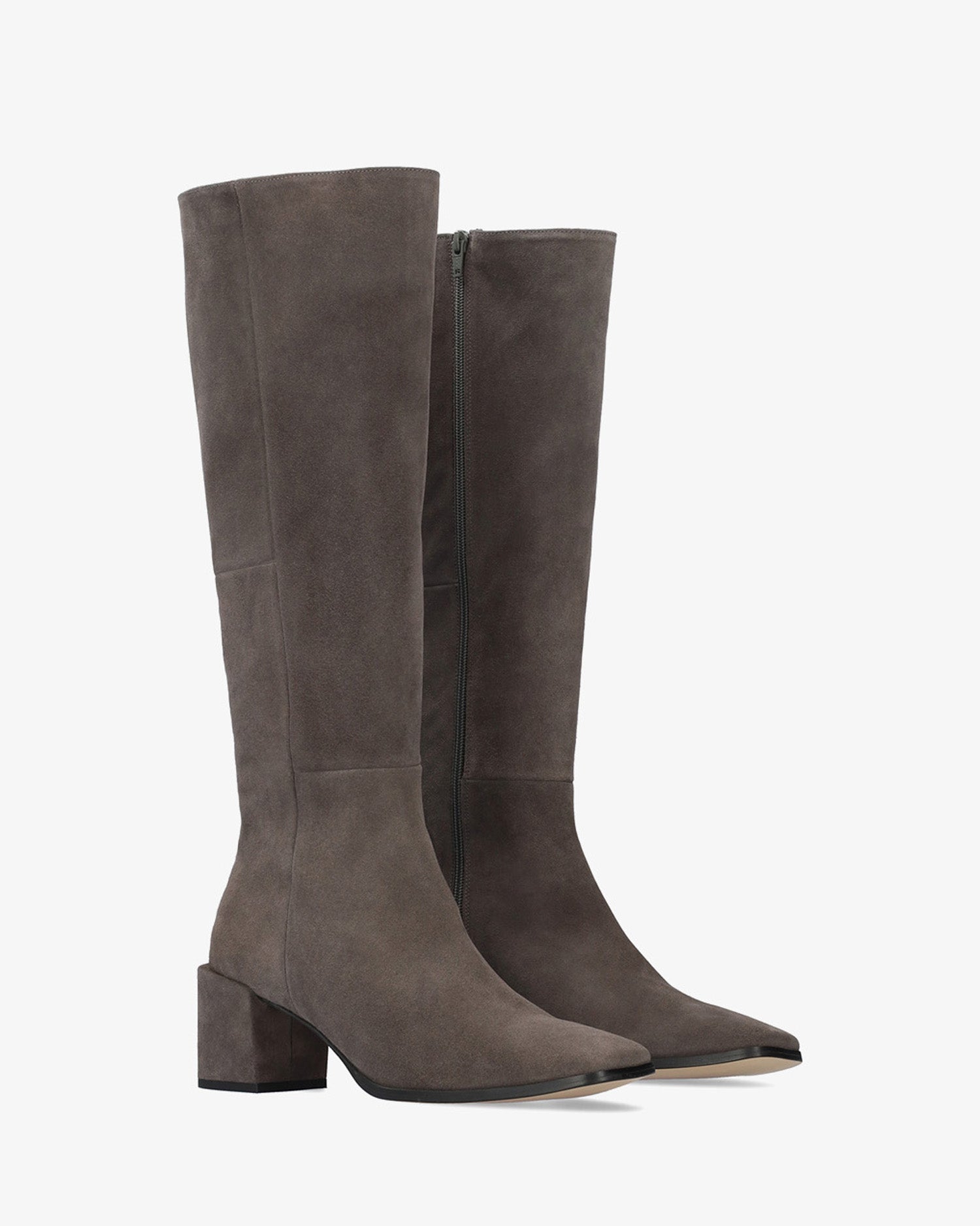 Botte montante en croute de cuir Gris. Élastique assorti à l`extérieur et fermeture éclair assortie à l`intérieur de la tige. Finition bout carré. Doublure intérieure en cuir beige. Talon haut large doublé assorti de 6 cm de haut pour les petites pointures du 32 au 35. Talon haut de 7 cm pour les grandes pointures du 42 au 45. Fabriqué en Espagne. Ce modèle peut varier par rapport à la norme, nous vous recommandons de vérifier les cms de la semelle intérieure.