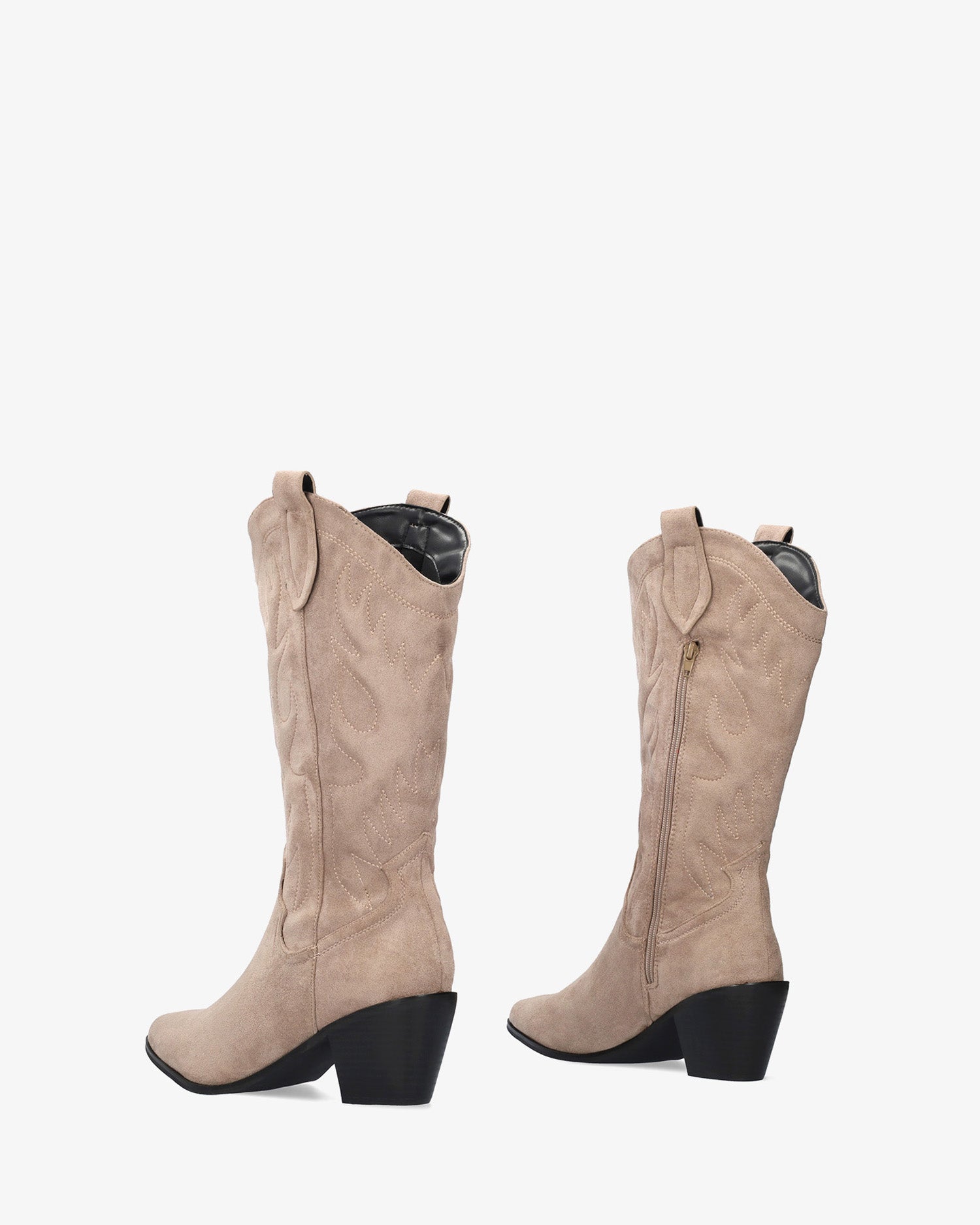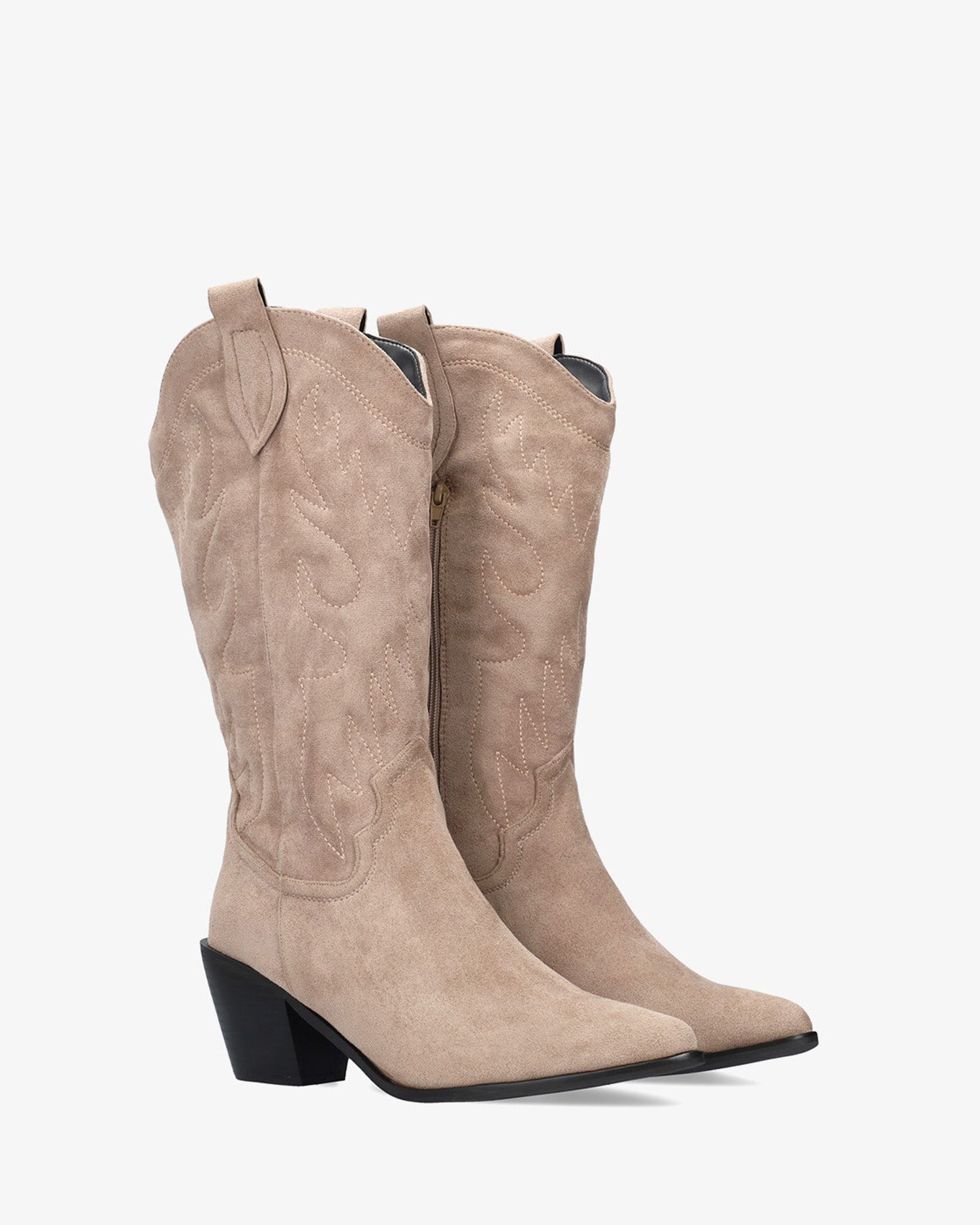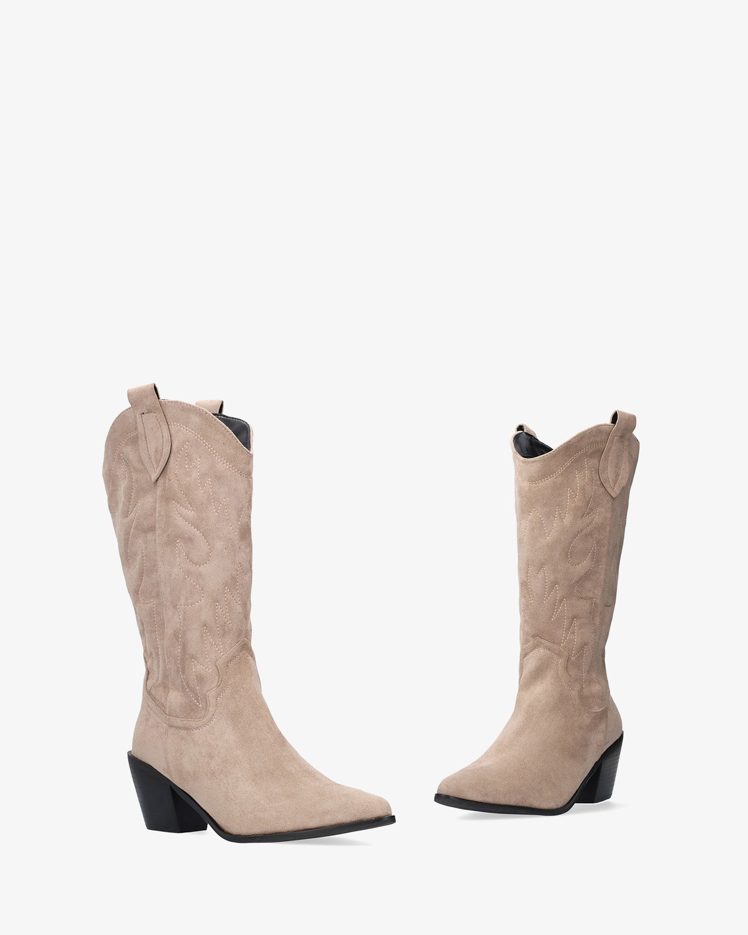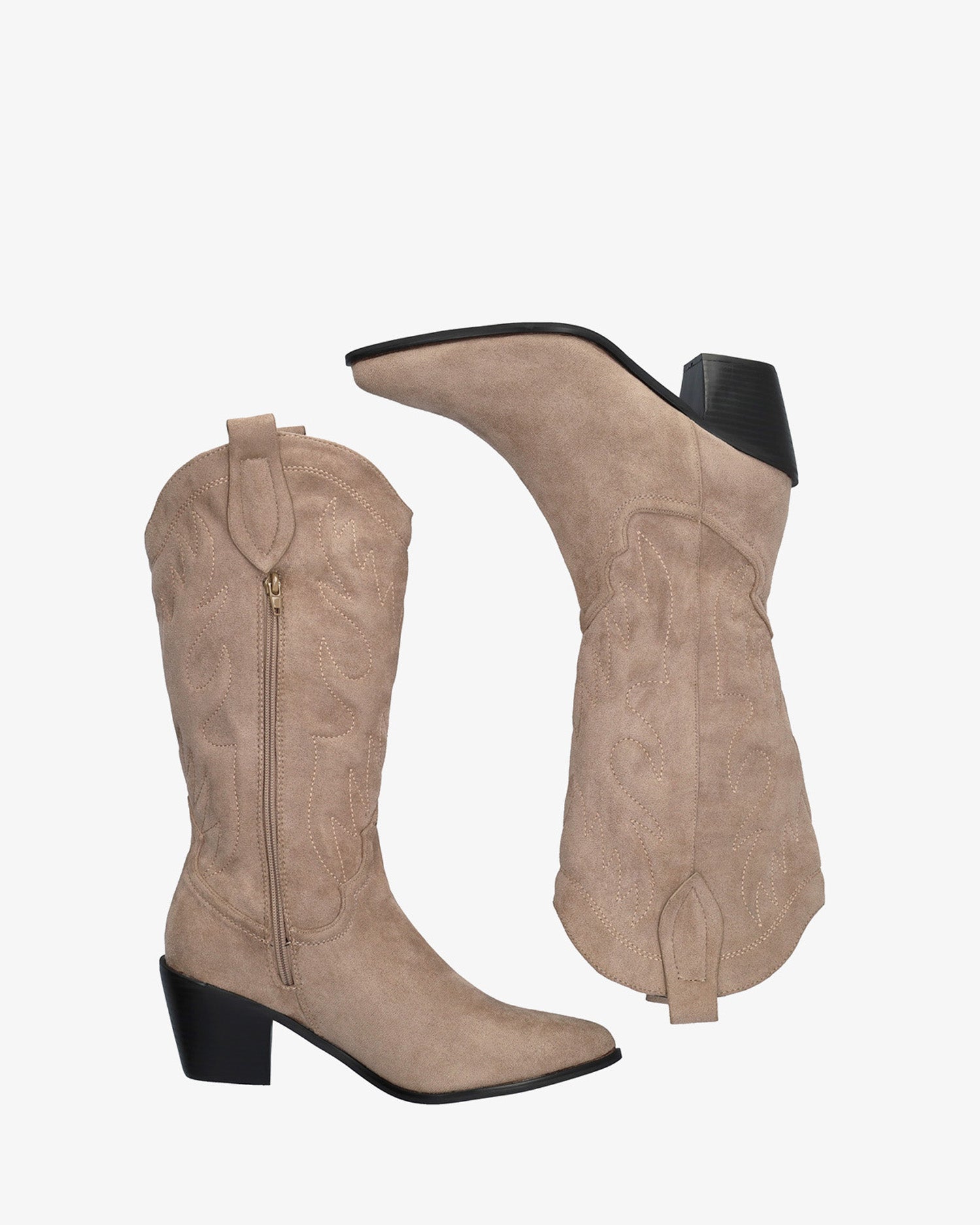Bottes cowboy à bout pointu avec surpiqûres décoratives dans un fil ton sur ton. Talon effet bois de 6 cm pour les petites pointures (32 à 34) et de 7,5 cm pour les grandes pointures (42 à 46).