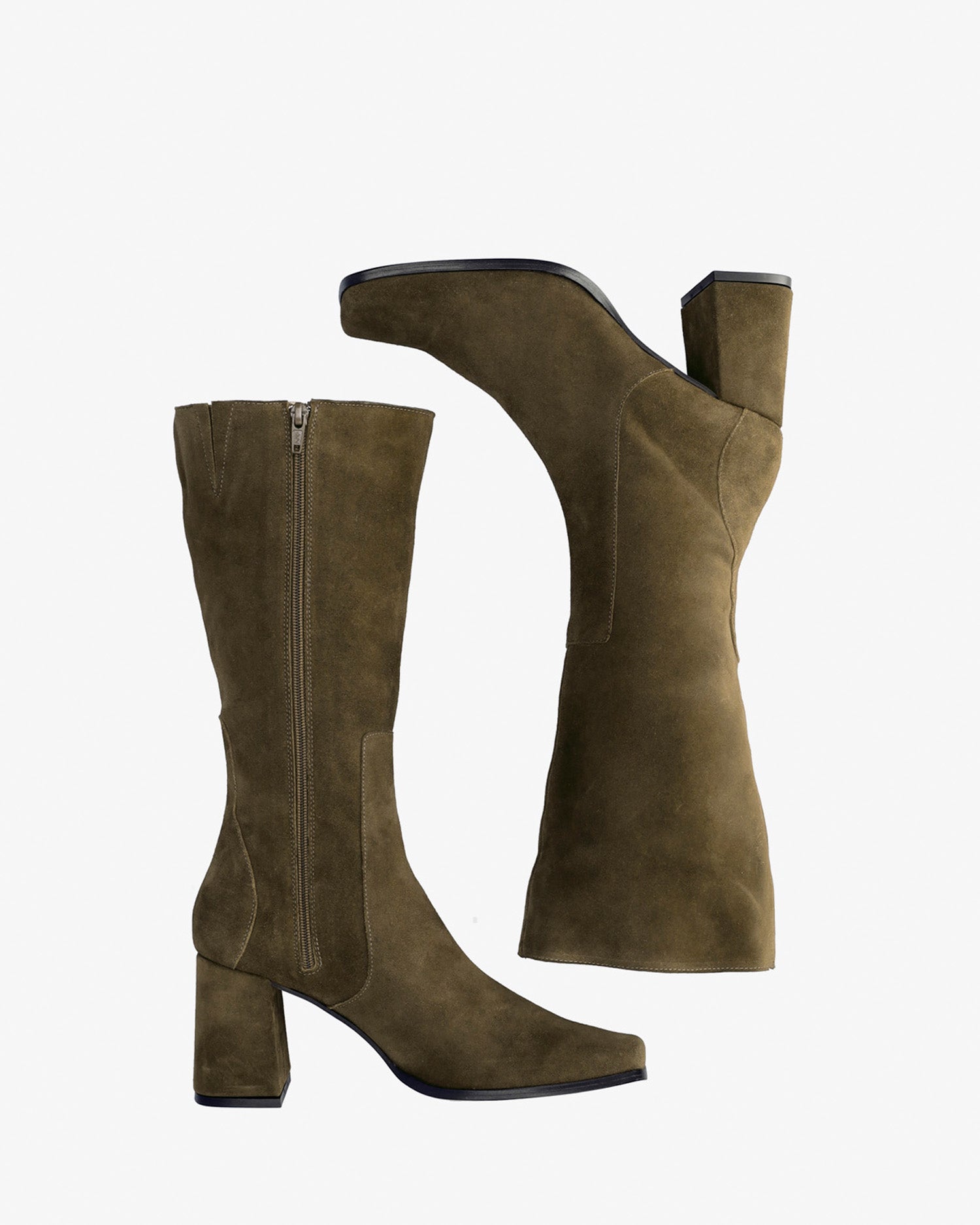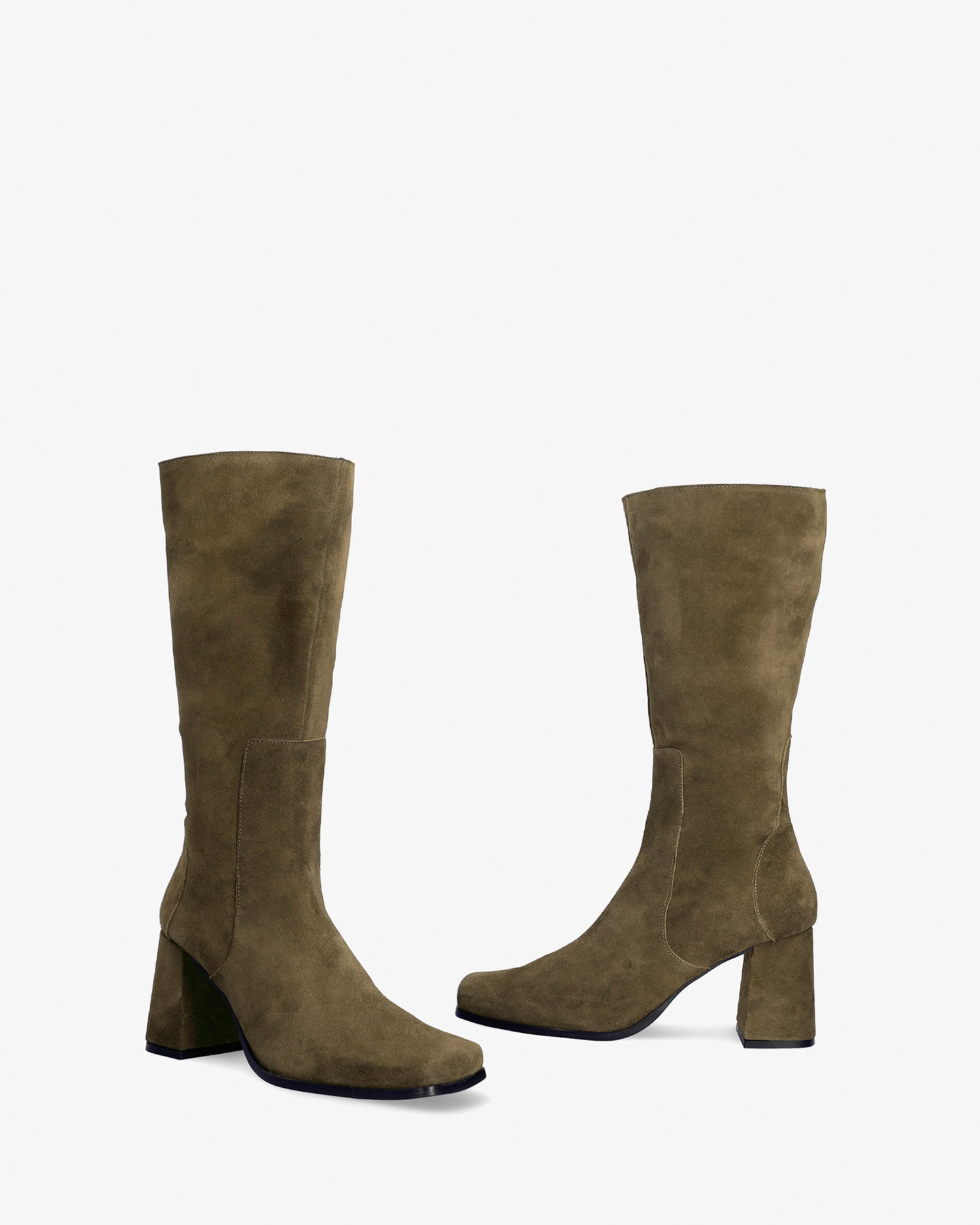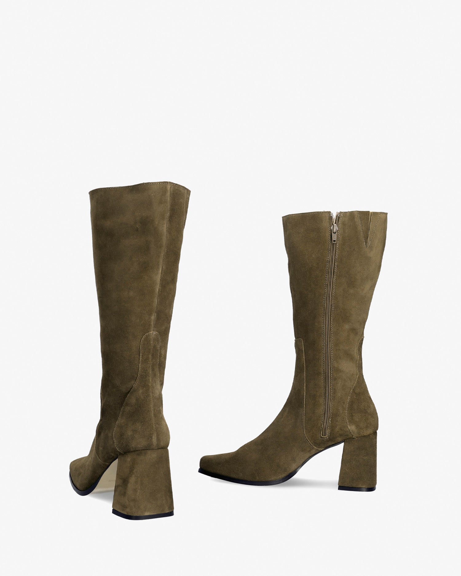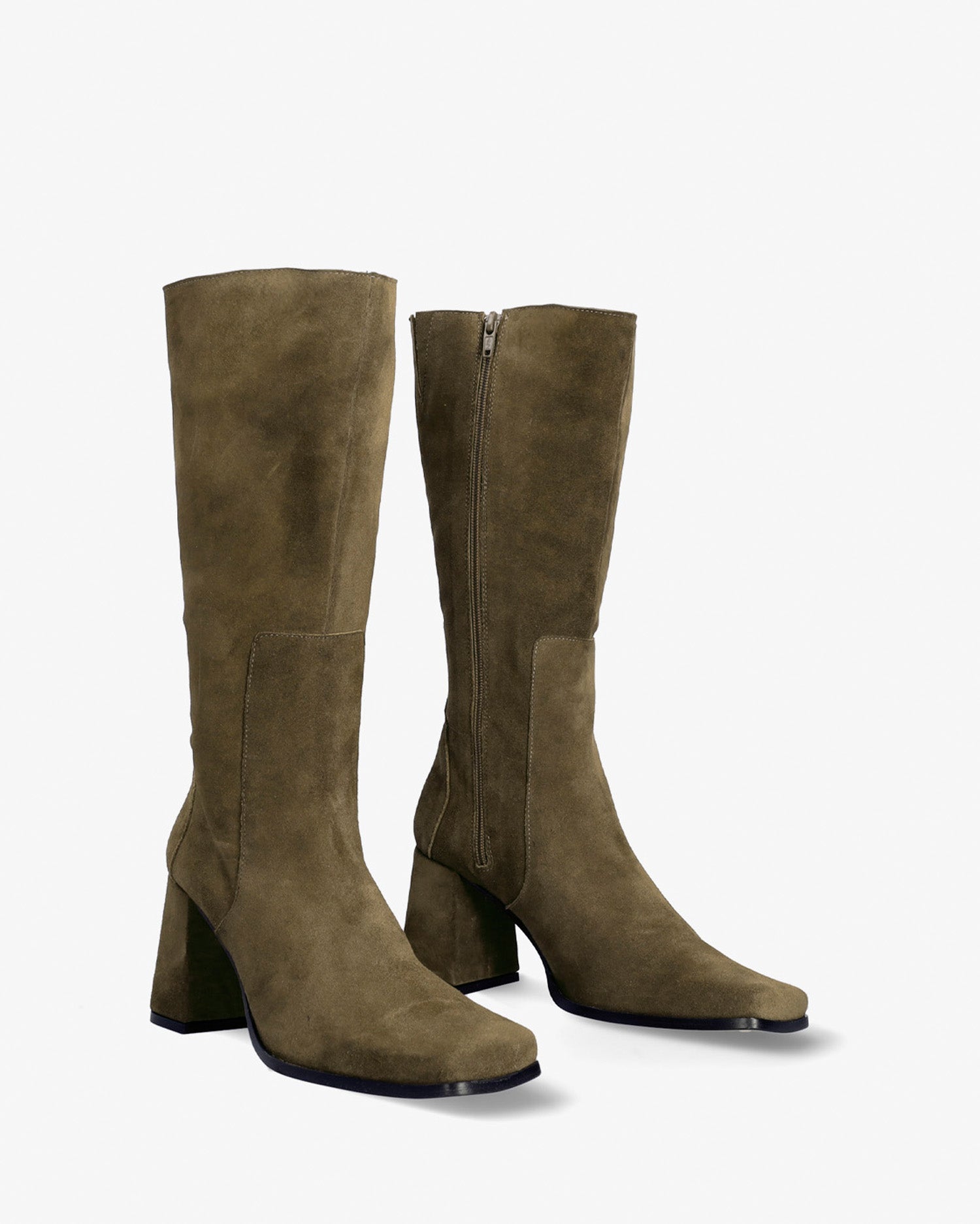 Bottes cuissardes en cuir de couleur kaki. Surpiqûres décoratives en fil au même ton sur la tige. Fermeture éclair au même ton sur le côté intérieur de la tige. Bout carré. Doublure en cuir beige. Talons larges au même ton de 7,5 cm pour les petites pointures du 32 au 35. Talons de 8 cm pour les moyennes pointures du 36 au 41. Talon de 8,5 cm pour les grandes pointures du 42 au 45. Fabrication espagnole.