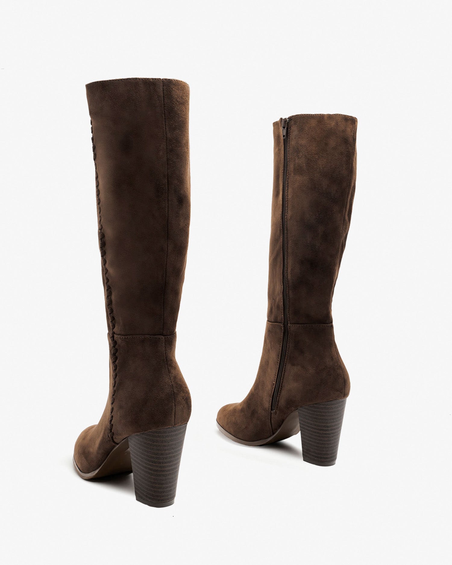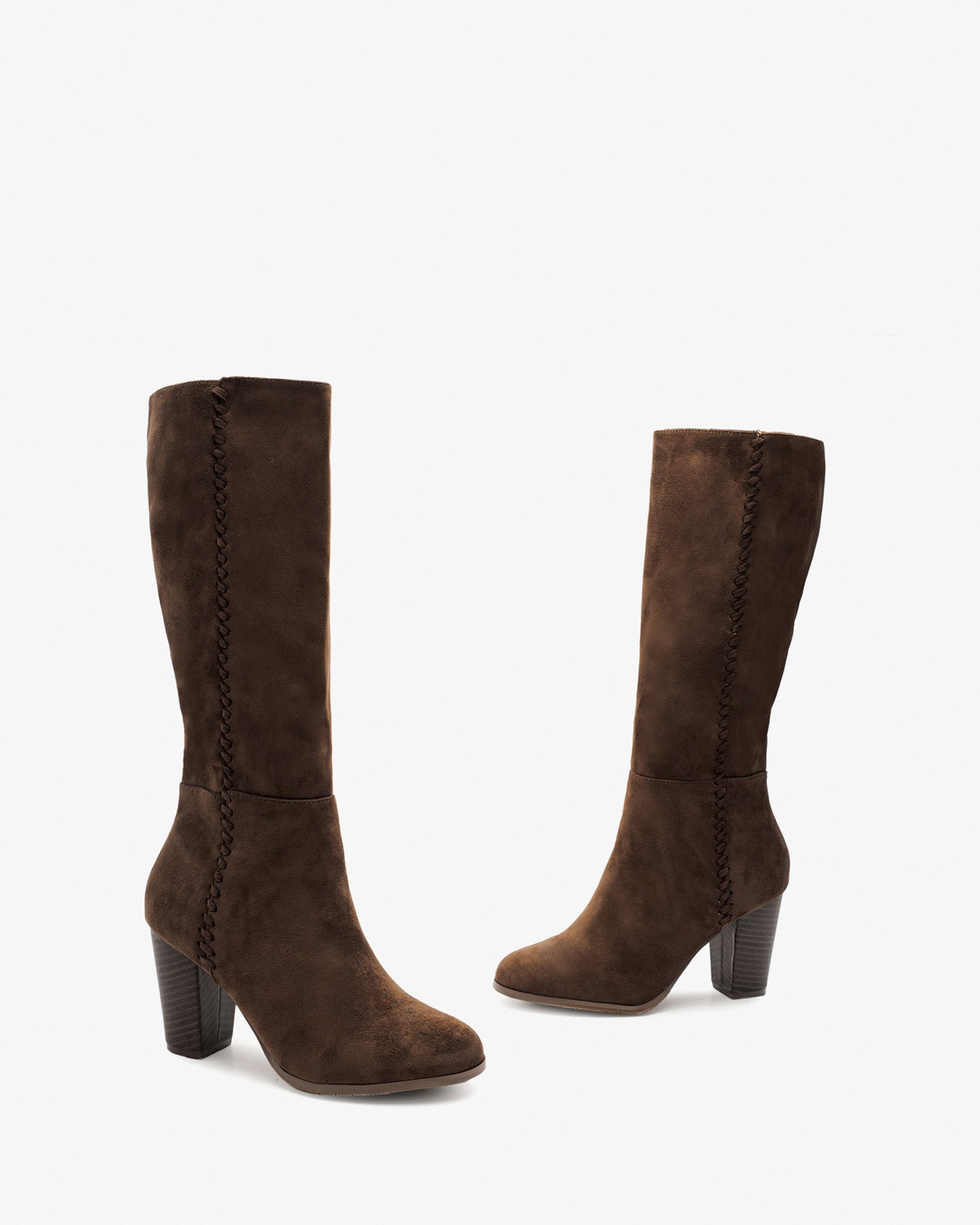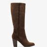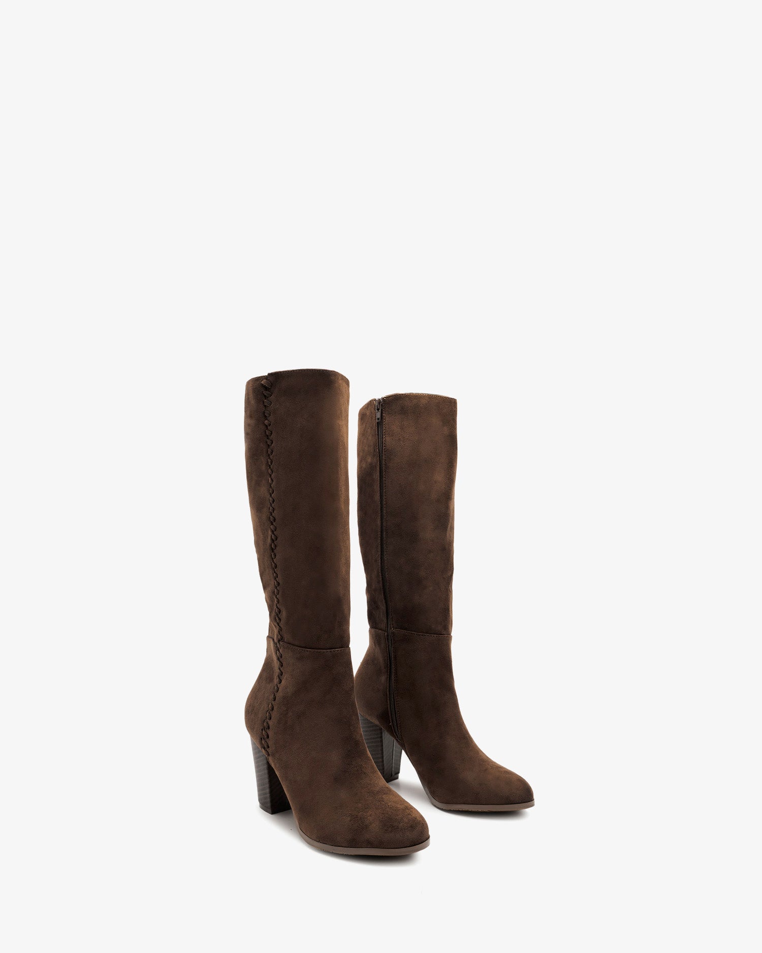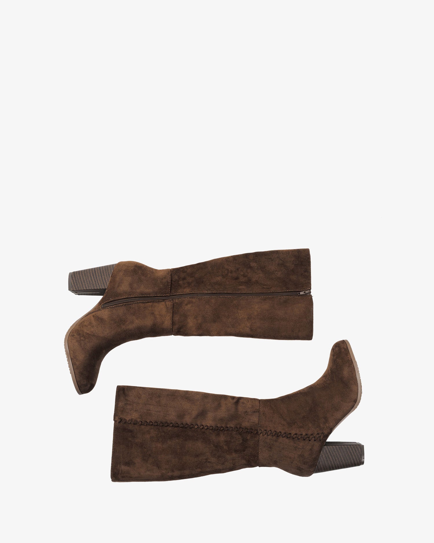 Bottes en suédine de couleur Marron. Détail de décoration cousue sur le côté latéral sur la partie extérieur. Fermeture éclair au même ton sur la partie interne. Talons larges effet bois de 7,5 cm de haut pour les petites pointures du 32 au 35. Talons de 9 cm de haut pour les grandes pointures du 42 au 45.