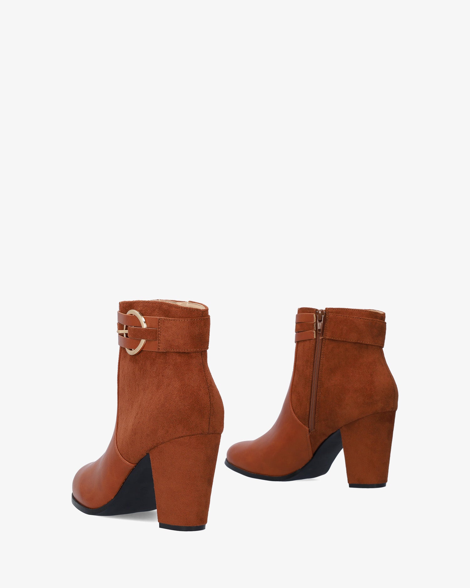 Bottine combinée en marron. Partie avant en simili cuir et partie arrière en suédine. Lanières en suédine et en simili cuir du même ton autour de la tige et boucle dorée sur le dessus. Fermeture éclair latérale du même ton. Bout en amande.Talon large doublé en suédine de 7,5 cm pour les petites pointures du 32 au 35 et de 9 cm pour les grandes pointures du 42 au 45.
