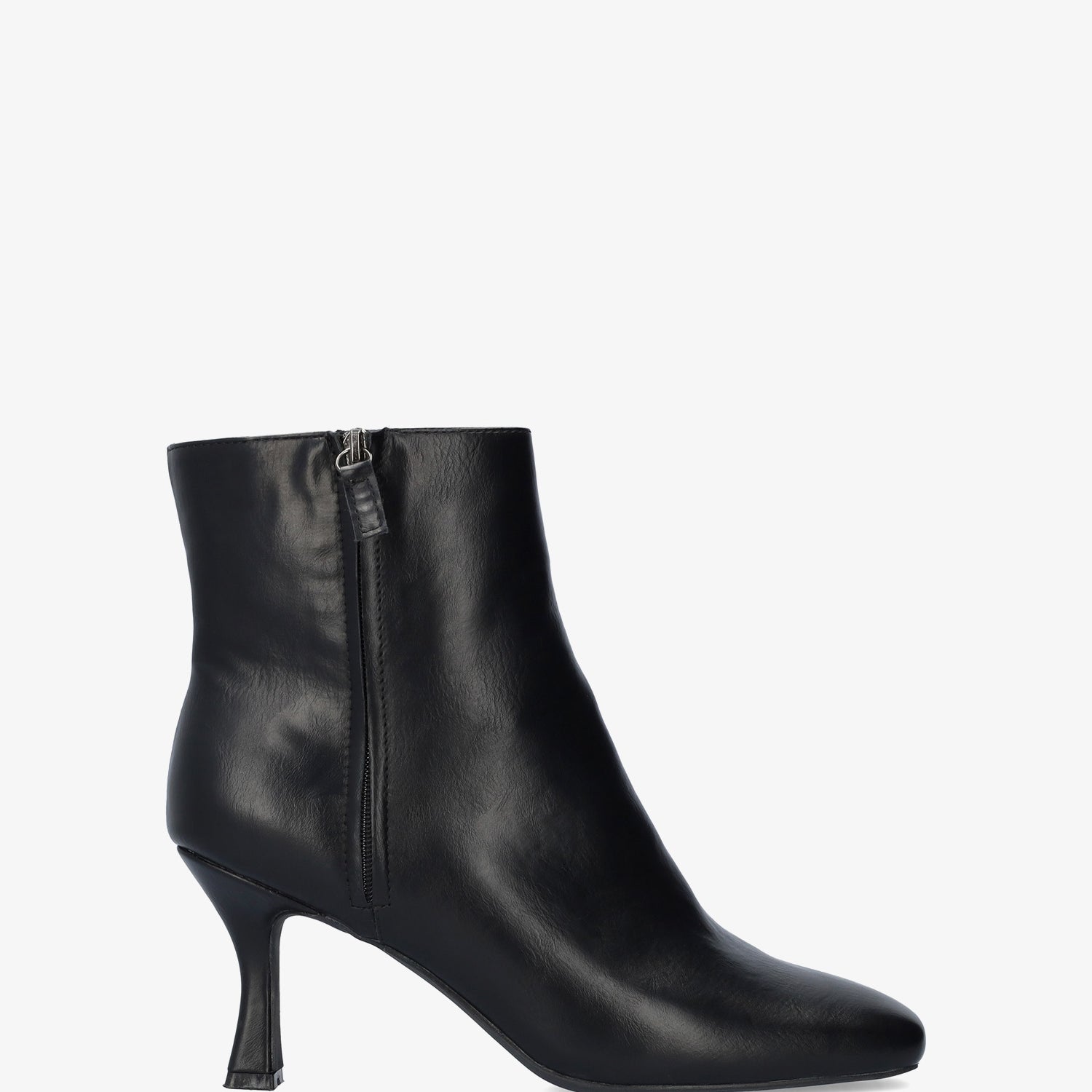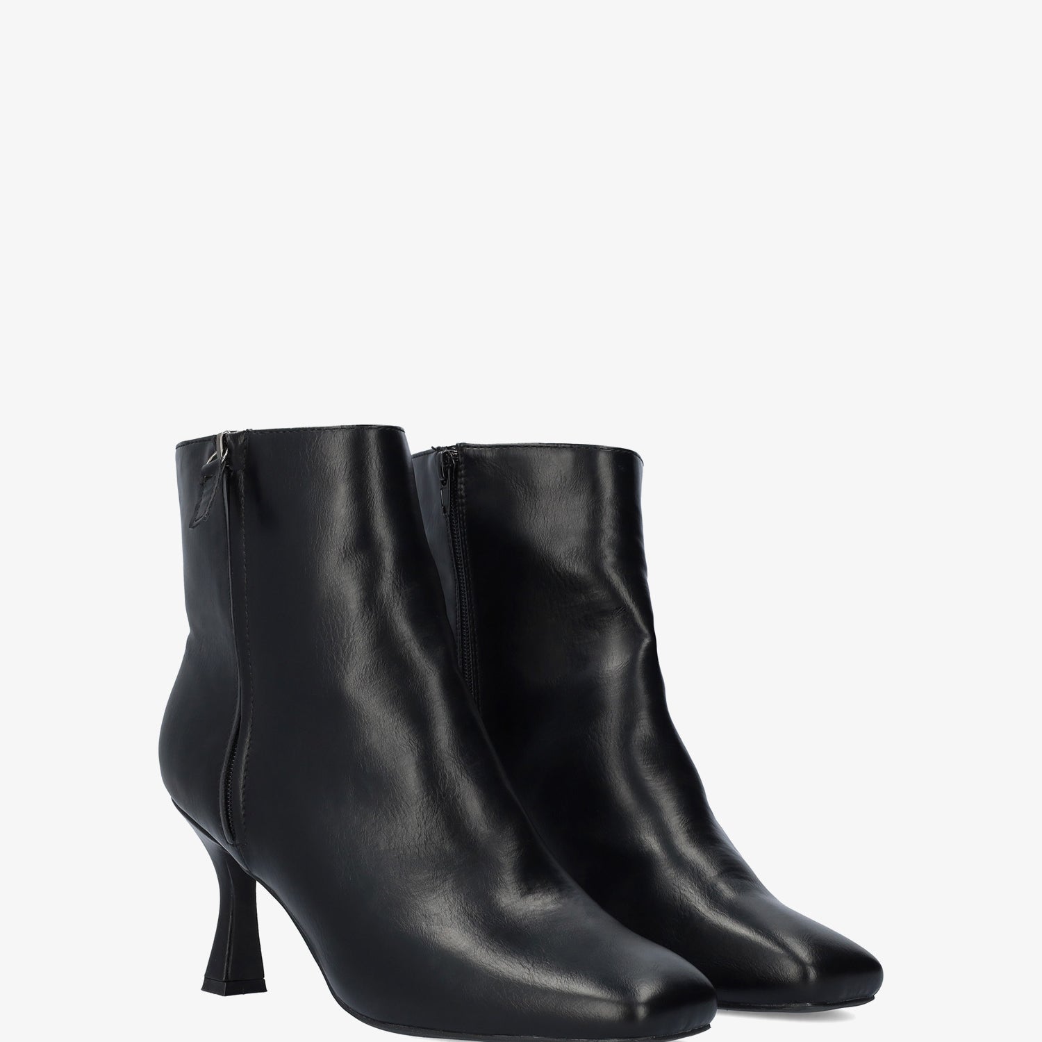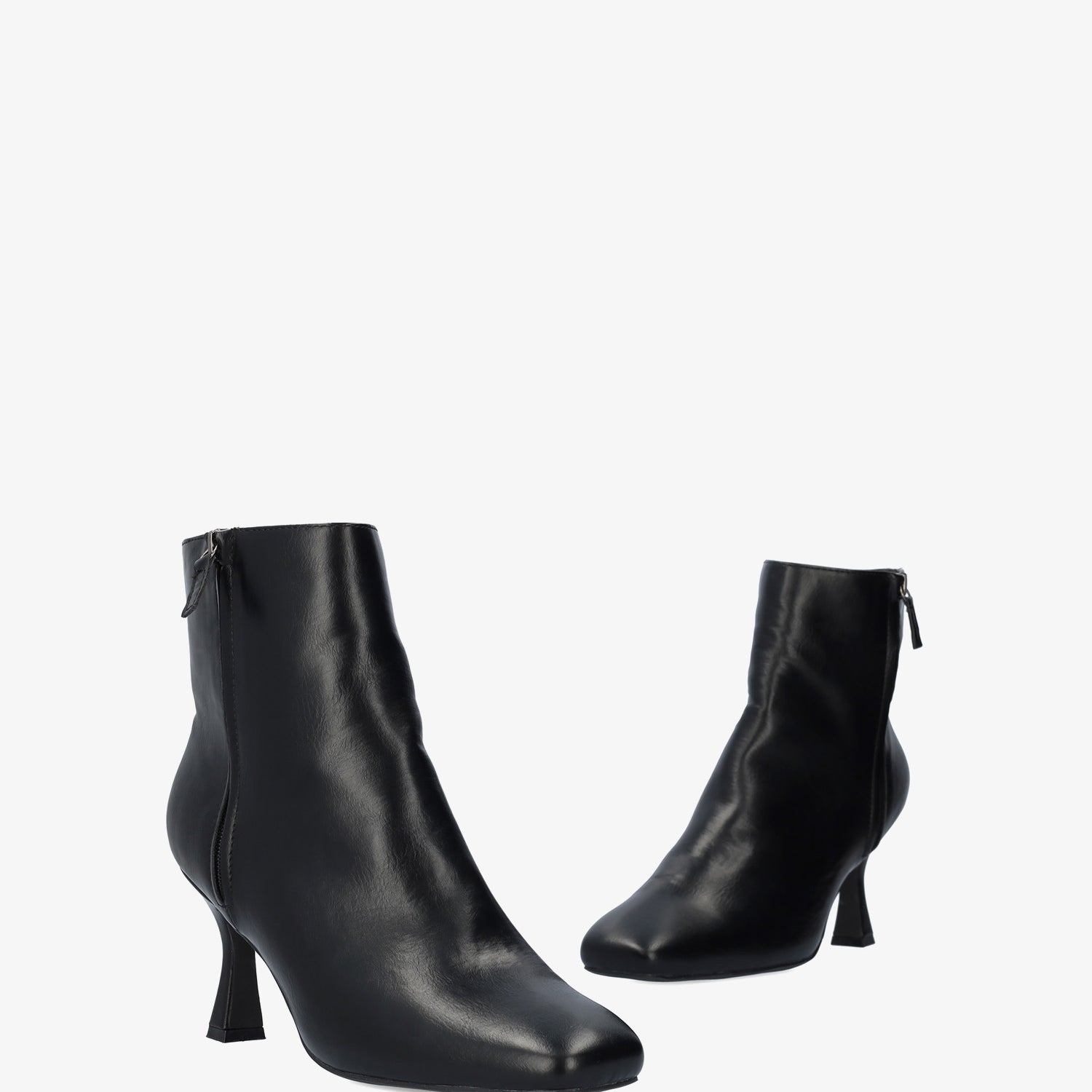 Bottine à talon Kitten Heel simili cuir noire. Fermeture éclair latérale du même ton. Bout carré. Talon doublé de 8,3 cm pour les petites pointures du 32 au 35 et de 8,7 cm pour les grandes pointures du 42 au 45.