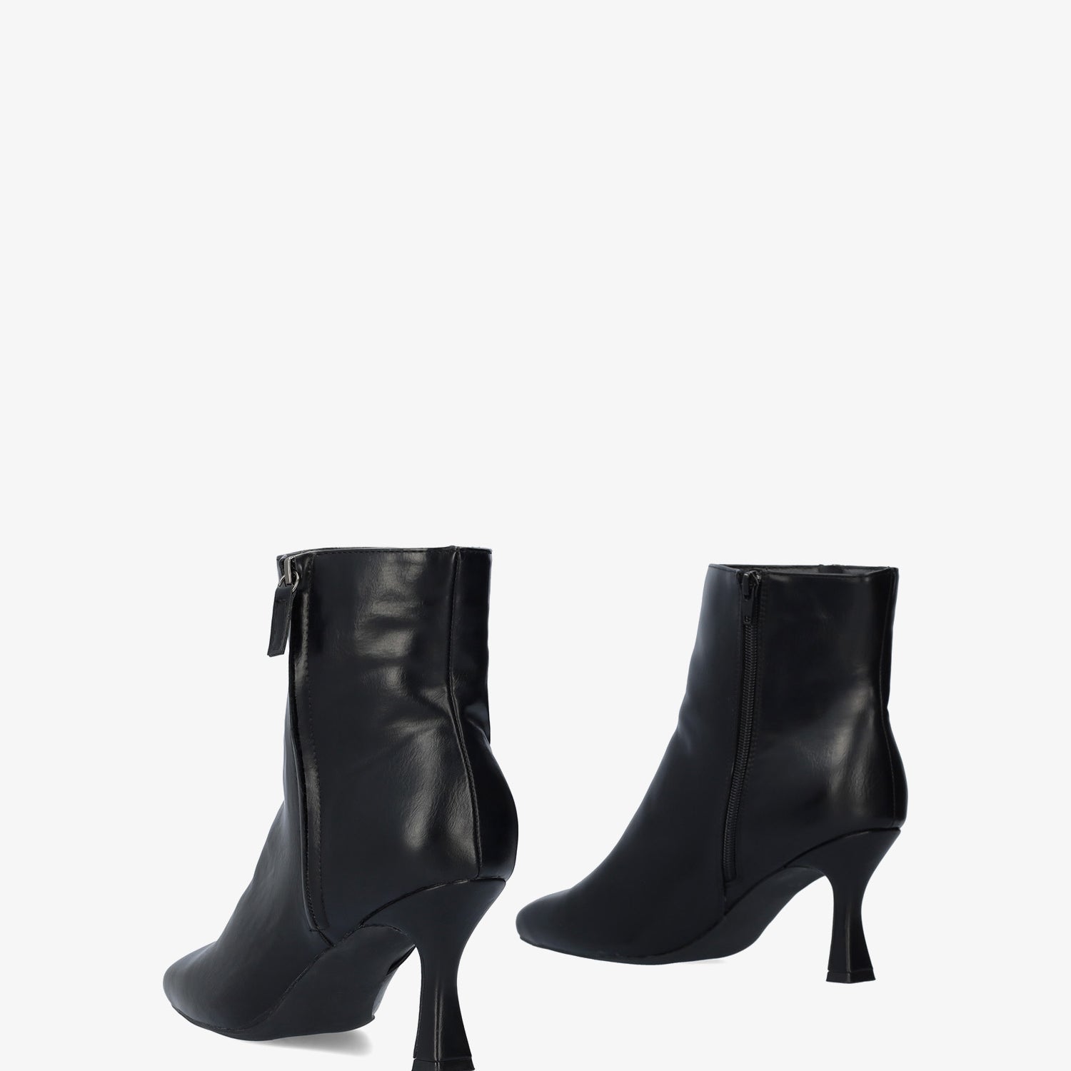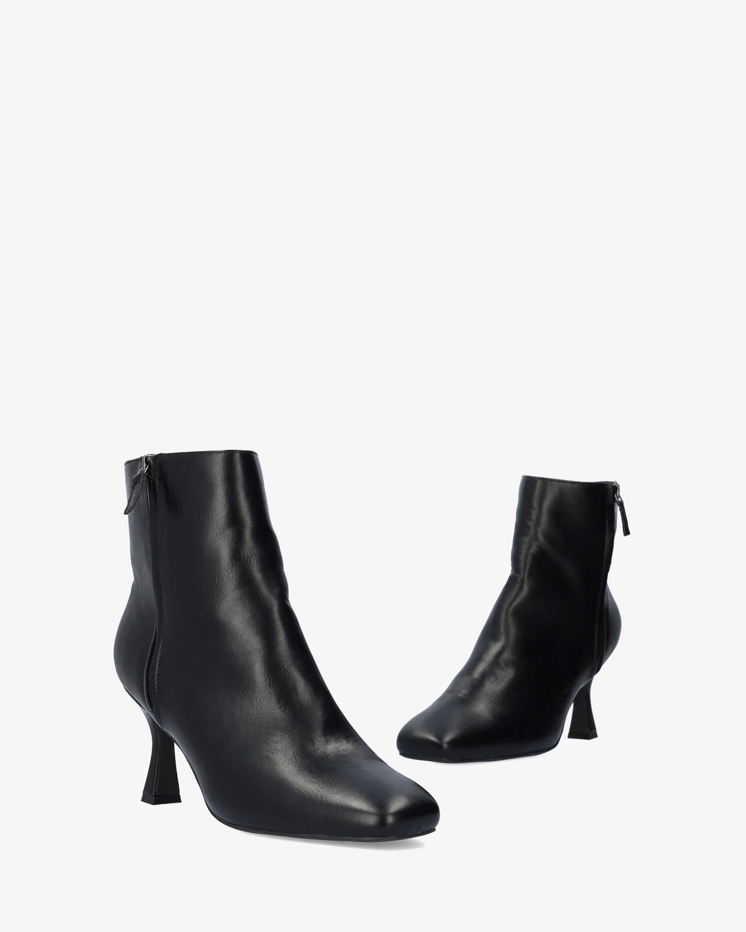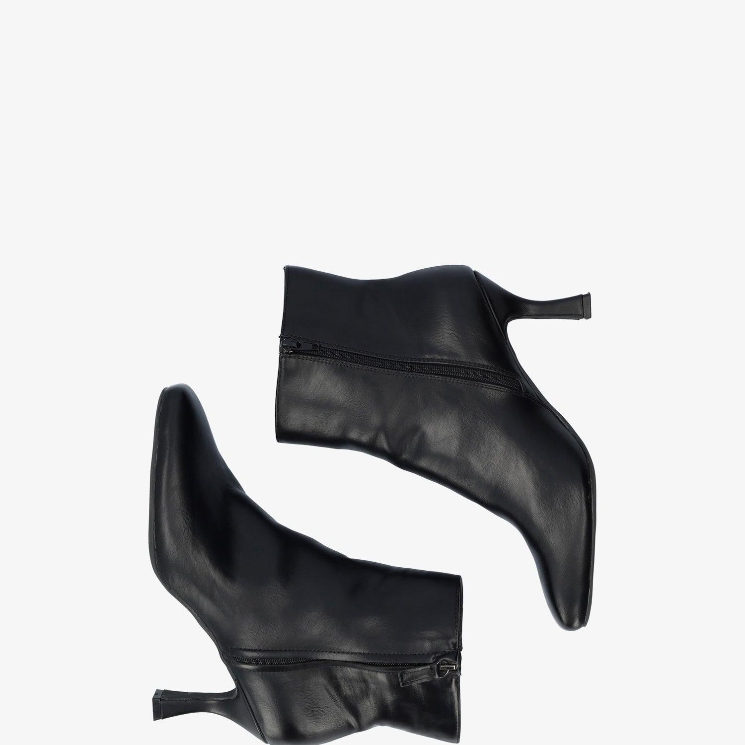Bottine à talon Kitten Heel simili cuir noire. Fermeture éclair latérale du même ton. Bout carré. Talon doublé de 8,3 cm pour les petites pointures du 32 au 35 et de 8,7 cm pour les grandes pointures du 42 au 45.