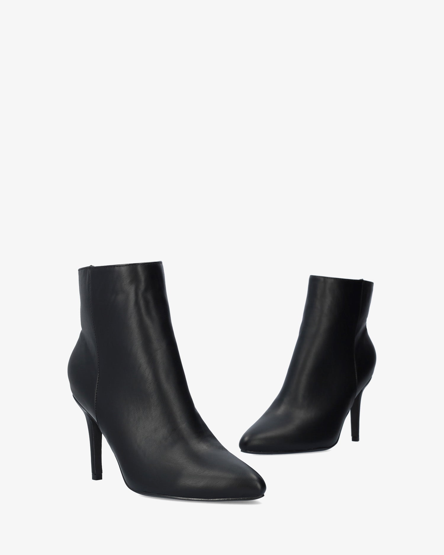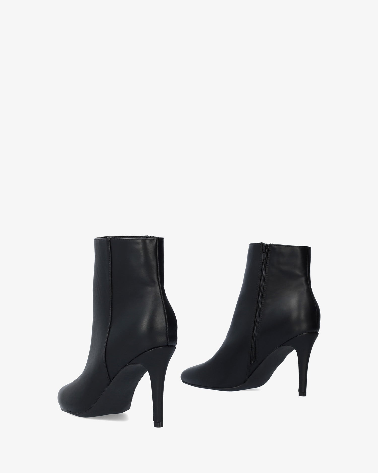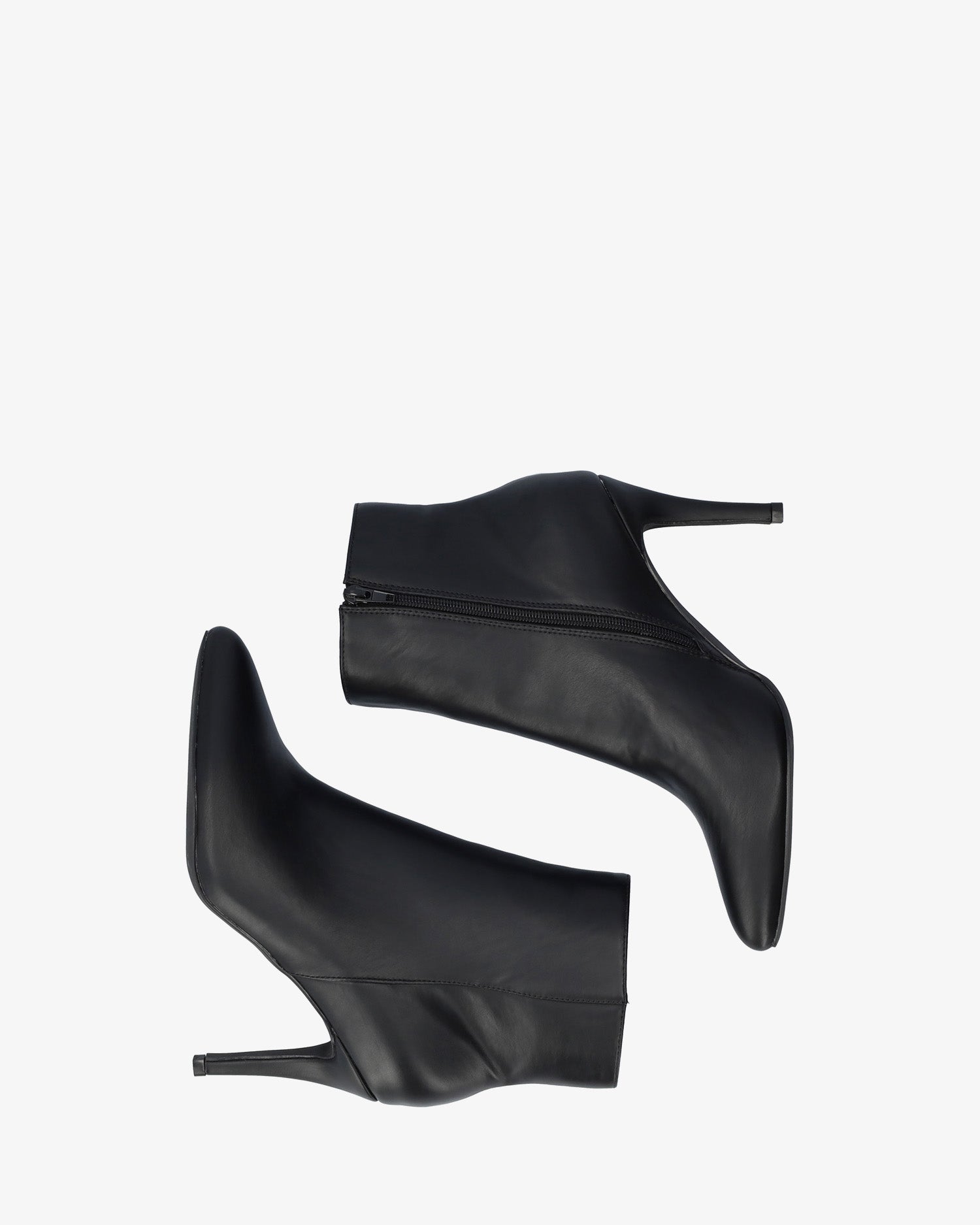 Bottines à talon en simili cuir noire avec fermeture éclair latérale assortie. Coutures décoratives sur le côté extérieur. Bout pointe fine. Talon fin doublé de 7,5 cm pour les petites pointures du 32 au 35 et de 10 cm pour les grandes pointures du 42 au 45. Ce modèle mesure petit, nous vous conseillons de prendre une pointure en plus.