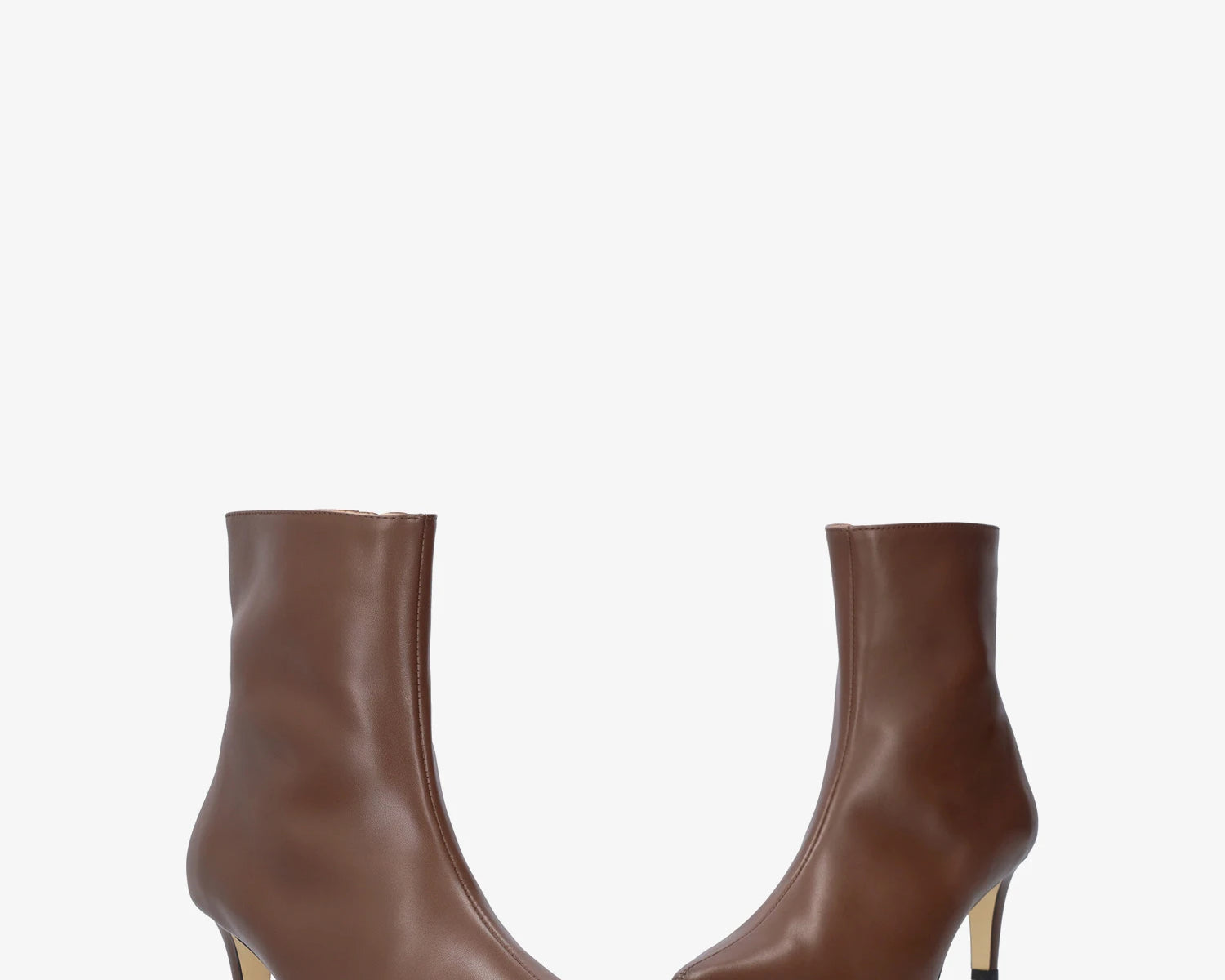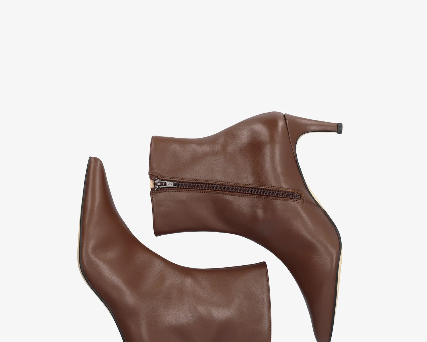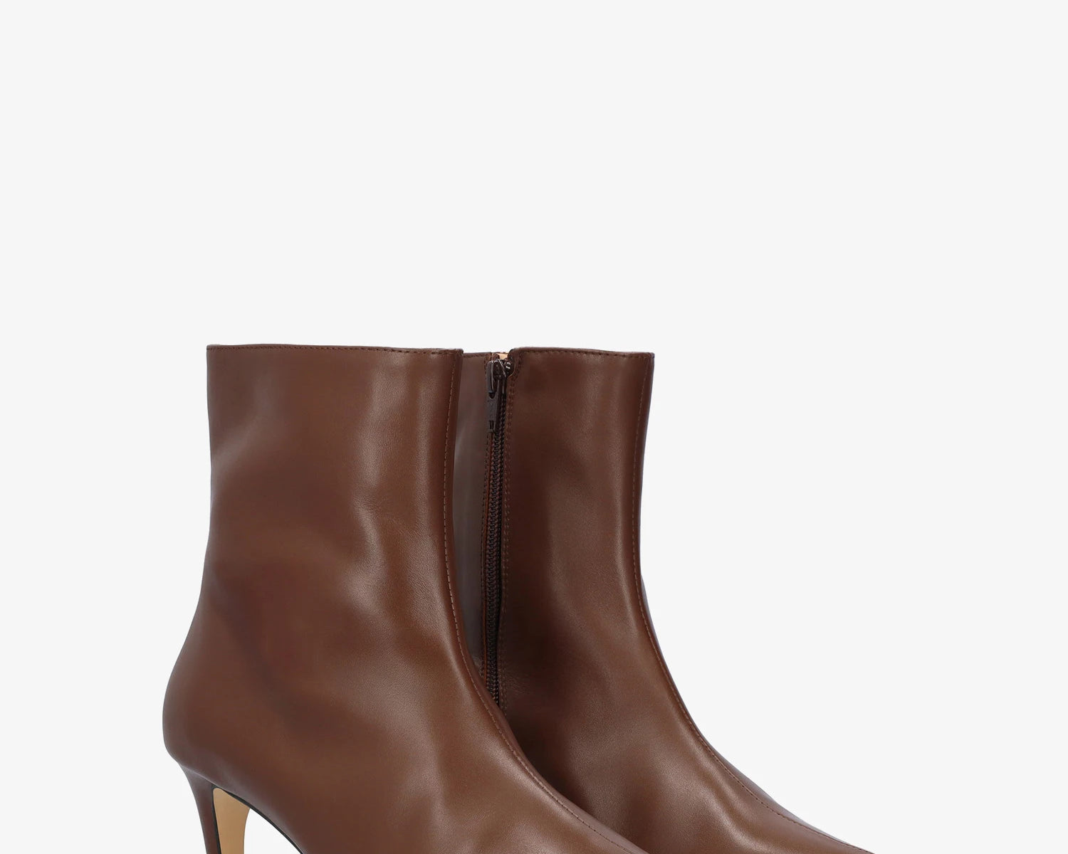 Bottines à talon en cuir. Finition bout pointu, fermeture zippée sur le côté et surpiqûres décoratives ton sur ton. Talon de 6 cm pour les petites pointures (32 à 35) et de 7 cm pour les grandes pointures (42 à 45). Fabriquées en Espagne.