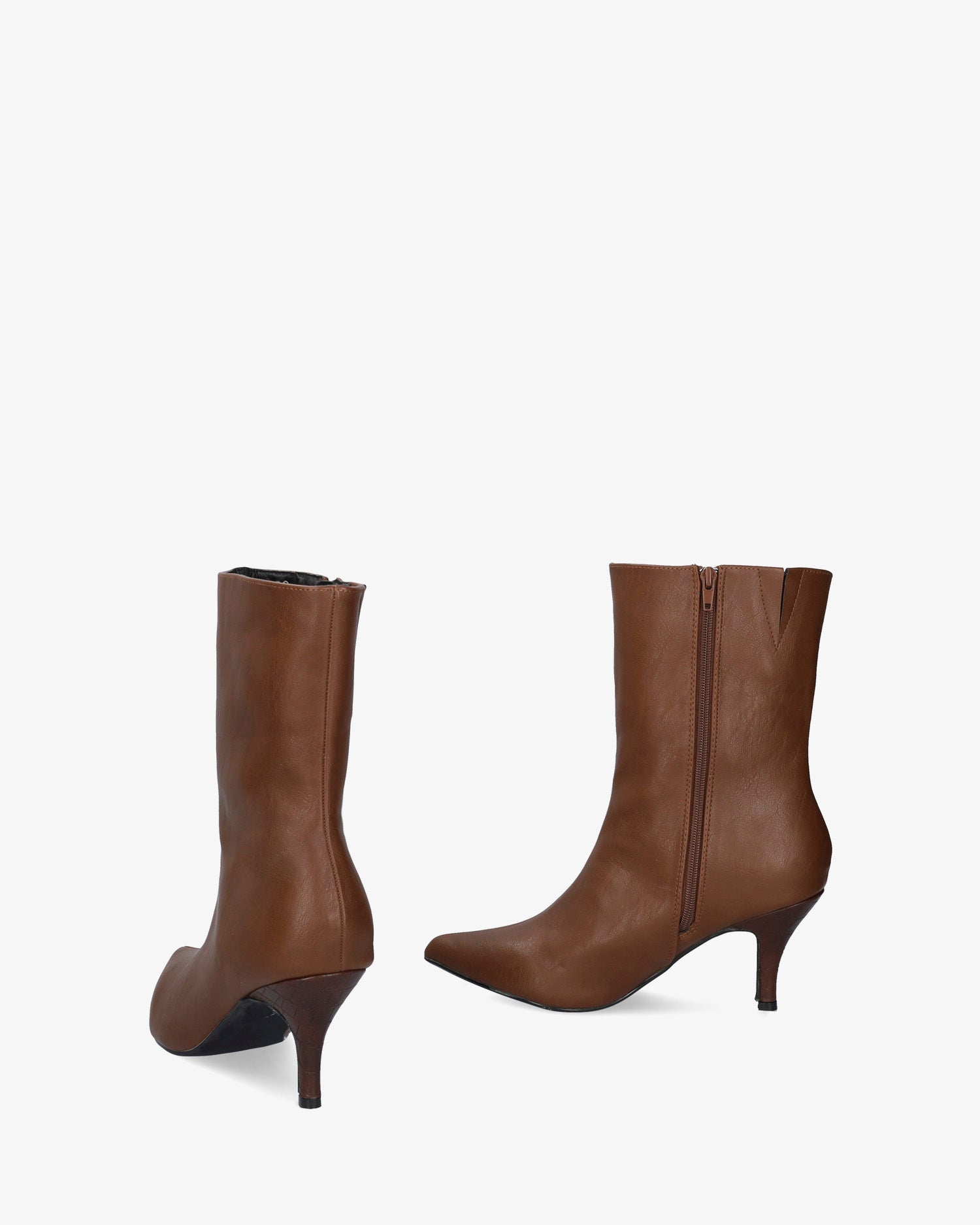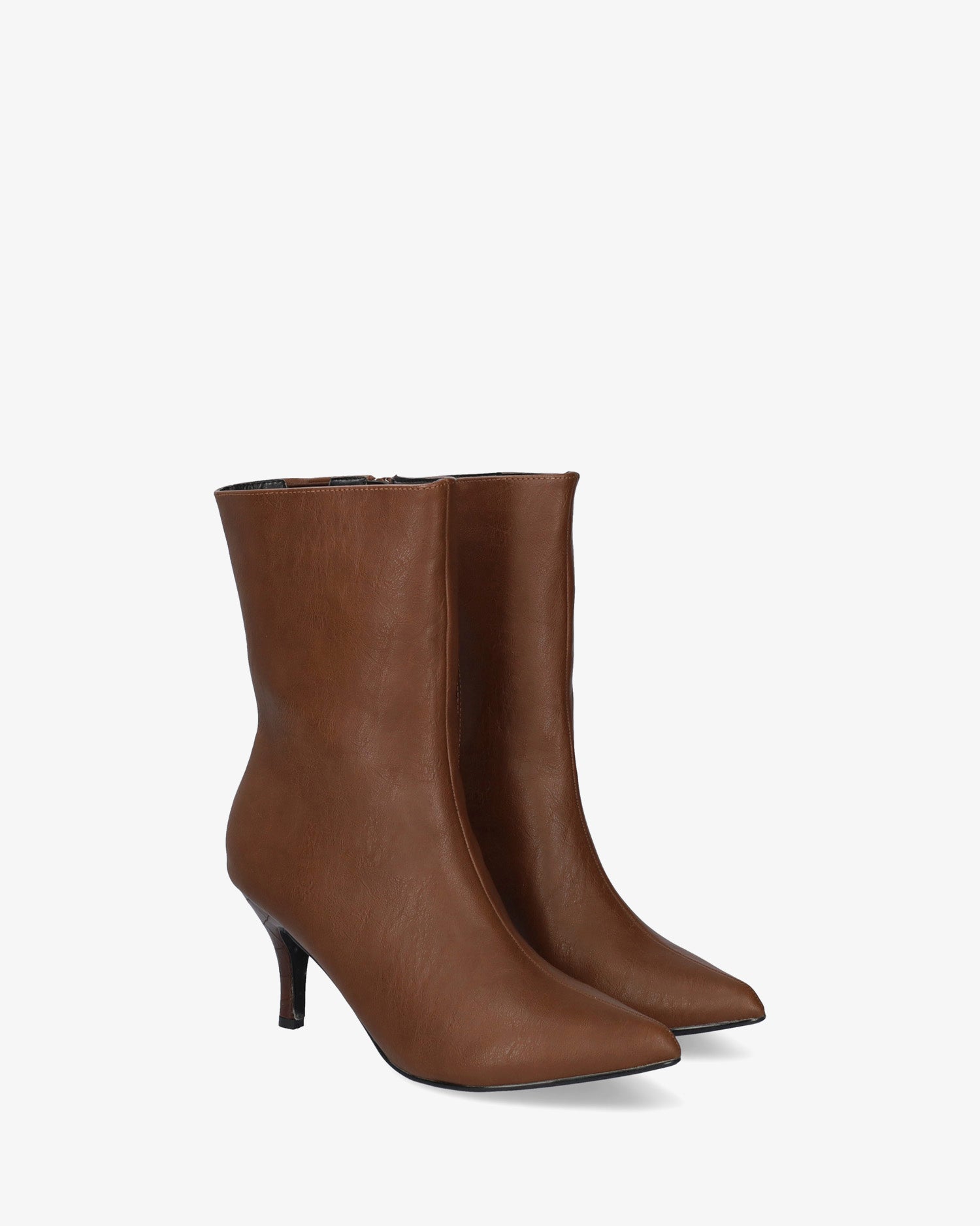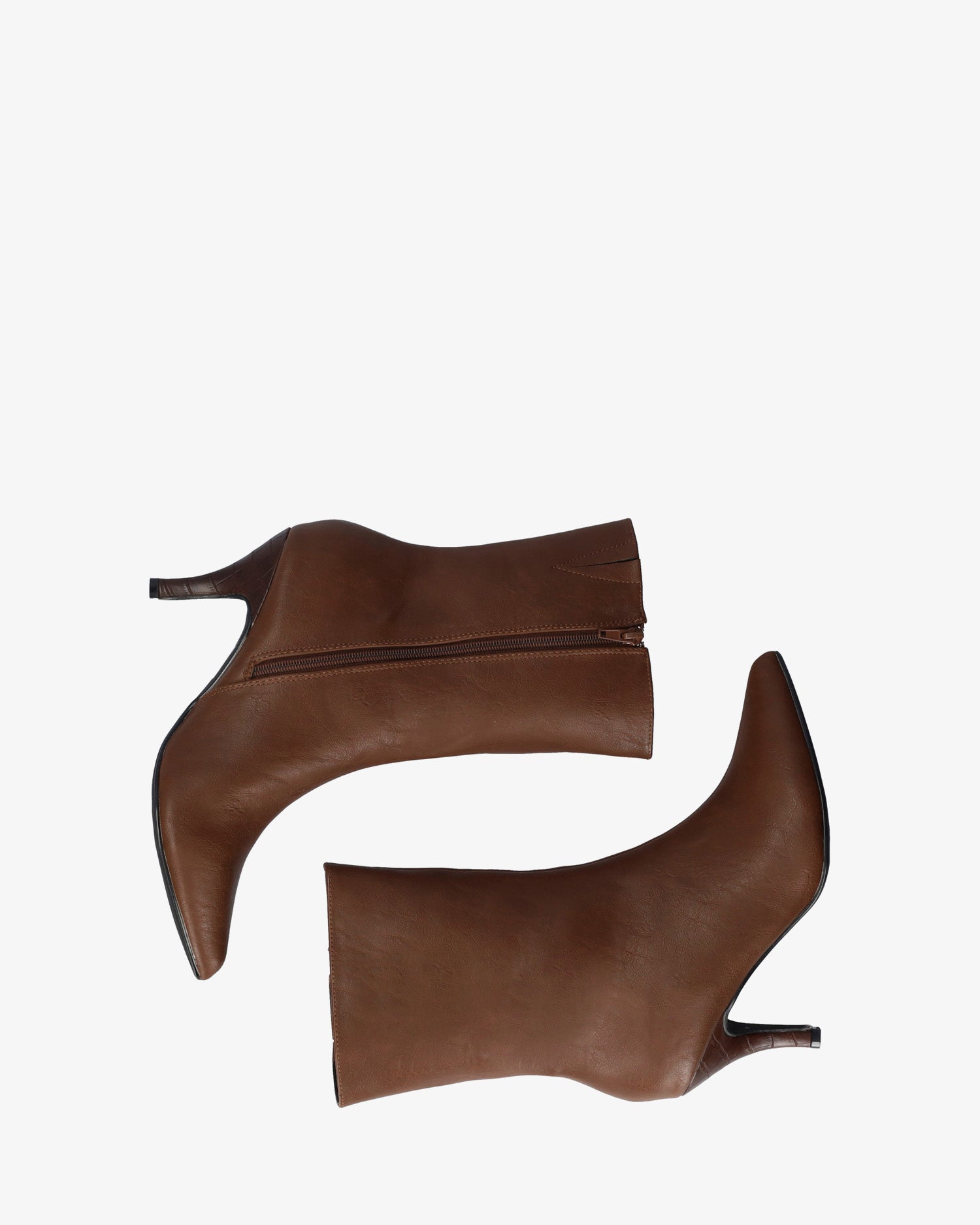 Bottines en soft de couleur marron. Surpiqûre décorative du bout jusqu´au haut la tige. Bout pointu. Fermeture éclair au même ton sur la partie intérieur. Talons moyens fins doublés en soft croco du même ton de 6,5 cm pour les petites pointures du 32 au 35. Talons de 8 cm pour les grandes pointures du 42 au 45.