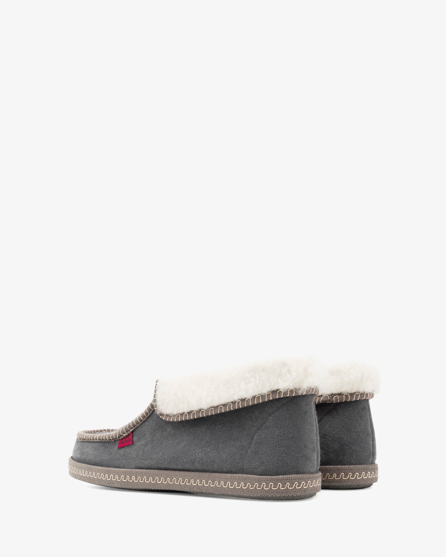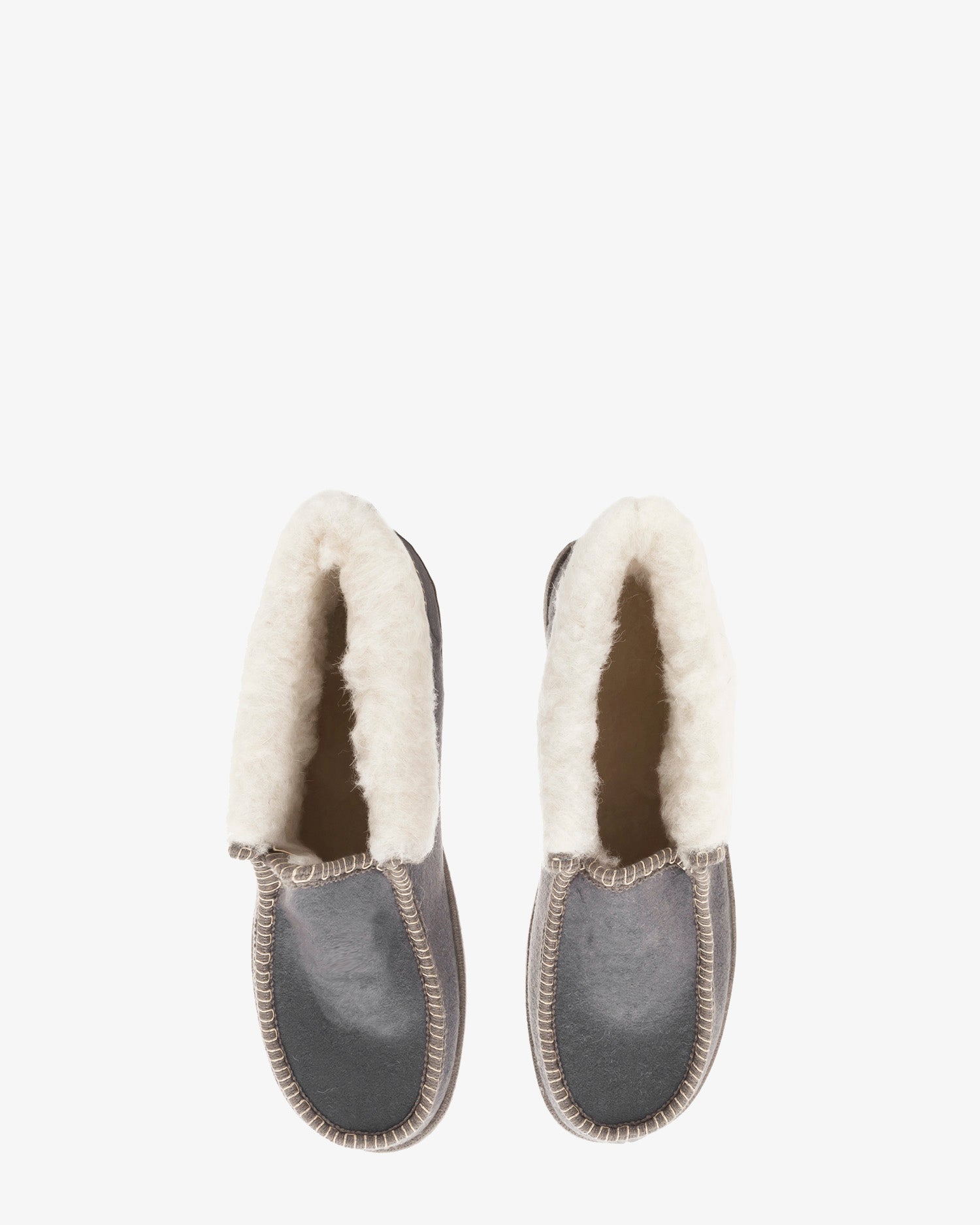Chaussons hauts en suède couleur Gris, fourrés en fausse fourrure d´Agneau. Semelle en caoutchouc. Très fléxibles. Toutes les pointures de la 32 à la 45.
