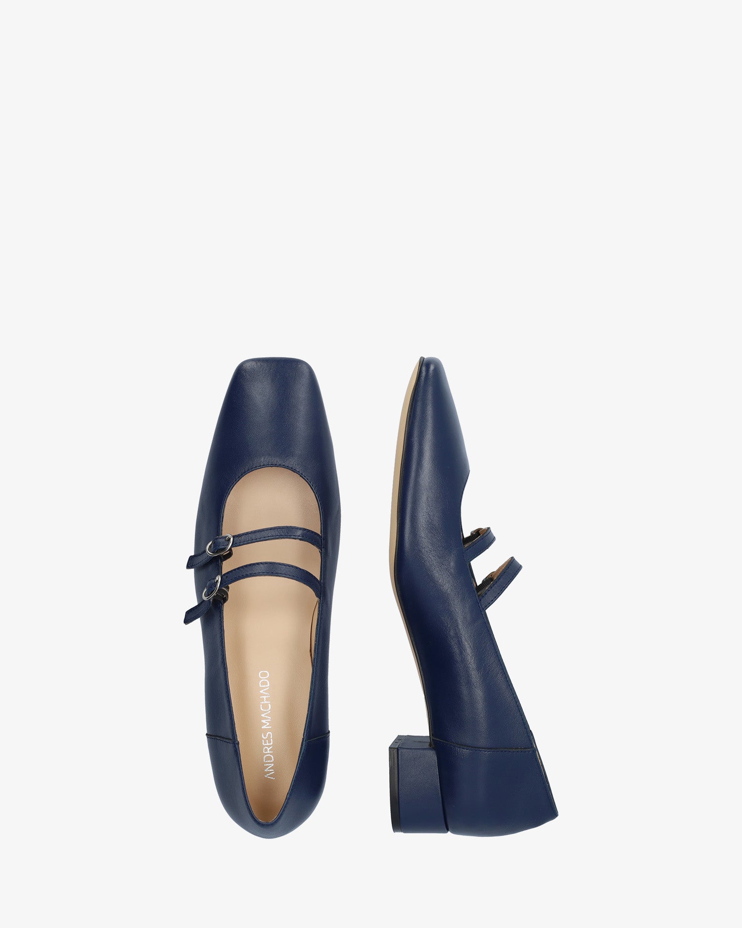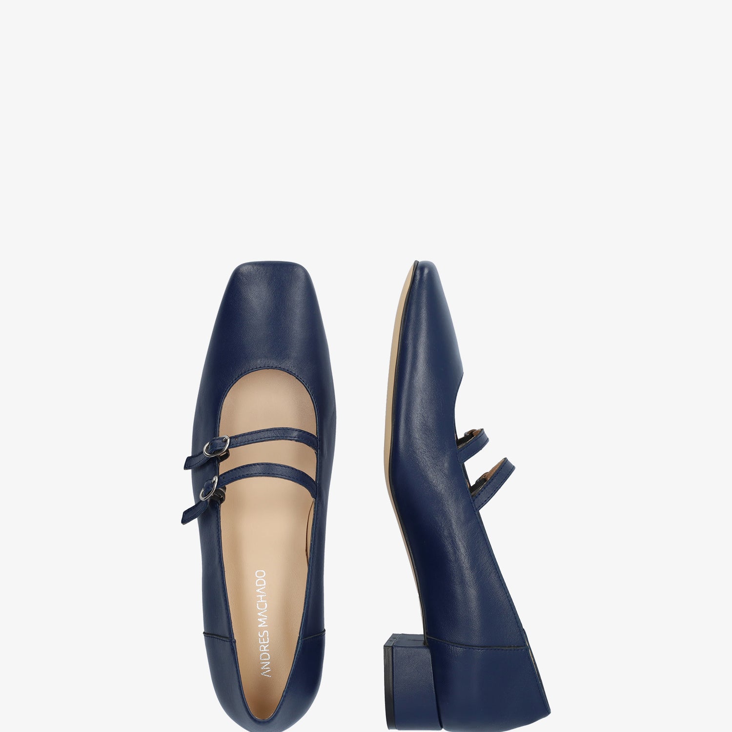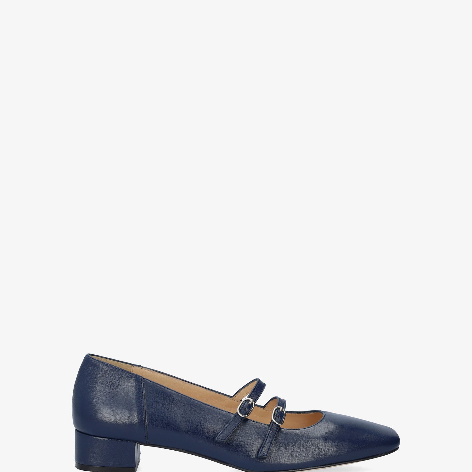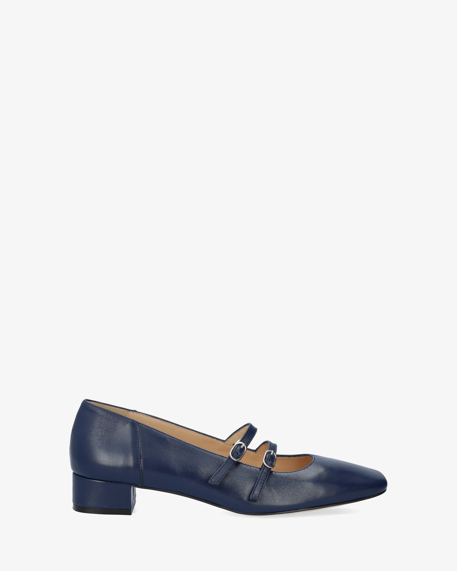 Chaussure en cuir Bleu Marine. Modèle avec deux fines brides sur le cou-de-pied avec fermeture à boucle métallique. Doublure intérieure en cuir beige. Finition bout carré. Talon doublé assorti de 3 cm de hauteur pour les petites pointures du 32 au 35. Talon de 3,2 cm de hauteur pour les grandes pointures du 42 au 45. Fabriqué en Espagne.