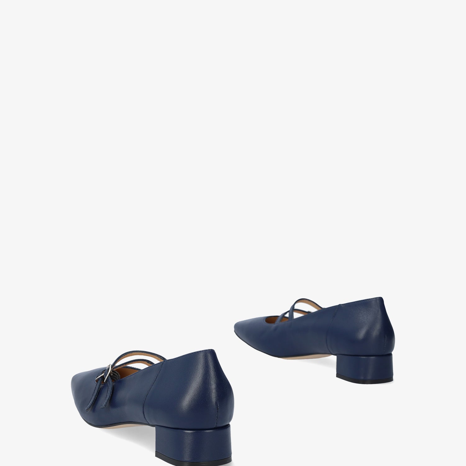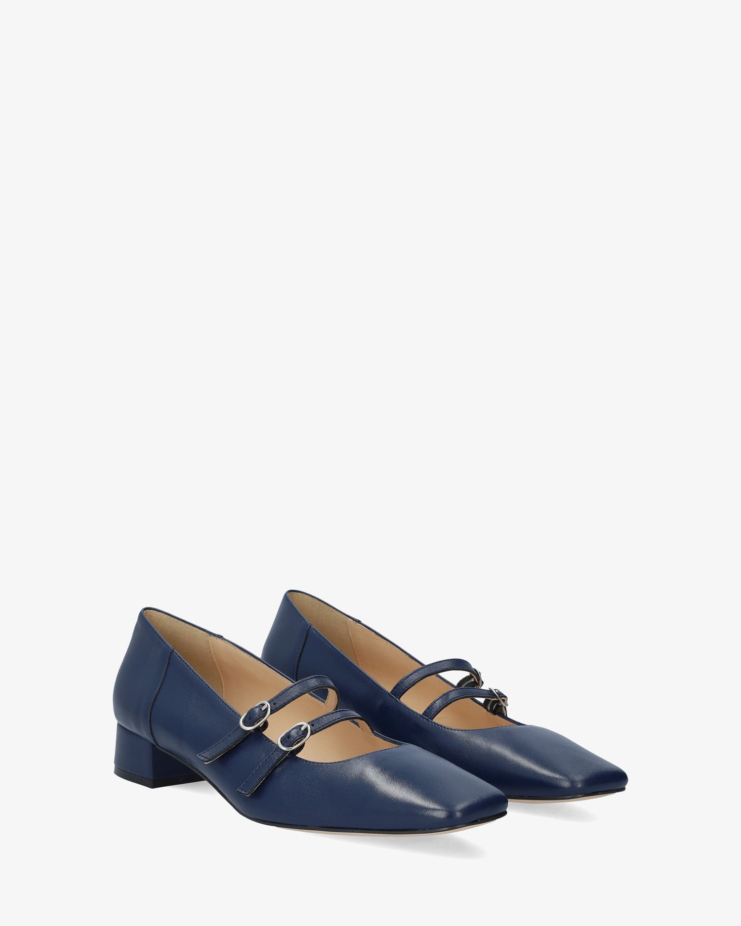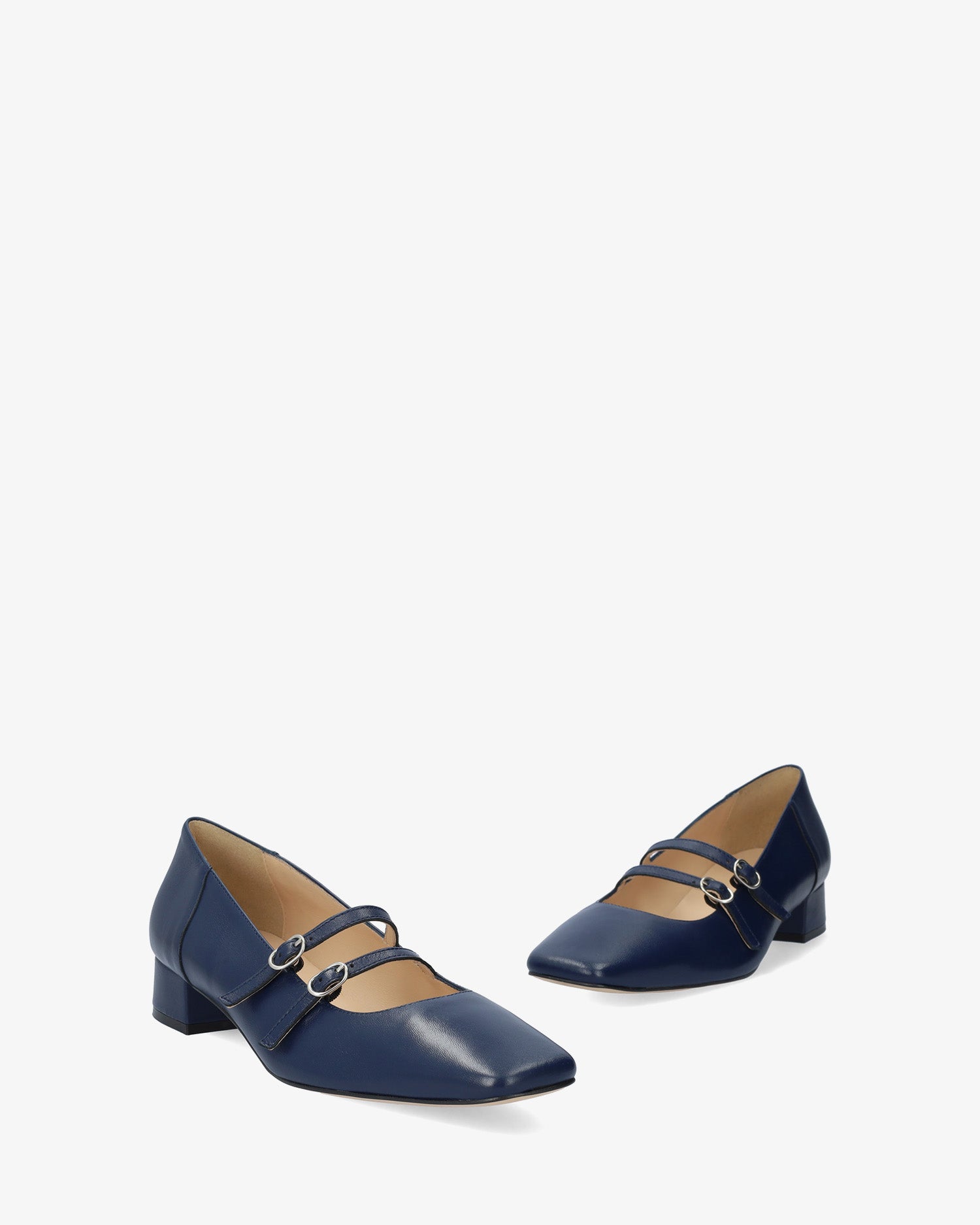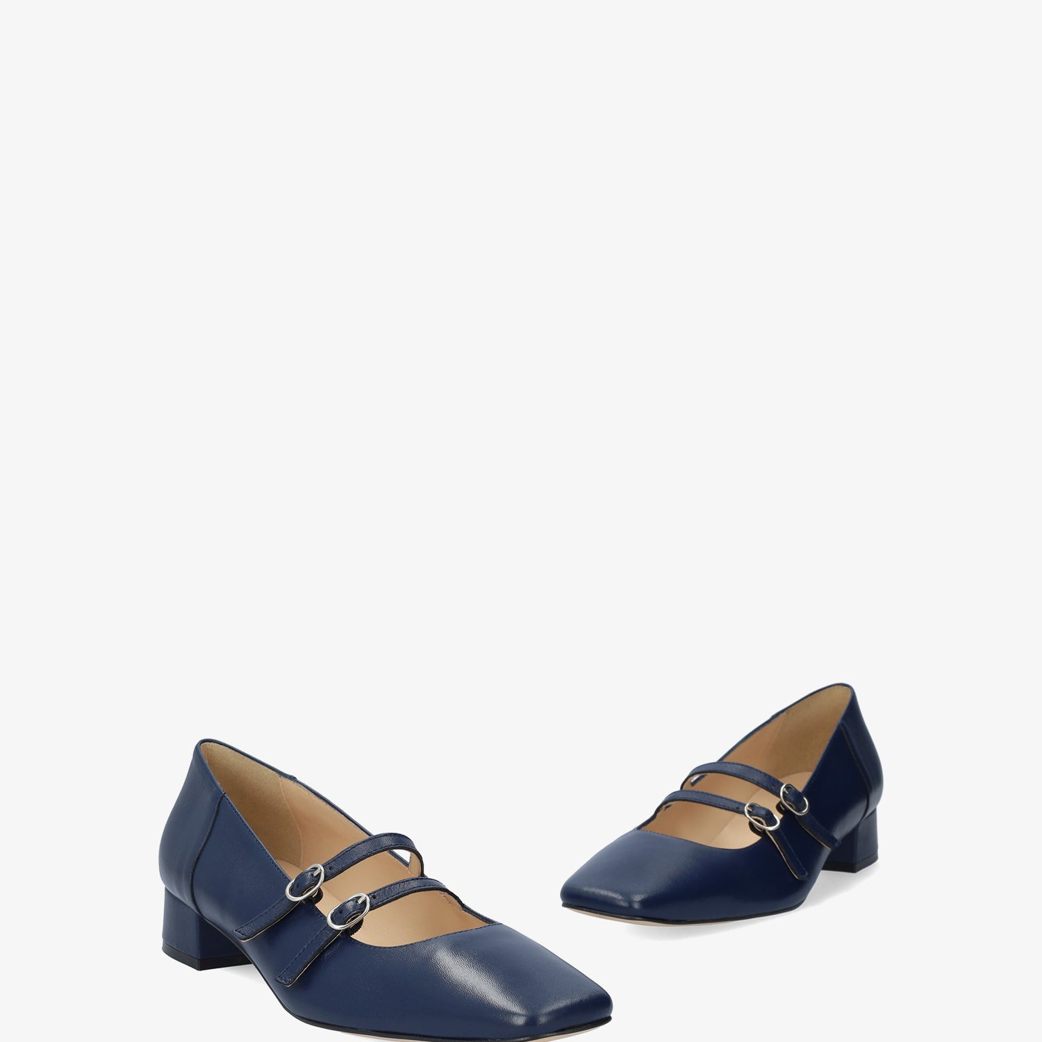Chaussure en cuir Bleu Marine. Modèle avec deux fines brides sur le cou-de-pied avec fermeture à boucle métallique. Doublure intérieure en cuir beige. Finition bout carré. Talon doublé assorti de 3 cm de hauteur pour les petites pointures du 32 au 35. Talon de 3,2 cm de hauteur pour les grandes pointures du 42 au 45. Fabriqué en Espagne.