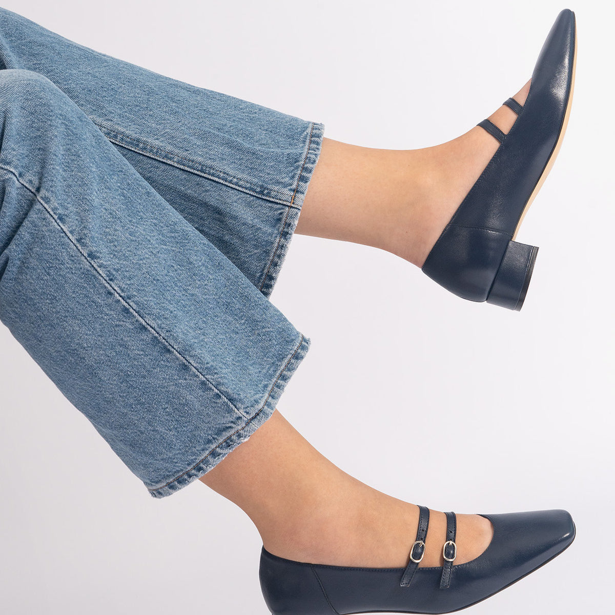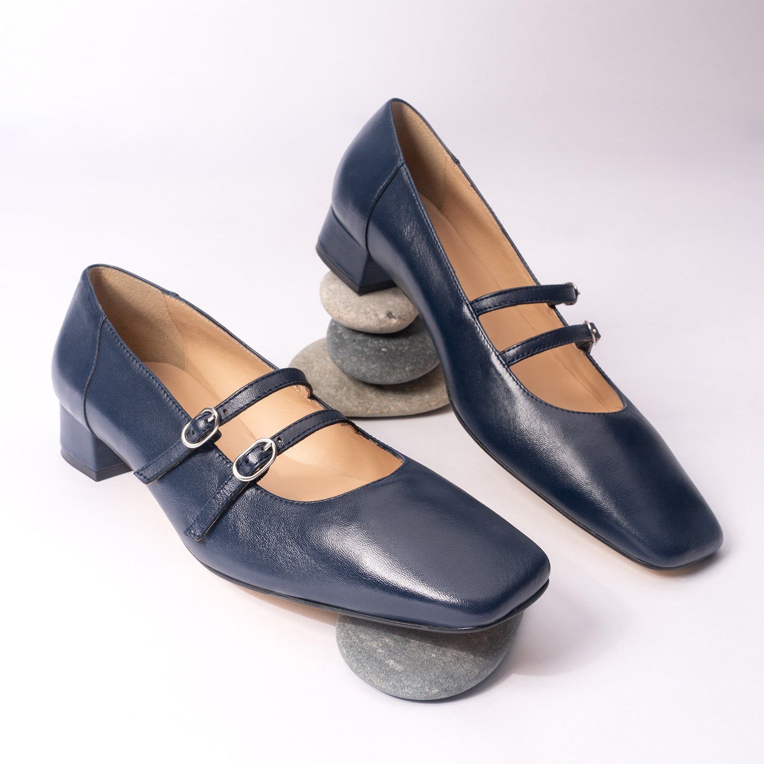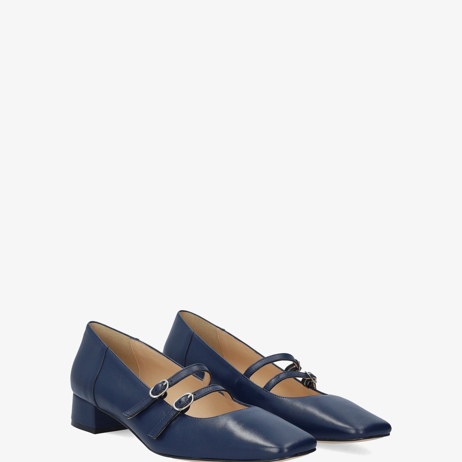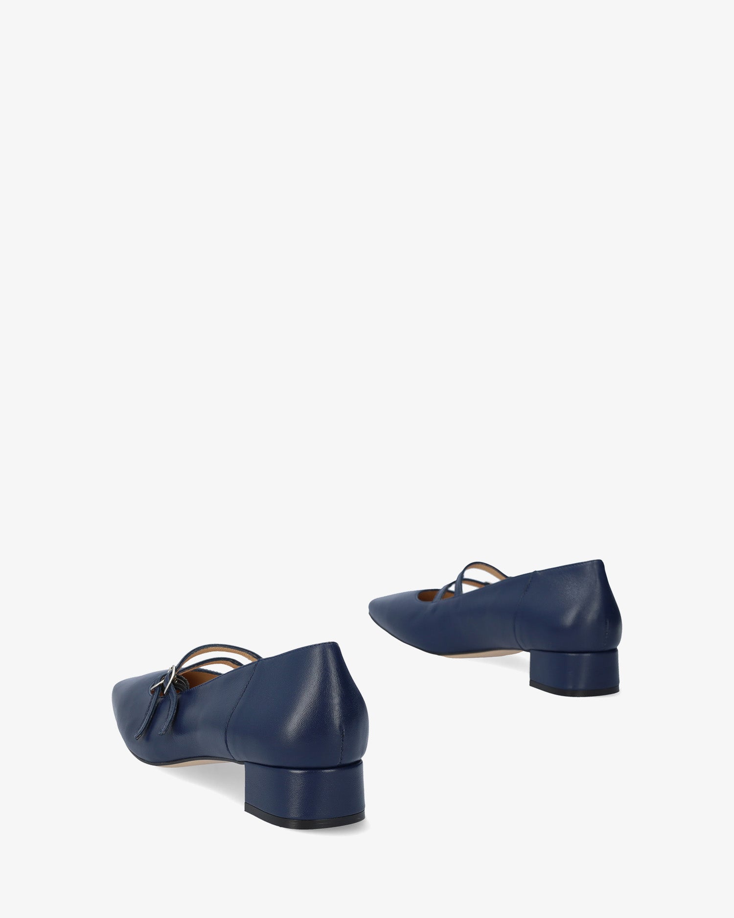 Chaussure en cuir Bleu Marine. Modèle avec deux fines brides sur le cou-de-pied avec fermeture à boucle métallique. Doublure intérieure en cuir beige. Finition bout carré. Talon doublé assorti de 3 cm de hauteur pour les petites pointures du 32 au 35. Talon de 3,2 cm de hauteur pour les grandes pointures du 42 au 45. Fabriqué en Espagne.