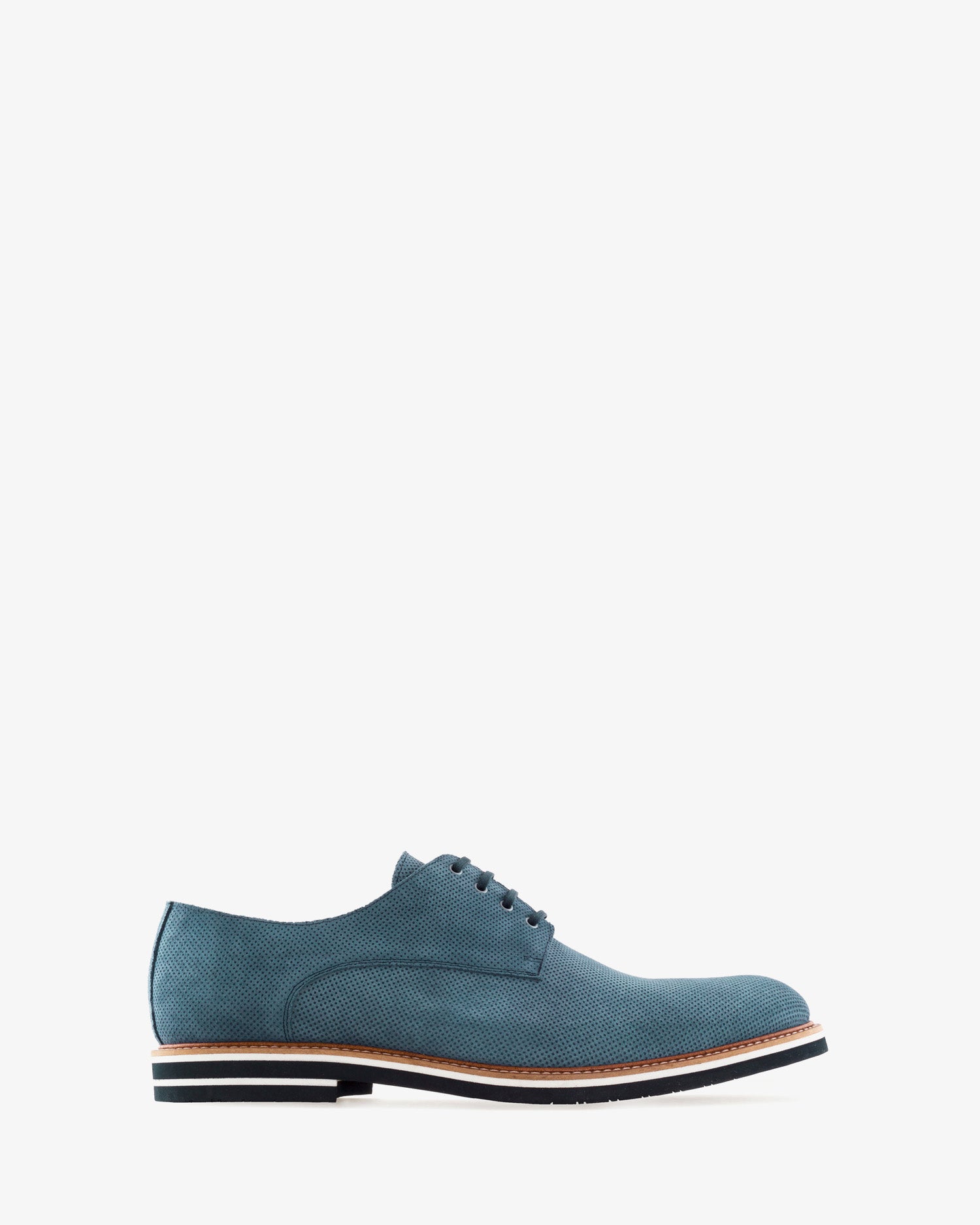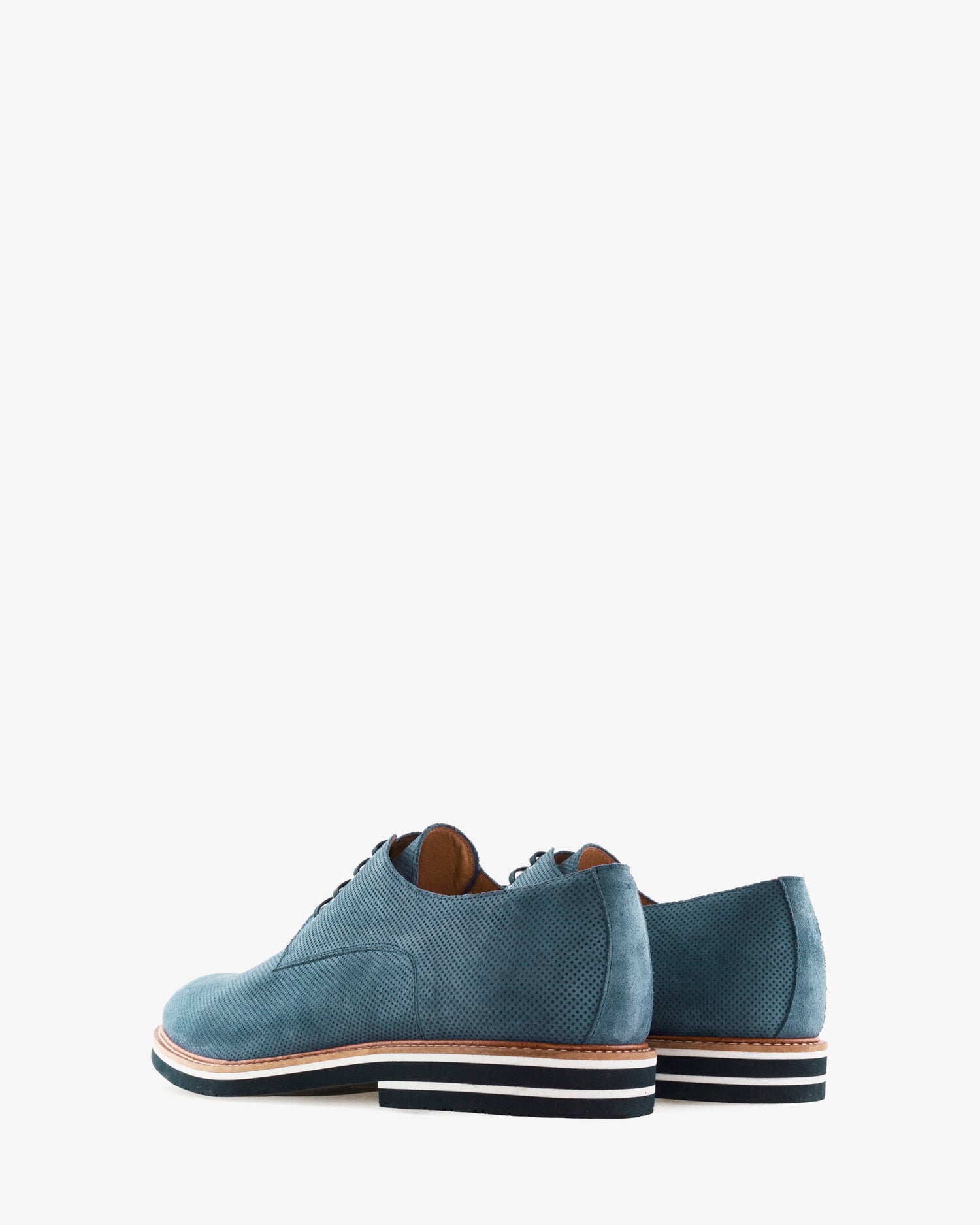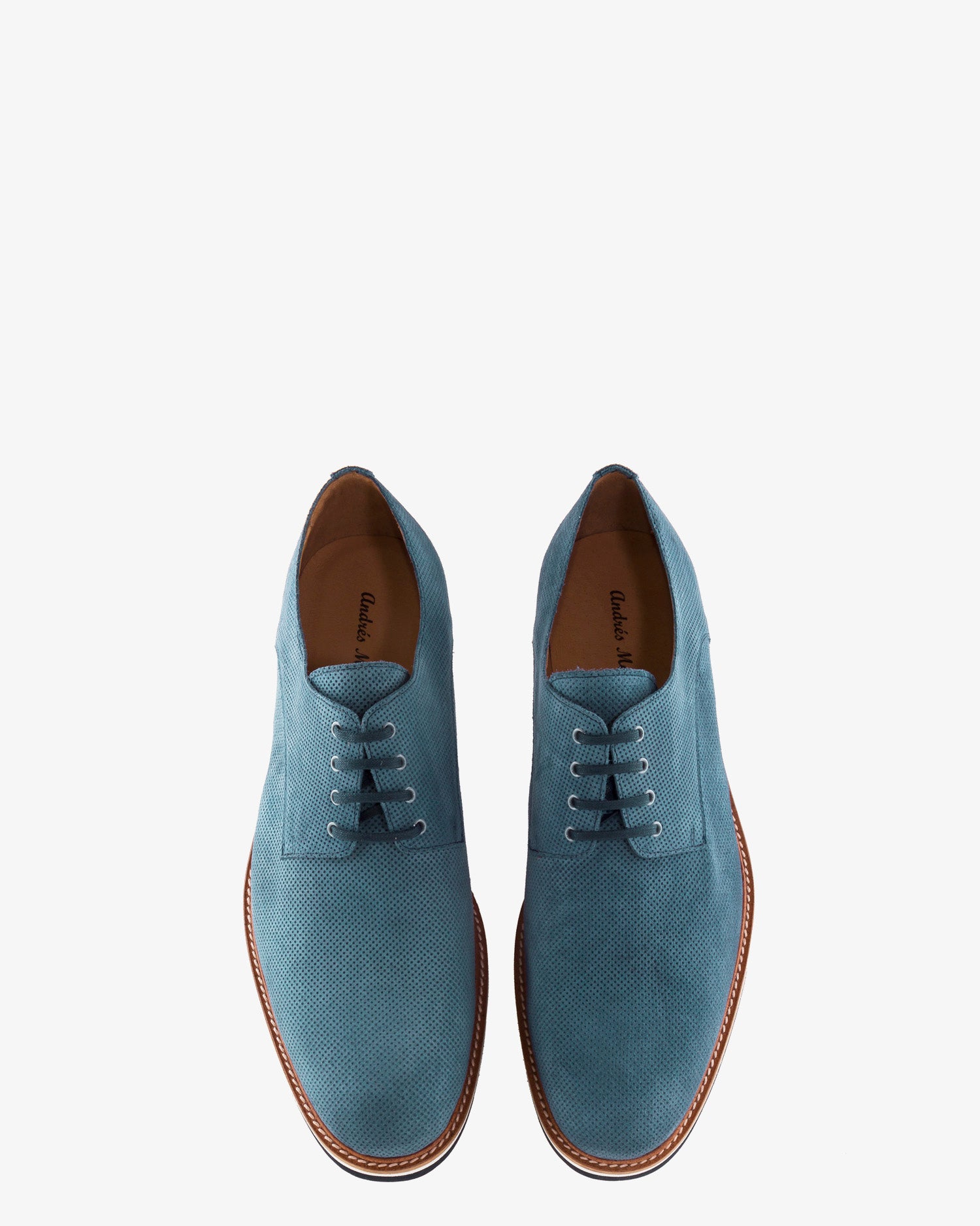 Chaussures en Cuir Suède Bleu avec micro perforations et fermeture à lacets de la même couleur. Doublure Cuir Marron. Fabrication Espagnole. Grandes Pointures pour Hommes du 47 au 50.