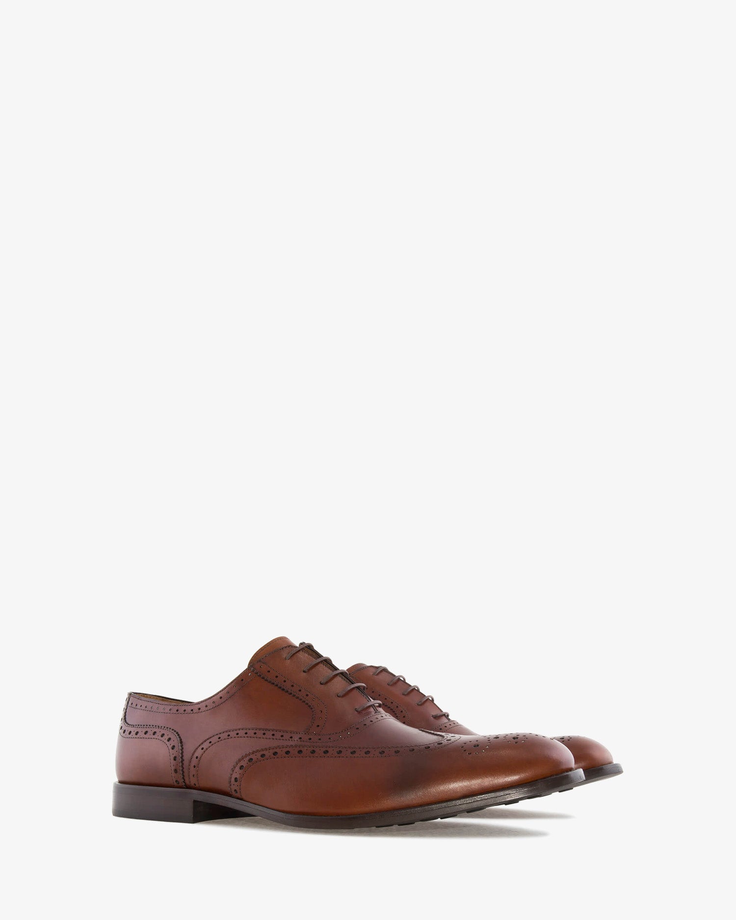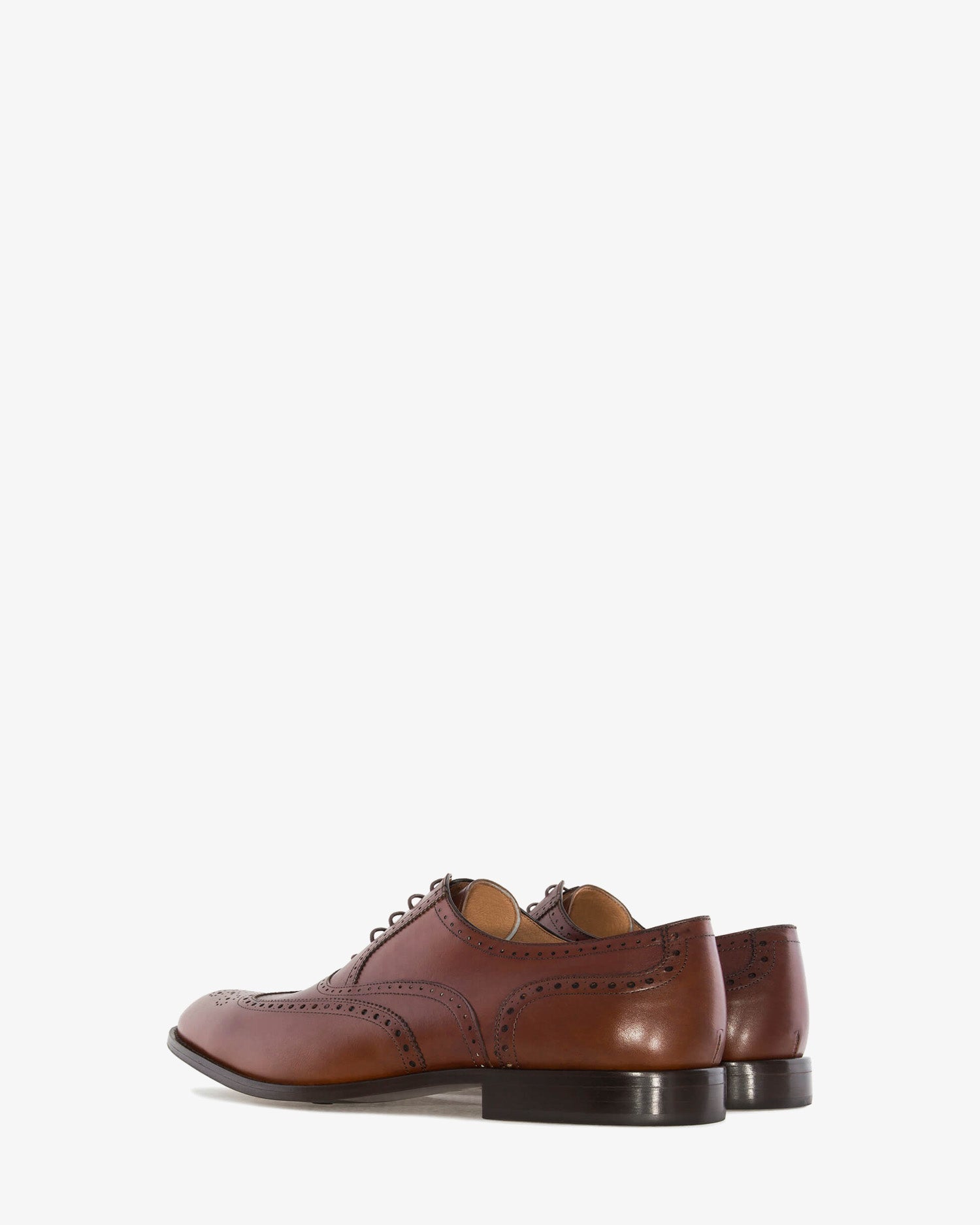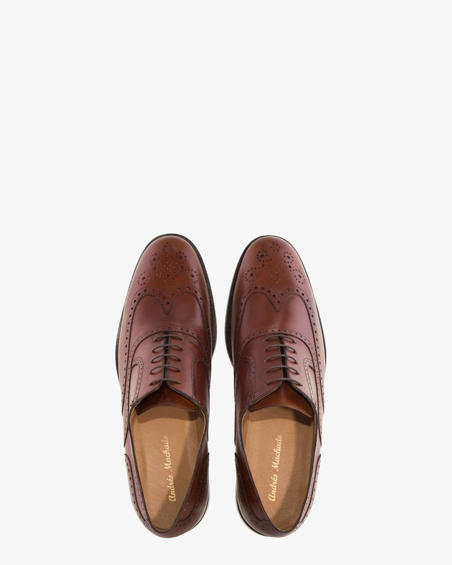 Chaussures Hommes Style Oxford En Cuir Acajou. Fermeture à Lacets Noir. Doublure en cuir marron clair.Semelle en gomme eva de couleur noir. Coutures decoratives laterales, à la pointe et à la partie arrière. Fabrication Espagnole. Grandes Pointures du 47 au 50.