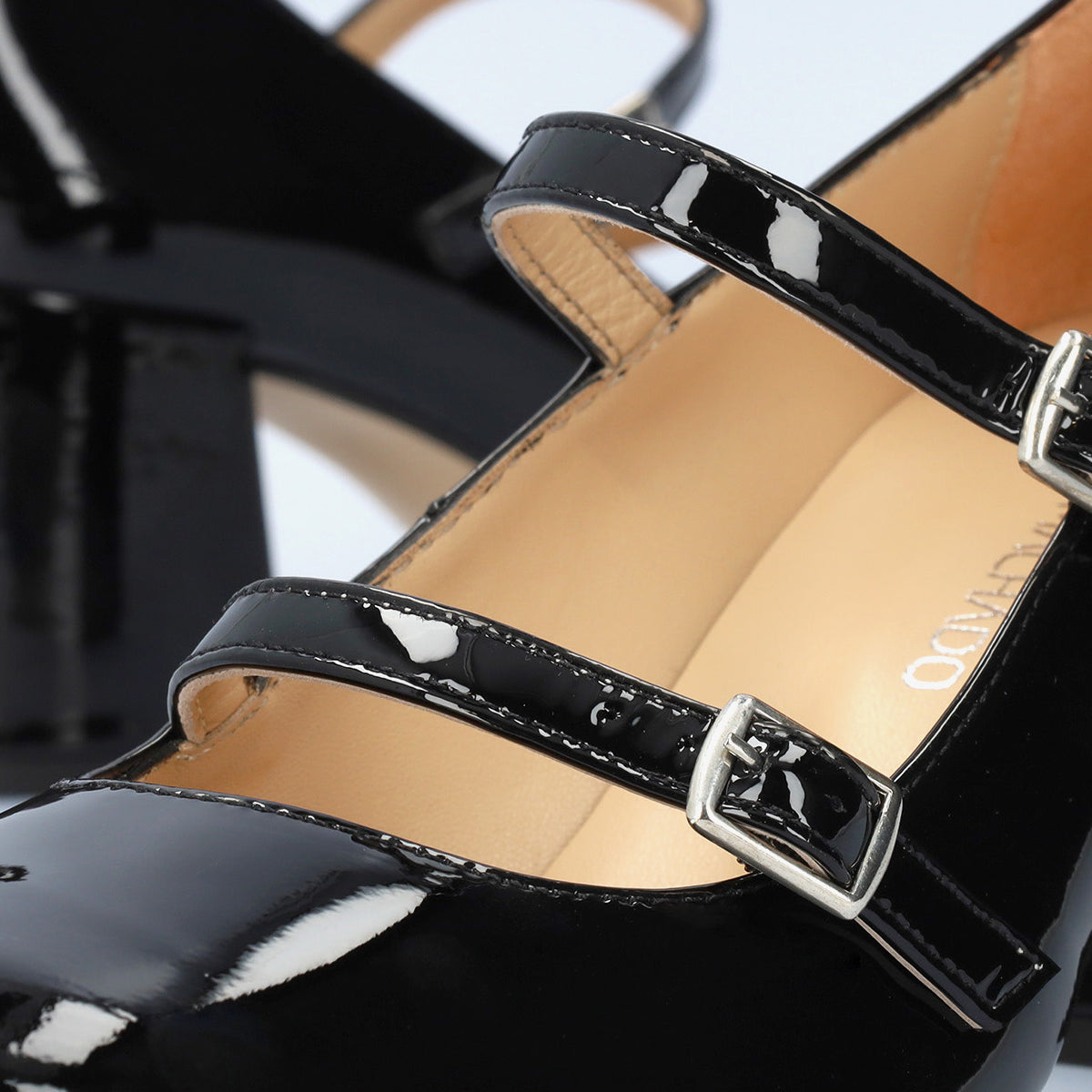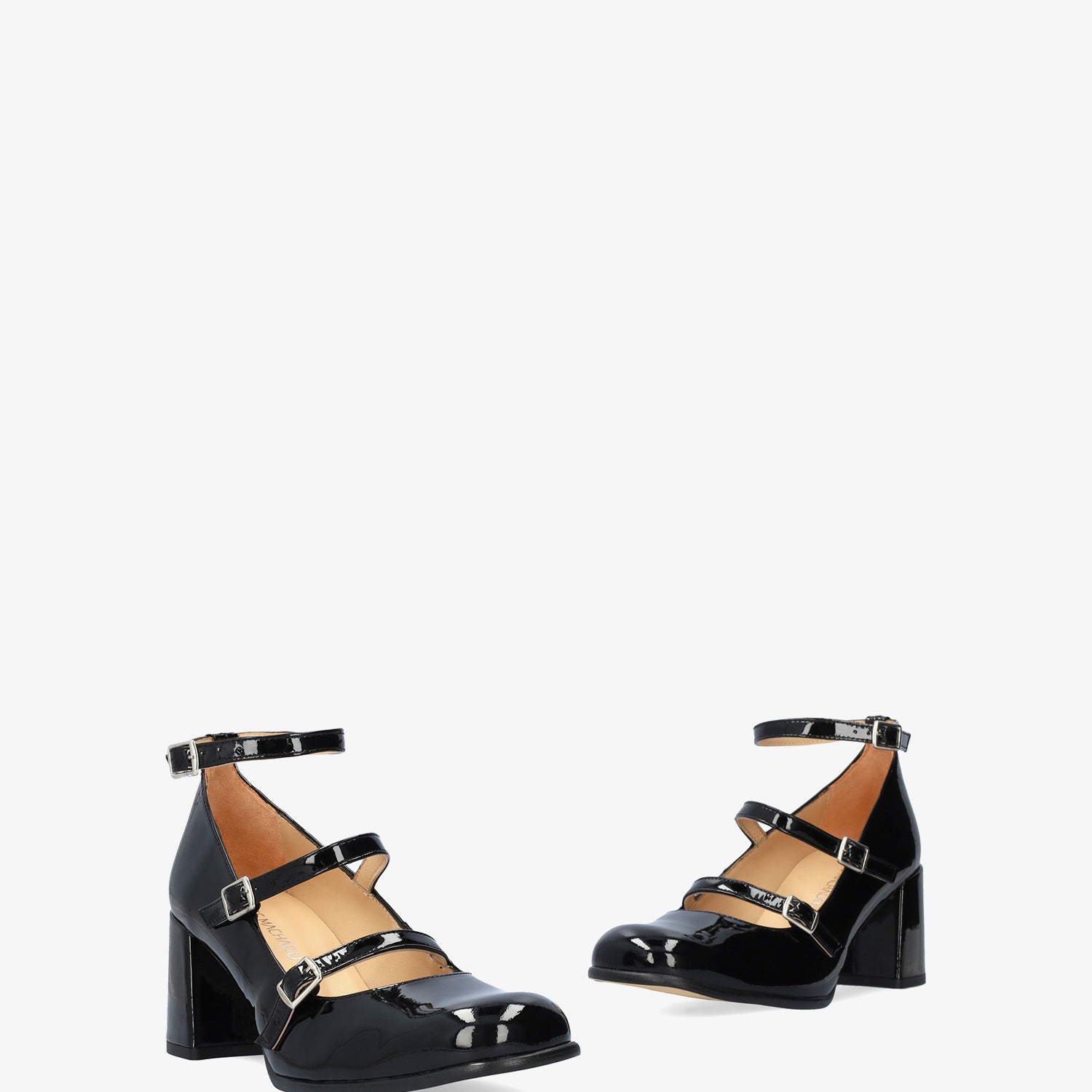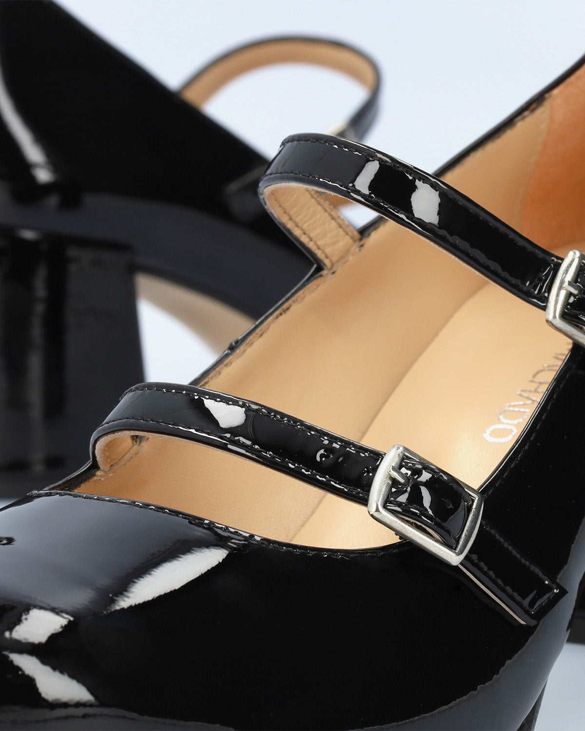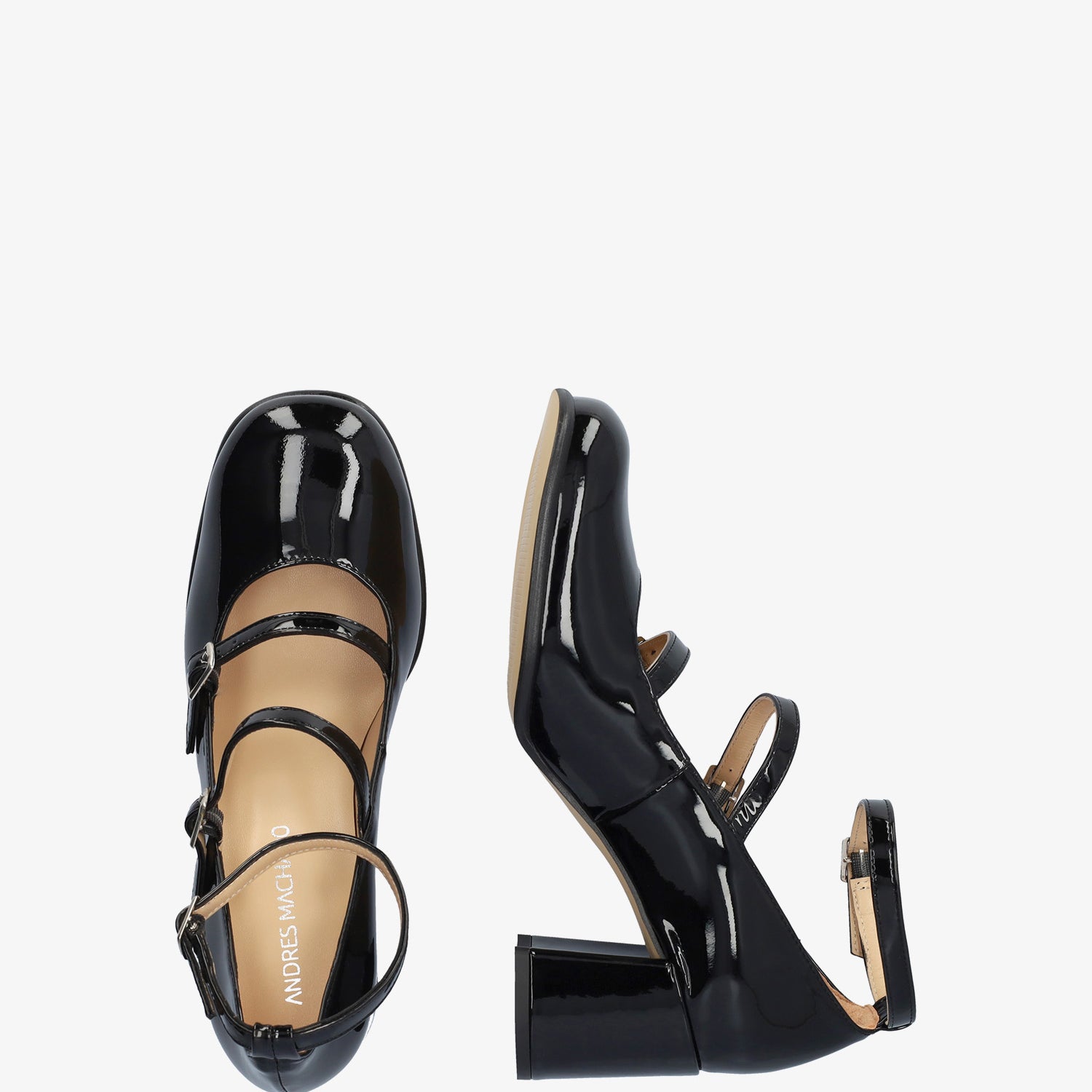 Chaussure de style Mary Jane en cuir verni noir, à bout arrondi et à trois brides élastiques du même ton. Ajustement à la cheville et au cou-de-pied, ainsi que boucles latérales métalliques. Doublure intérieure en cuir. Talon carré doublé de la même couleur, 6,5 cm pour les petites pointures du 32 au 35 et 7 cm pour les grandes pointures du 42 au 45. Fabriquée en Espagne.
