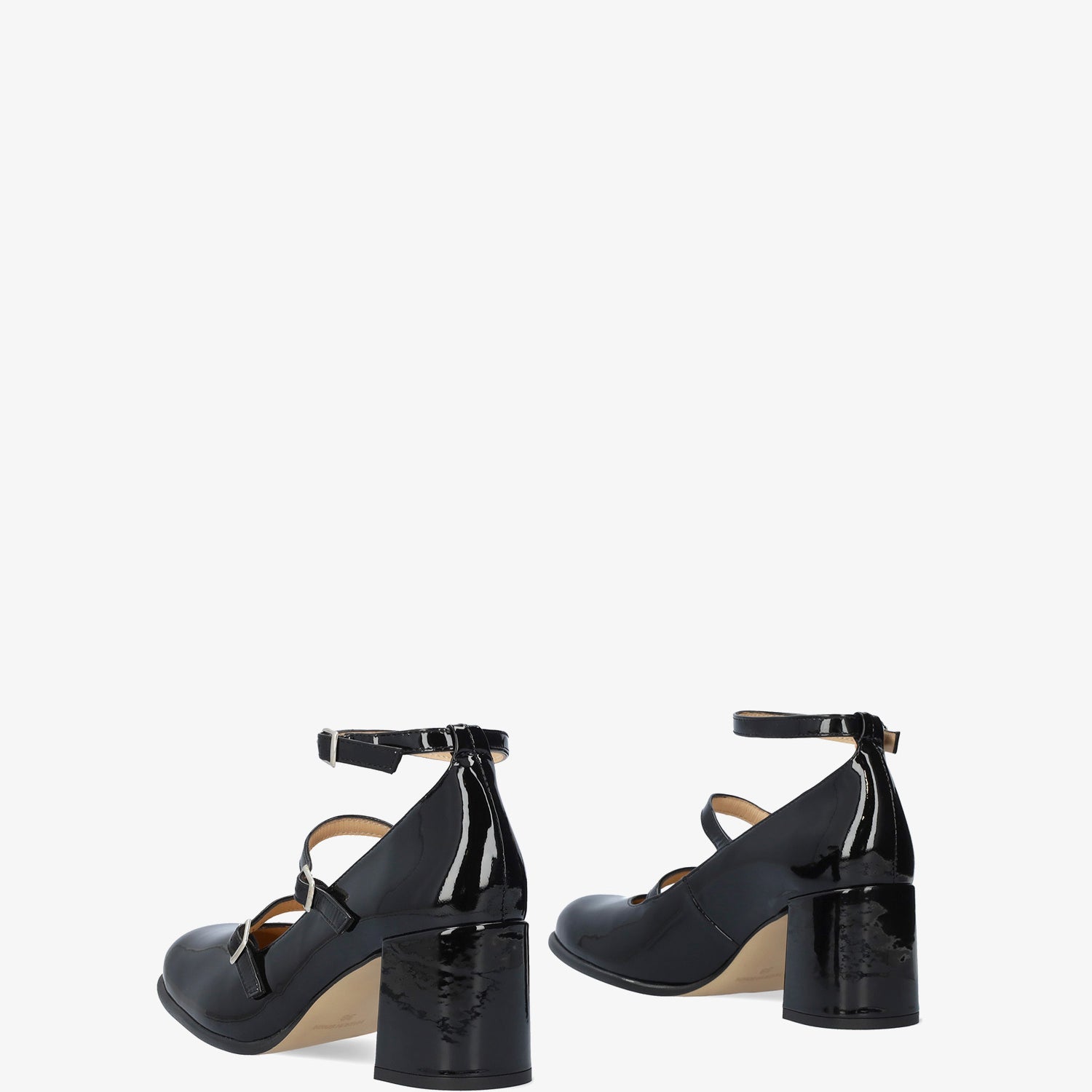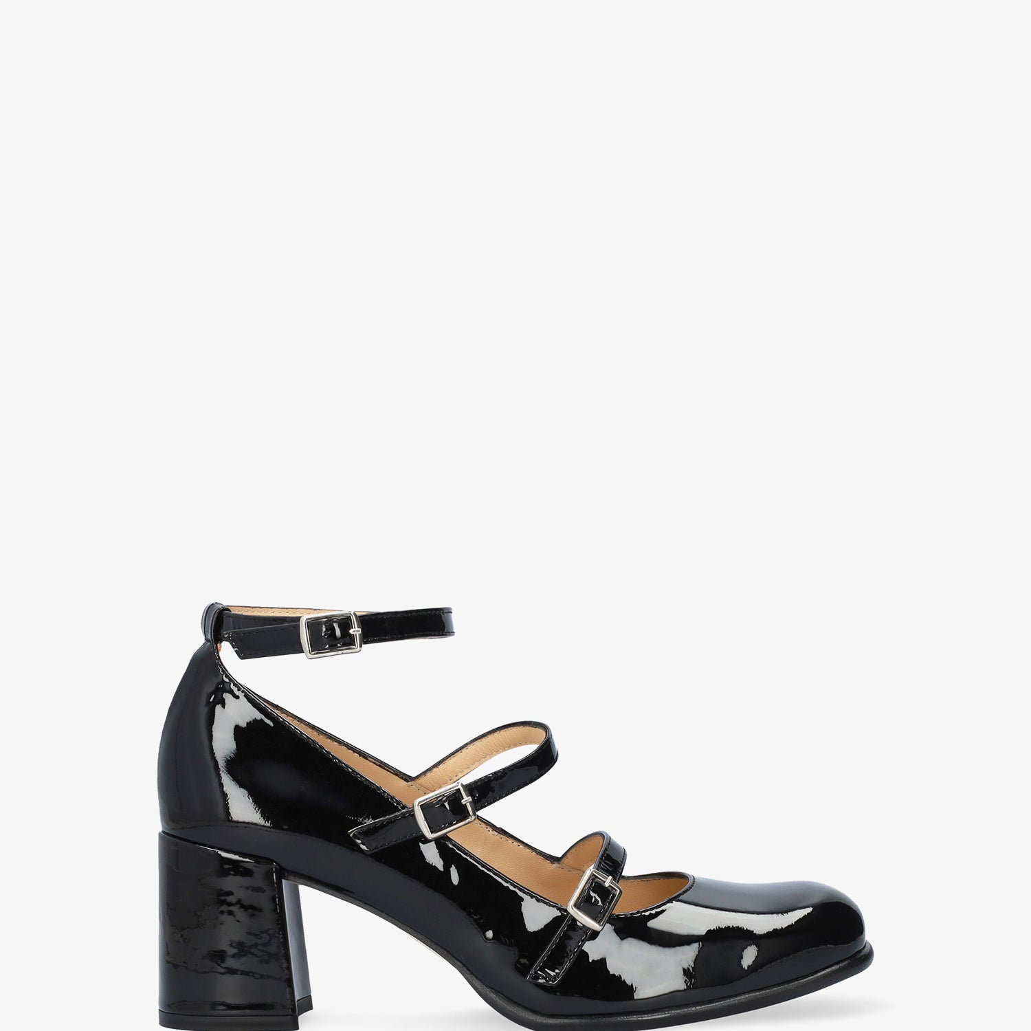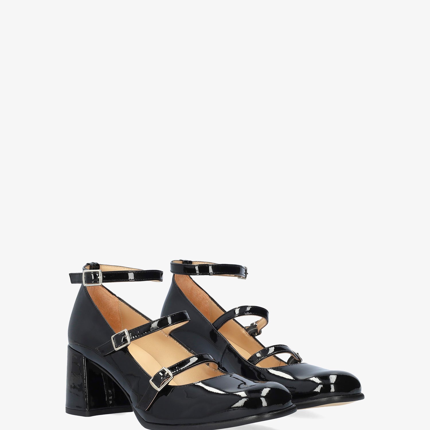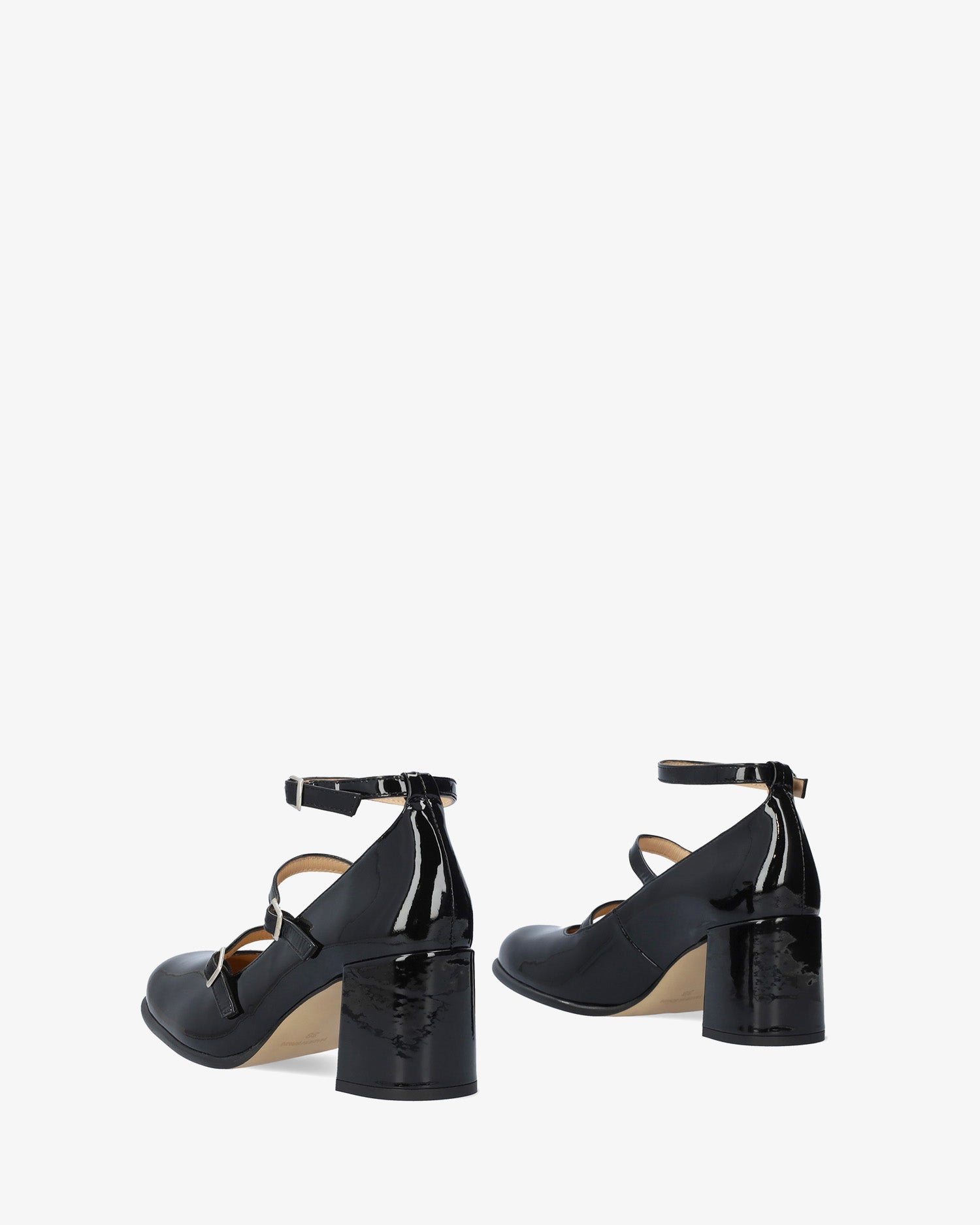 Chaussure de style Mary Jane en cuir verni noir, à bout arrondi et à trois brides élastiques du même ton. Ajustement à la cheville et au cou-de-pied, ainsi que boucles latérales métalliques. Doublure intérieure en cuir. Talon carré doublé de la même couleur, 6,5 cm pour les petites pointures du 32 au 35 et 7 cm pour les grandes pointures du 42 au 45. Fabriquée en Espagne.