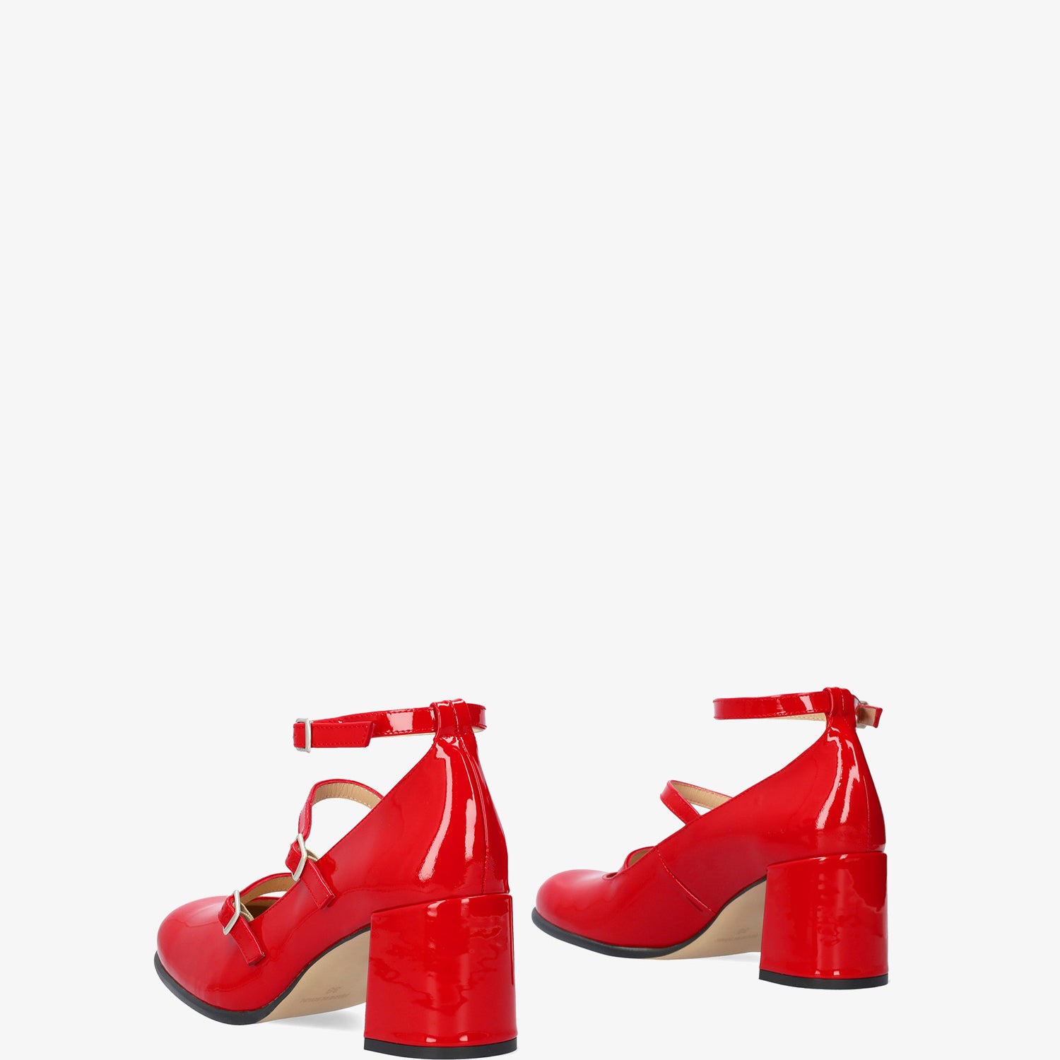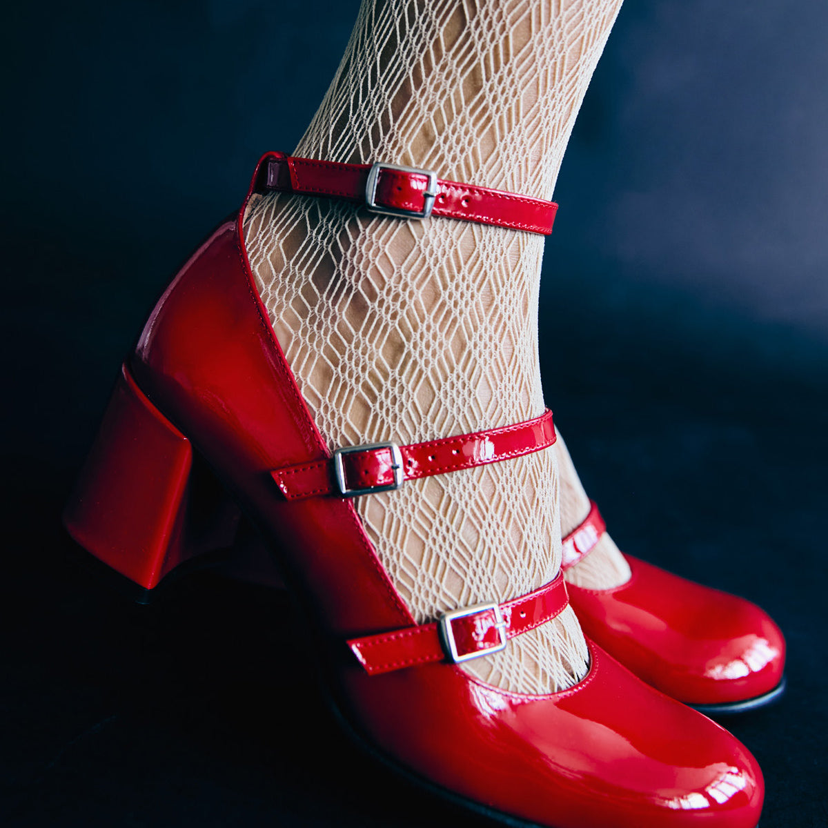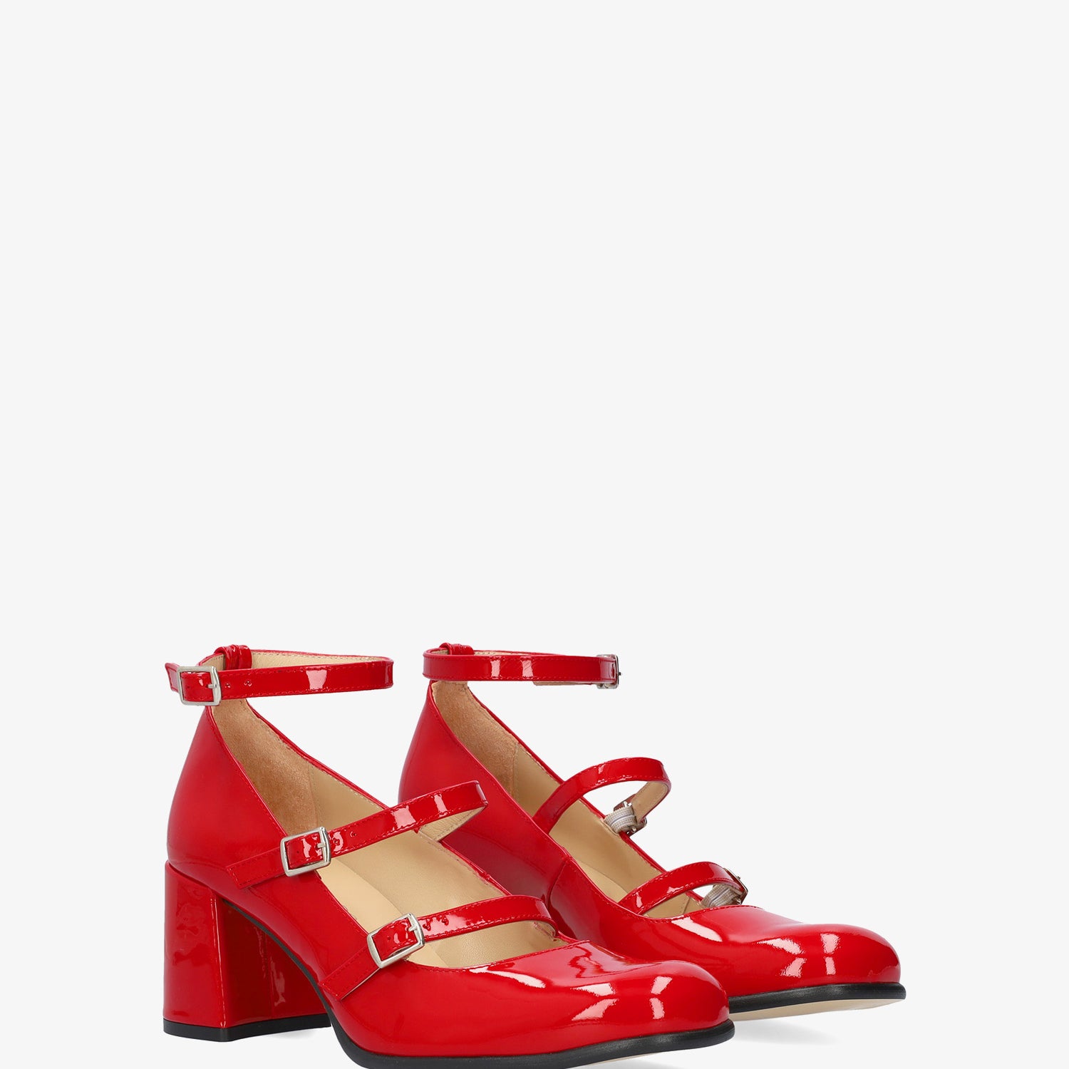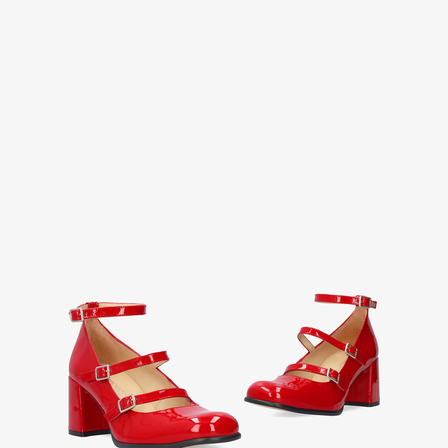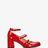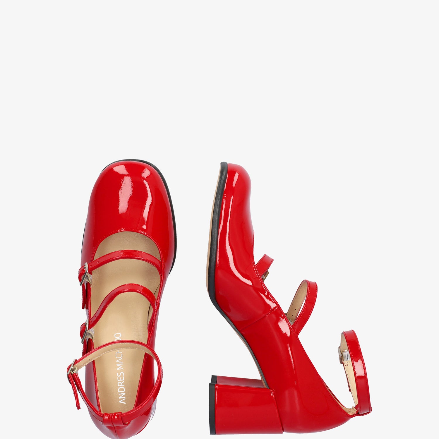 Chaussure de style Mary Jane en cuir verni rouge, à bout arrondi et à trois brides élastiques du même ton. Ajustement à la cheville et au cou-de-pied, ainsi que boucles latérales métalliques. Doublure intérieure en cuir. Talon carré doublé de la même couleur, 6,5 cm pour les petites pointures du 32 au 35 et 7 cm pour les grandes pointures du 42 au 45. Fabriquée en Espagne.