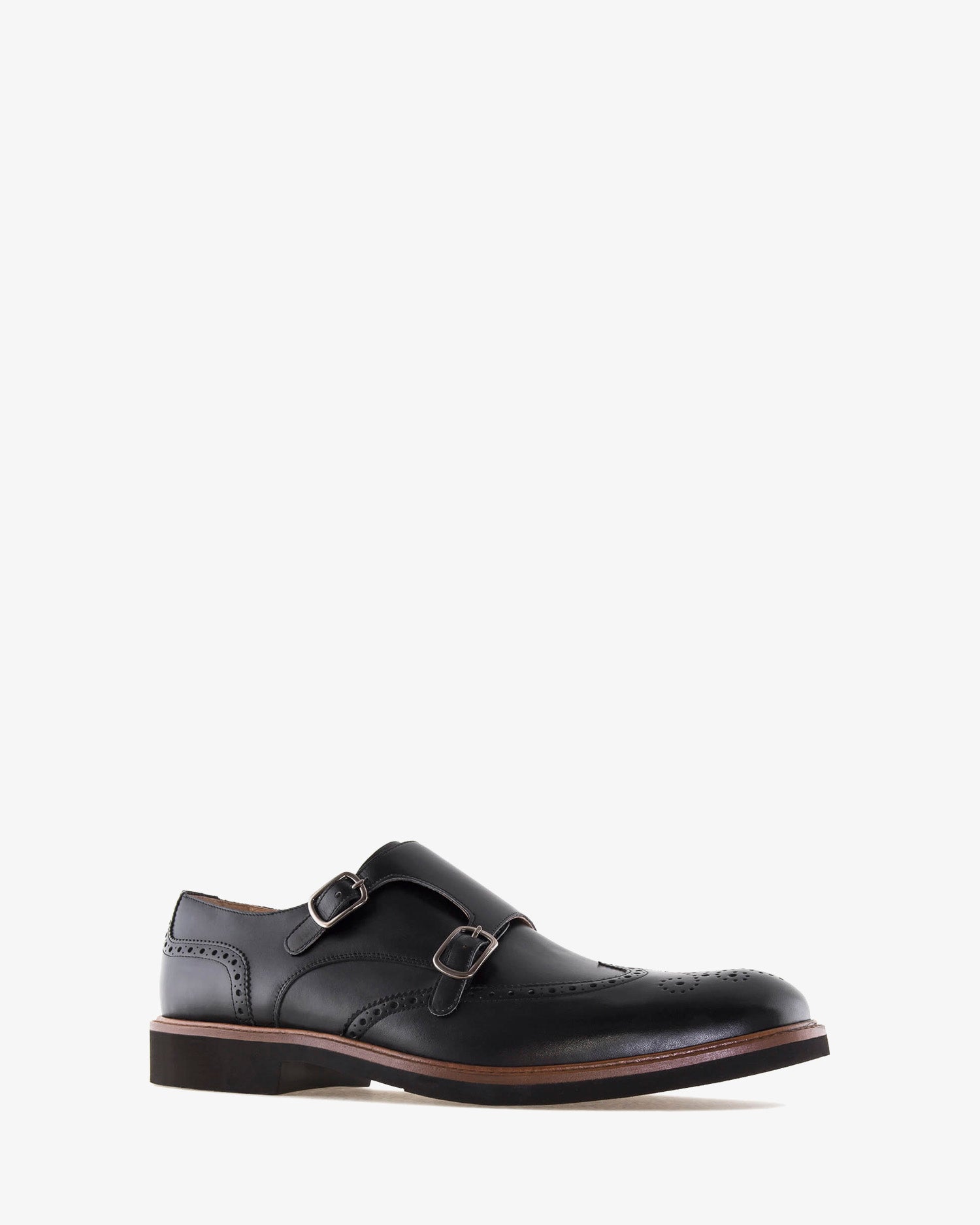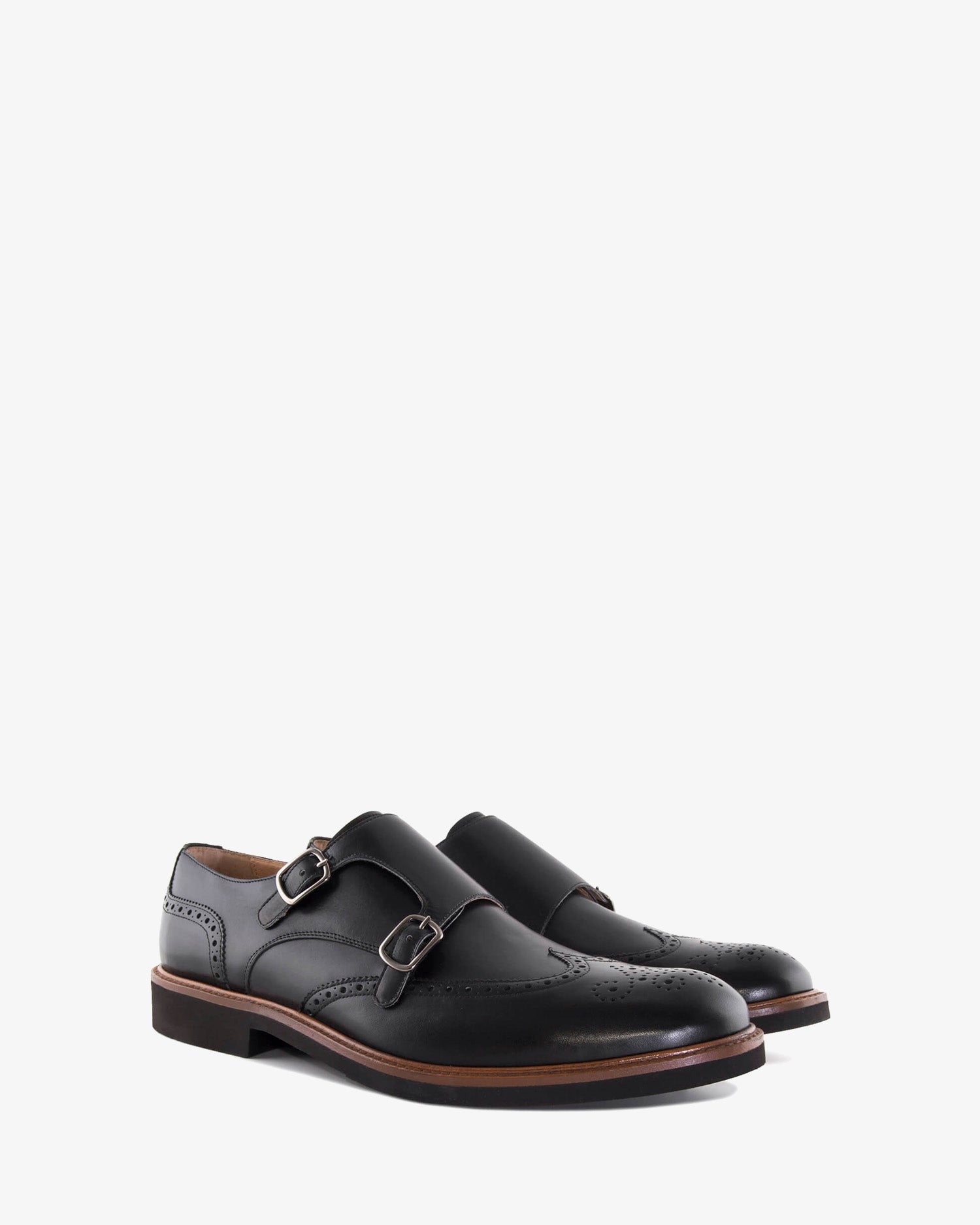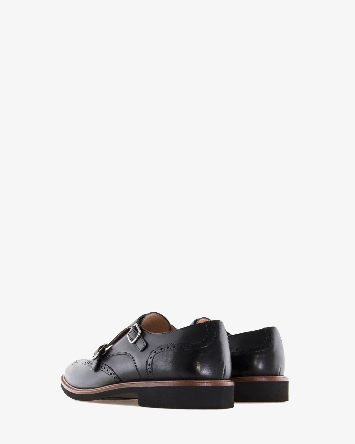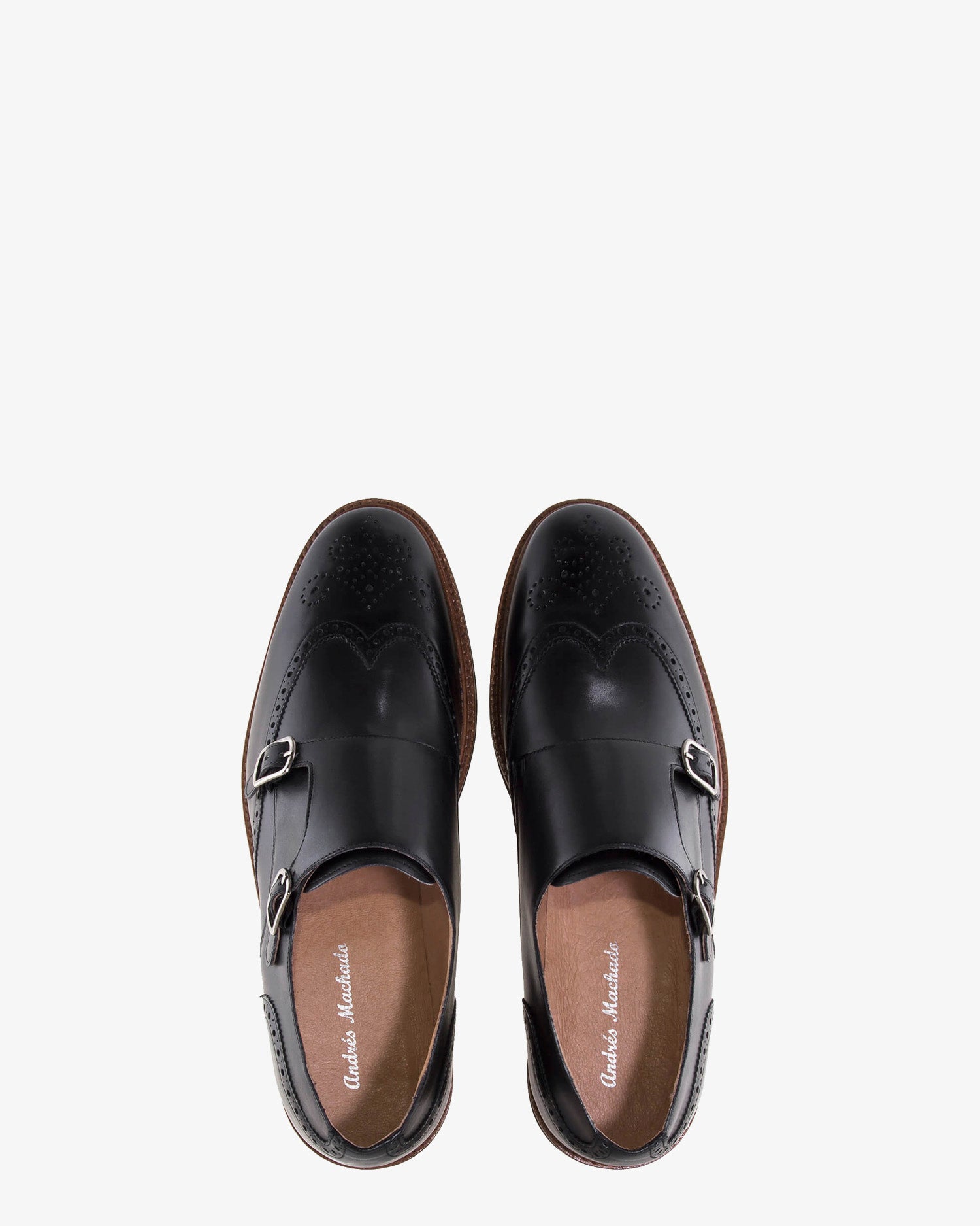 Chaussures en cuir de couleur Noir. Chaussures Type monk, rabat avec deux boucles métalliques avec élastiques. Perforations décoratives sur la tige. Semelle de couleur Noir. Petites Pointures du 37 au 40. Grandes pointures du 47 au 50. Fabrication Espagnole.