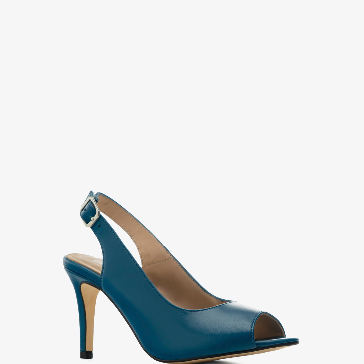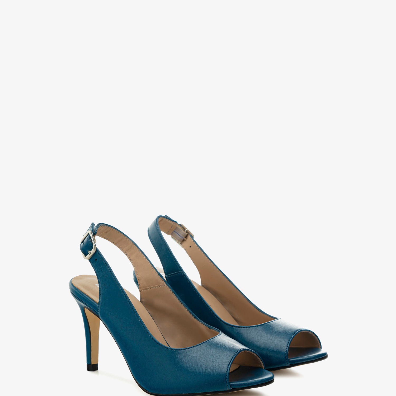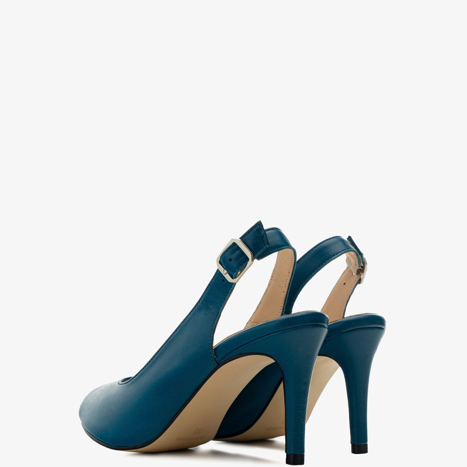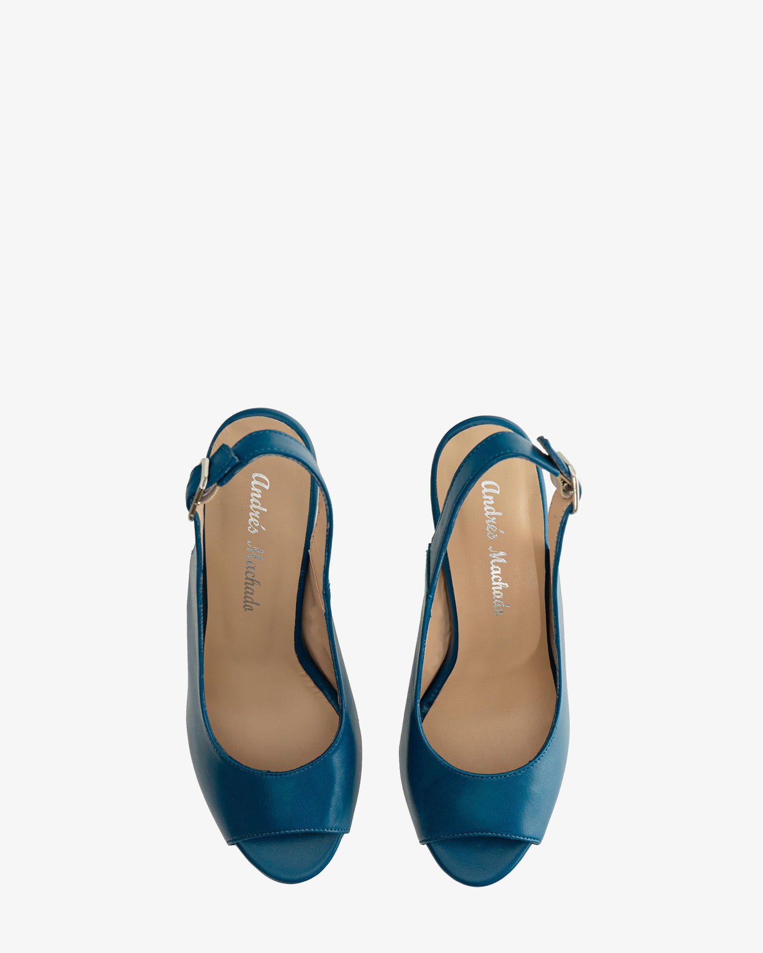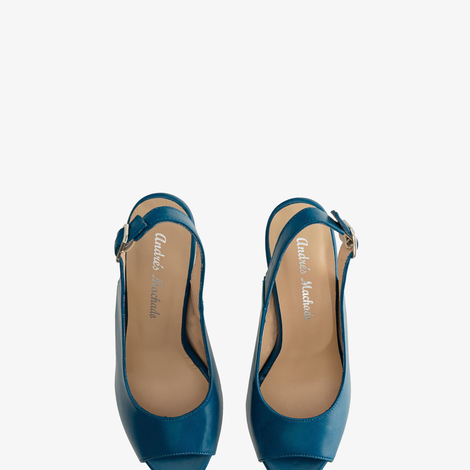 Chaussures talons en cuir couleur azul ouvertes à l´arrière.