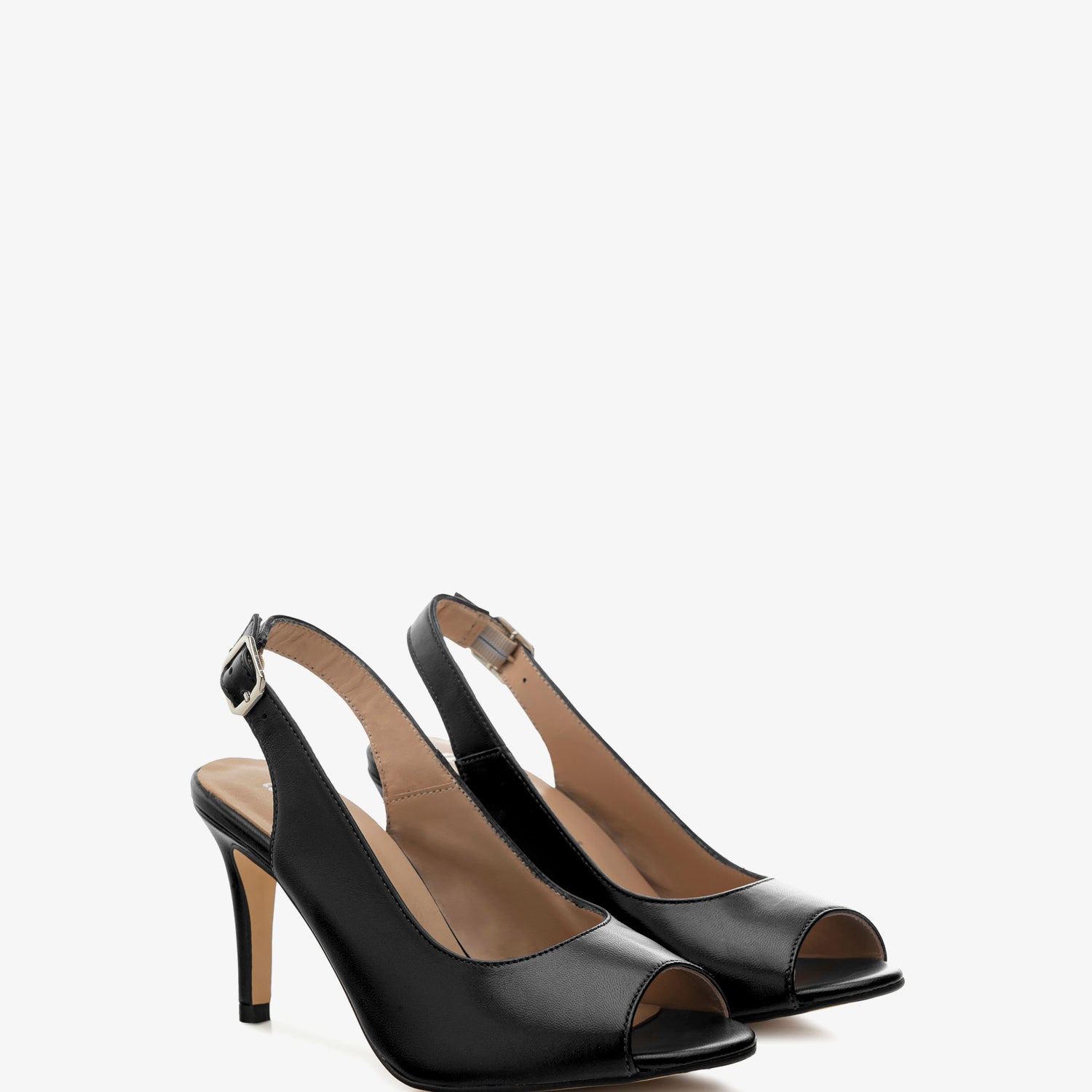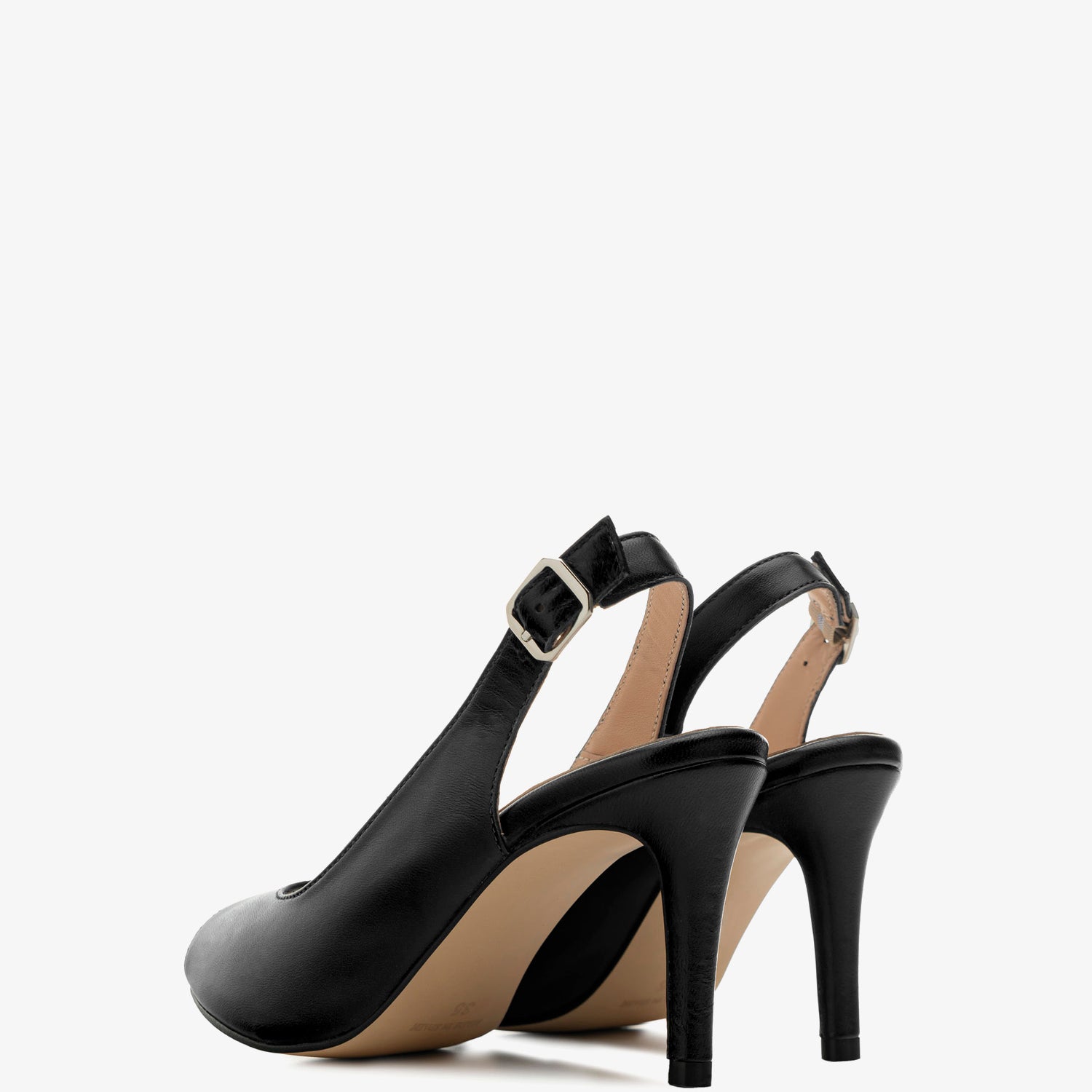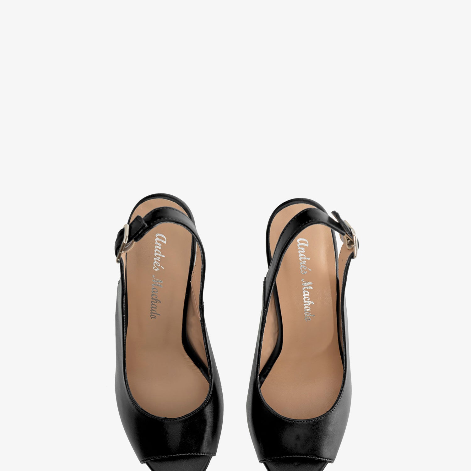Chaussures talons en cuir couleur noir ouvertes à l´arrière.