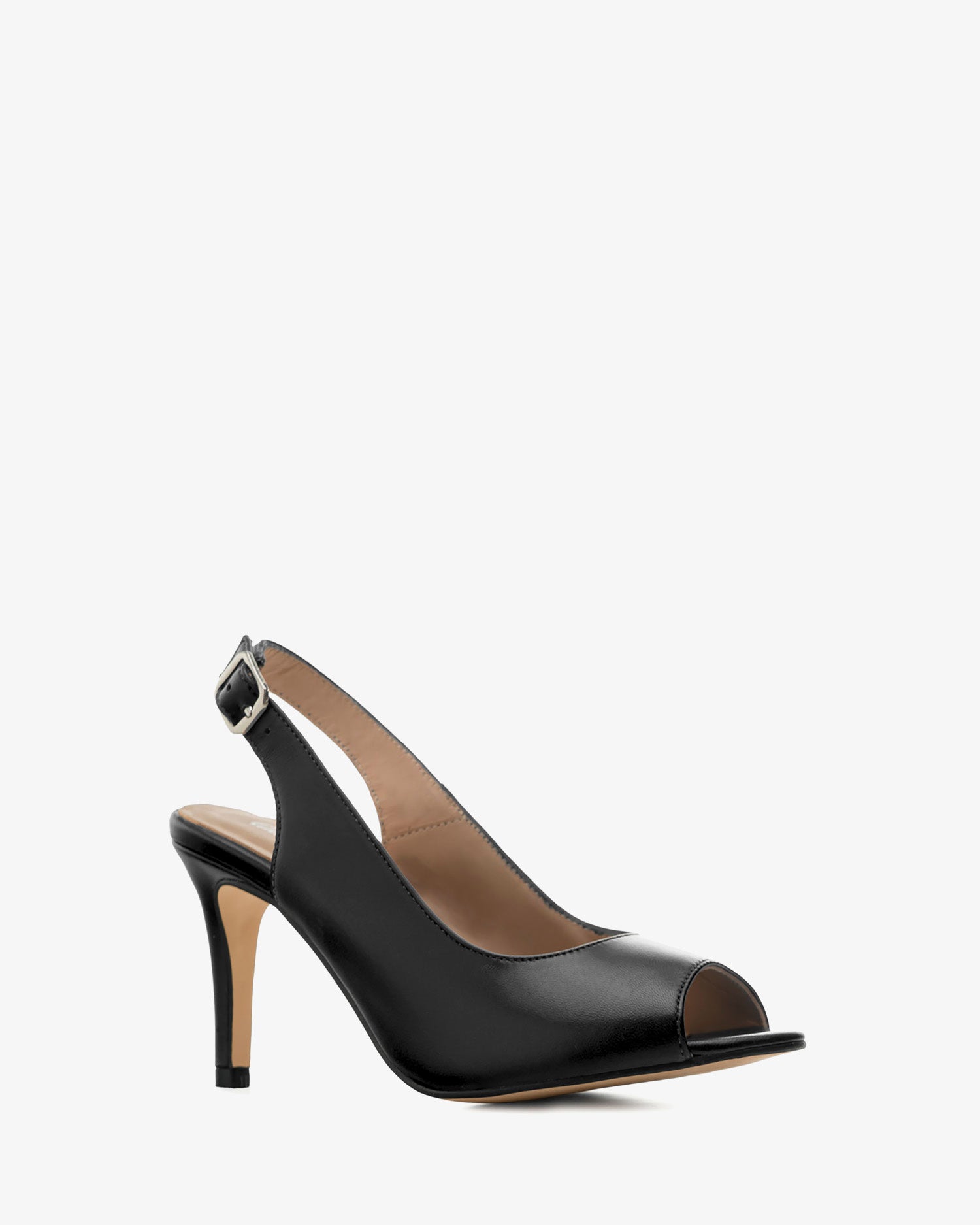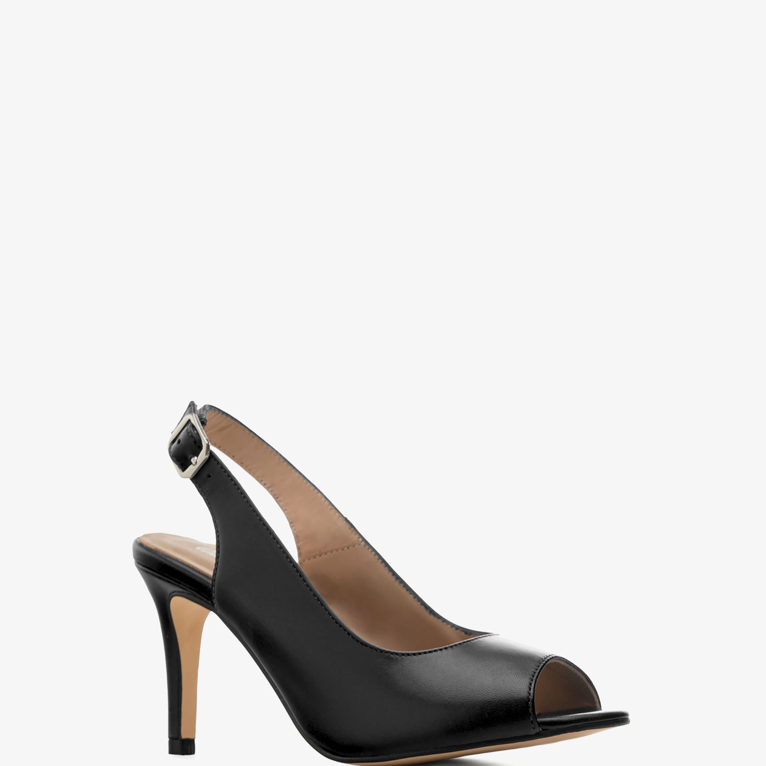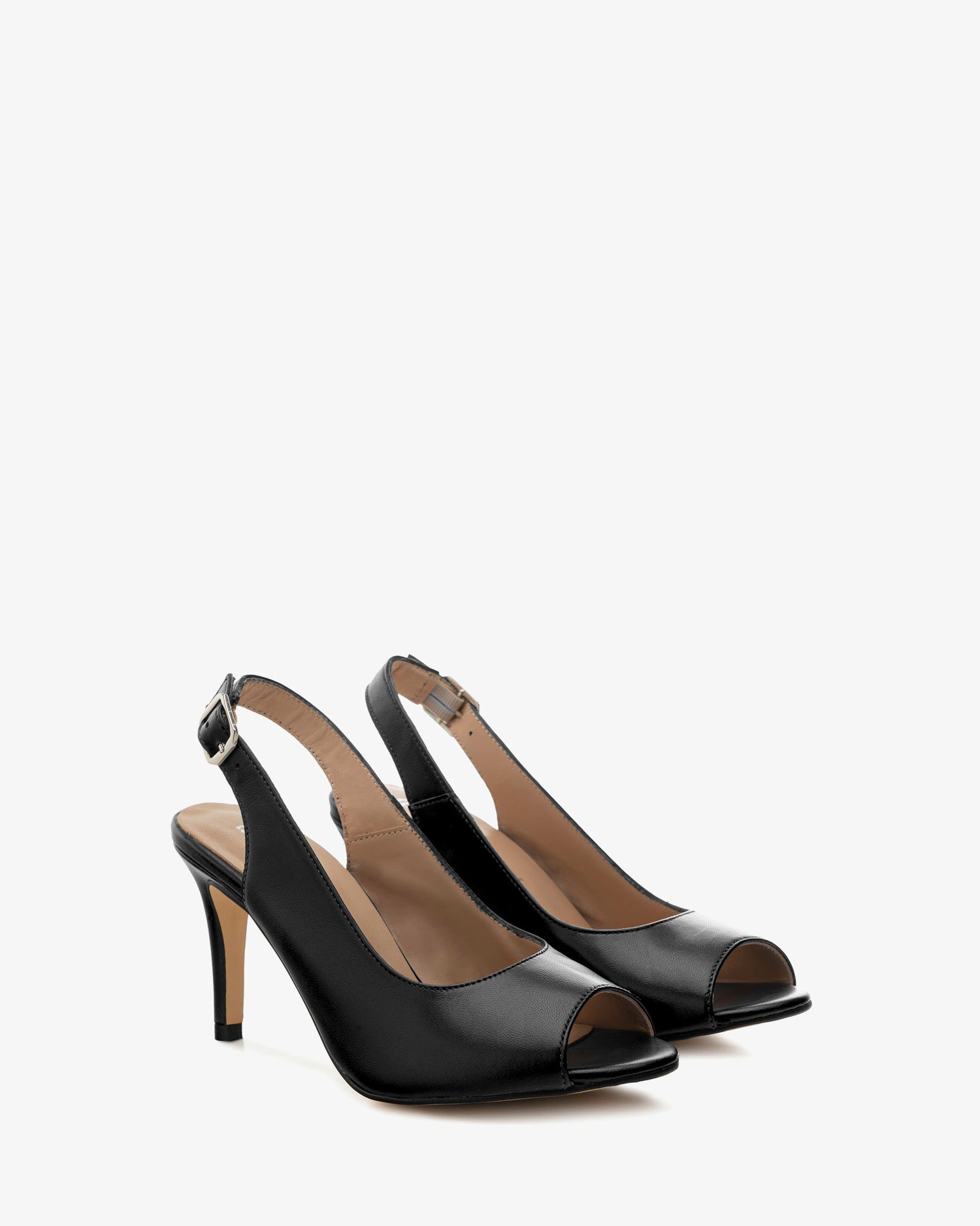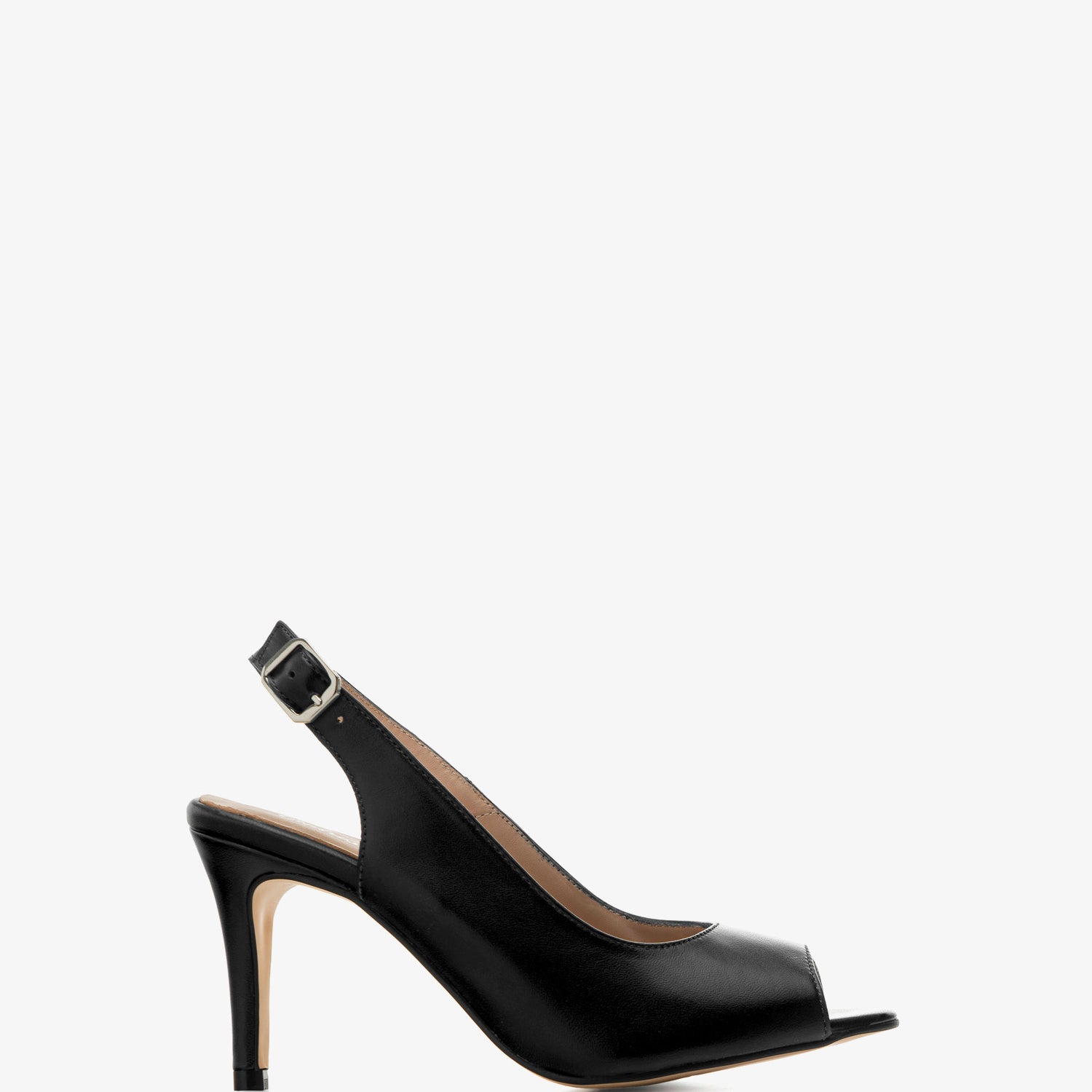 Chaussures talons en cuir couleur noir ouvertes à l´arrière.