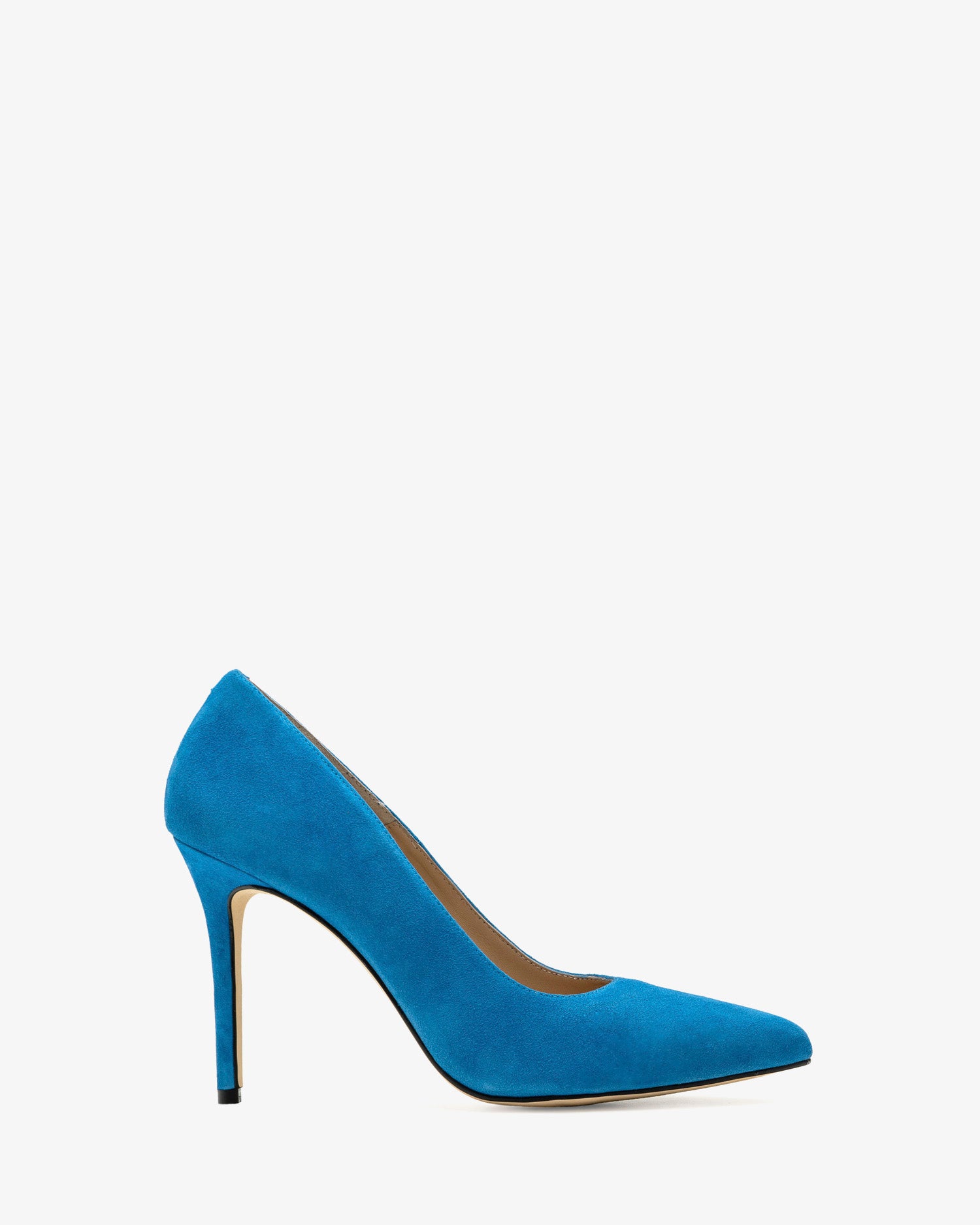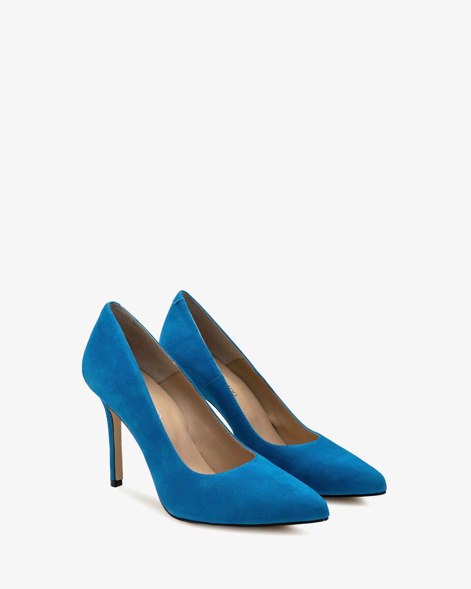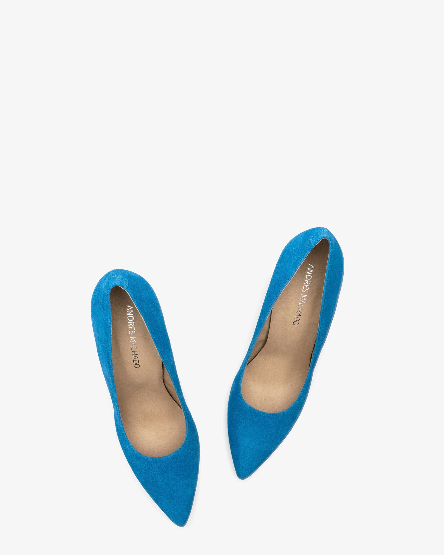 Chaussures à talons en daim de couleur Bleu. Doublure et semelle intérieure confectionnées en cuir. Bout pointu. Talons hauts et fins. Talons de 9,5 cm pour les petites pointures de la 32 à la 35. Talons de 11,5 cm pour les grandes pointures de la 42 à la 45. Fabriquées en Espagne