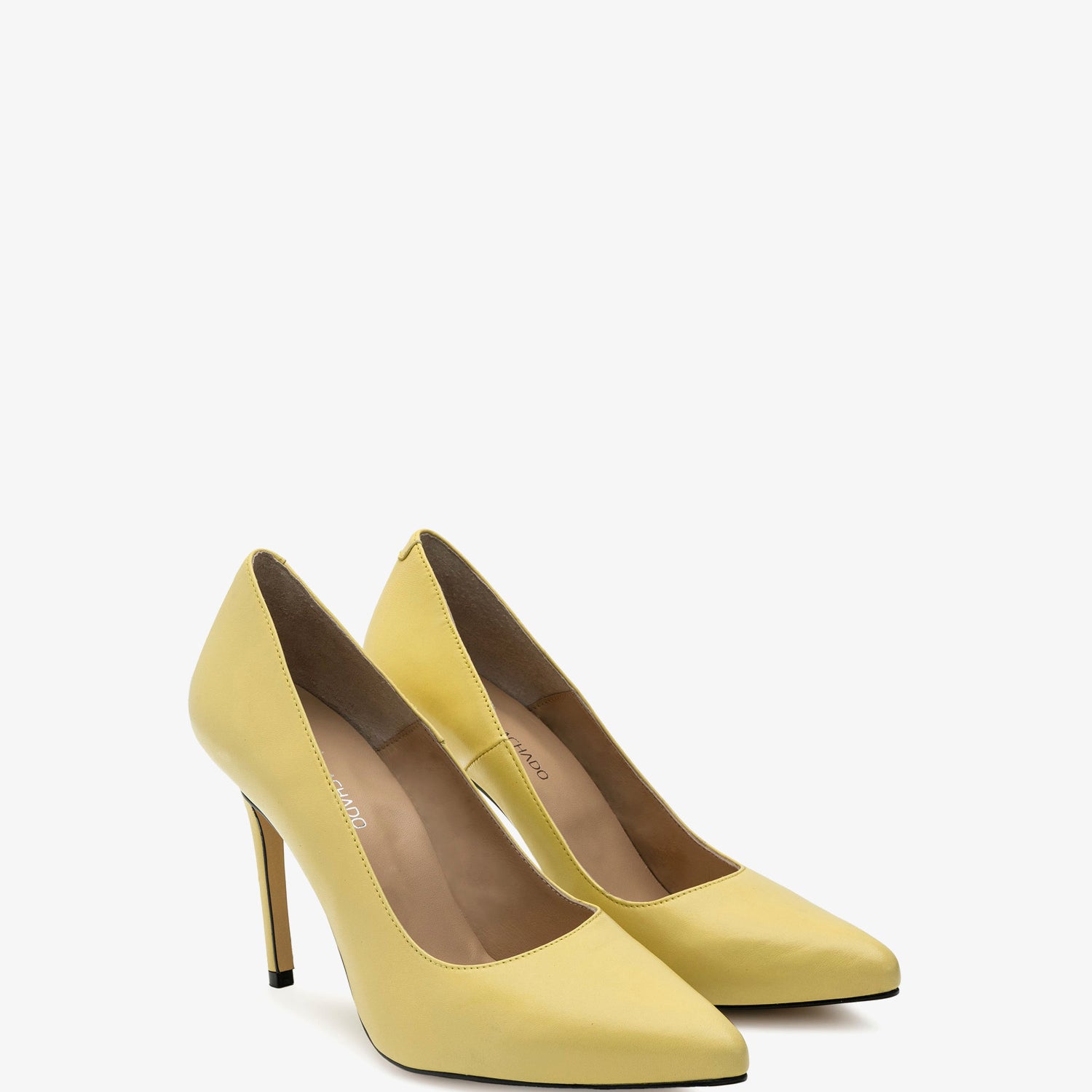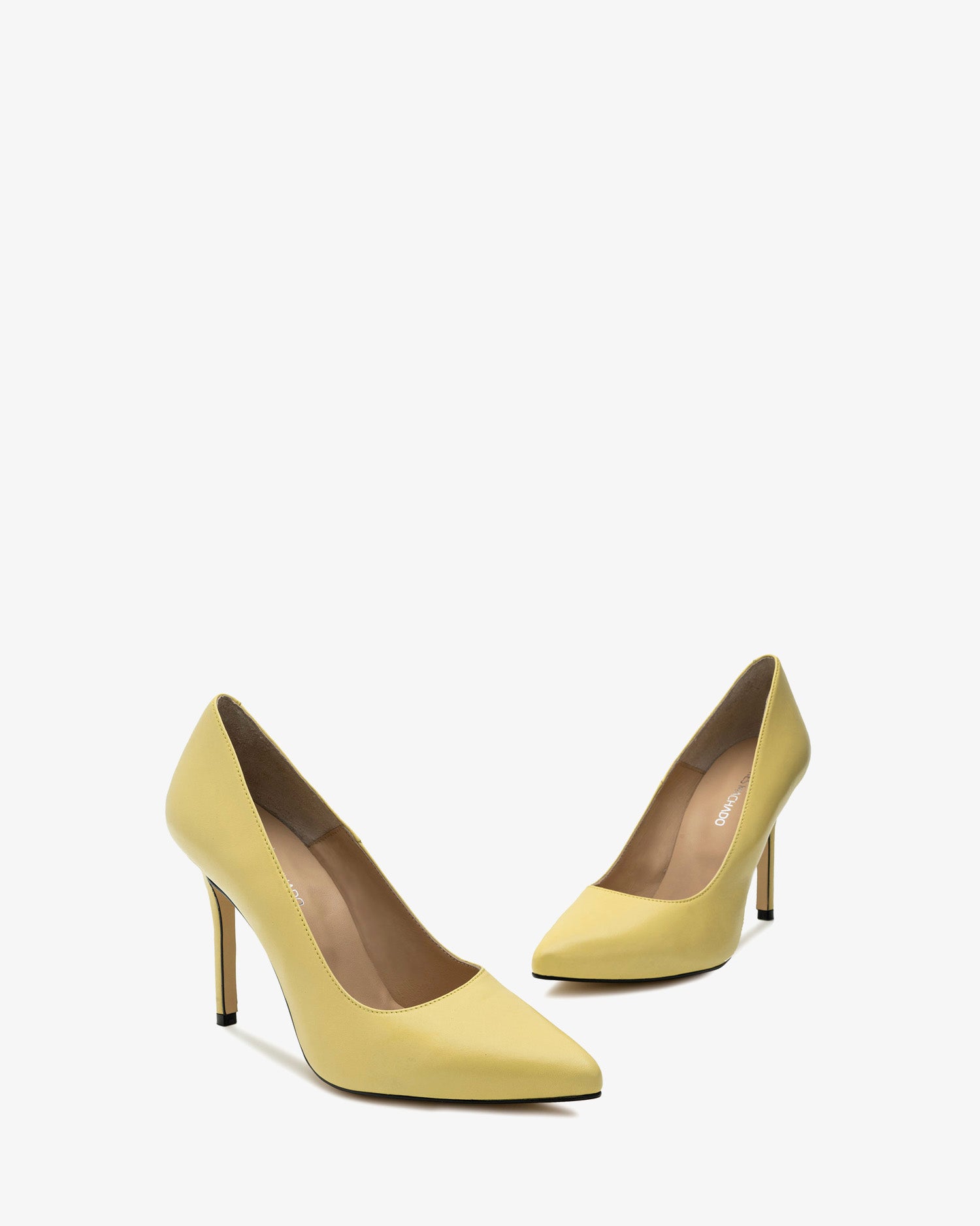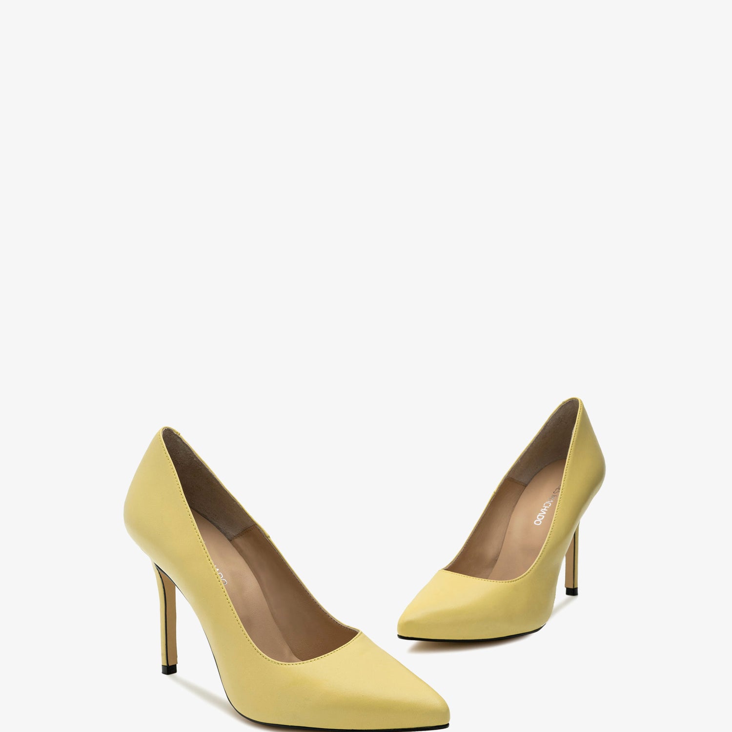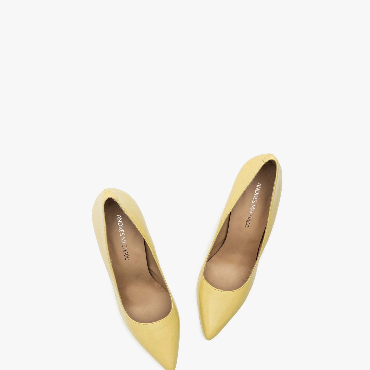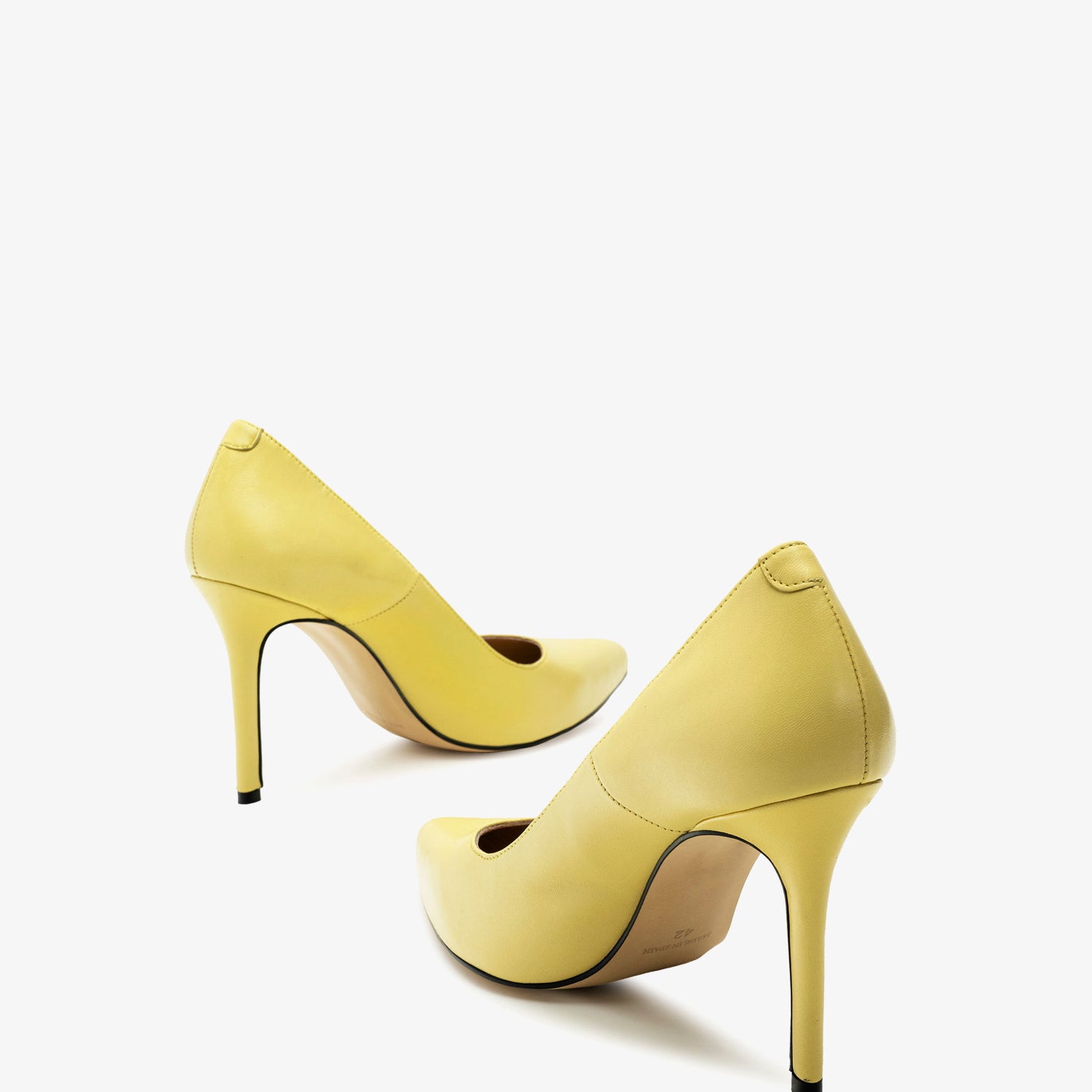 Chaussures à talons en cuir de couleur Jaune. Doublure et semelle intérieure confectionnées en cuir. Bout pointu. Talons hauts et fins. Talons de 9,5 cm pour les petites pointures de la 32 à la 35. Talons de 11,5 cm pour les grandes pointures de la 42 à la 45. Fabriquées en Espagne