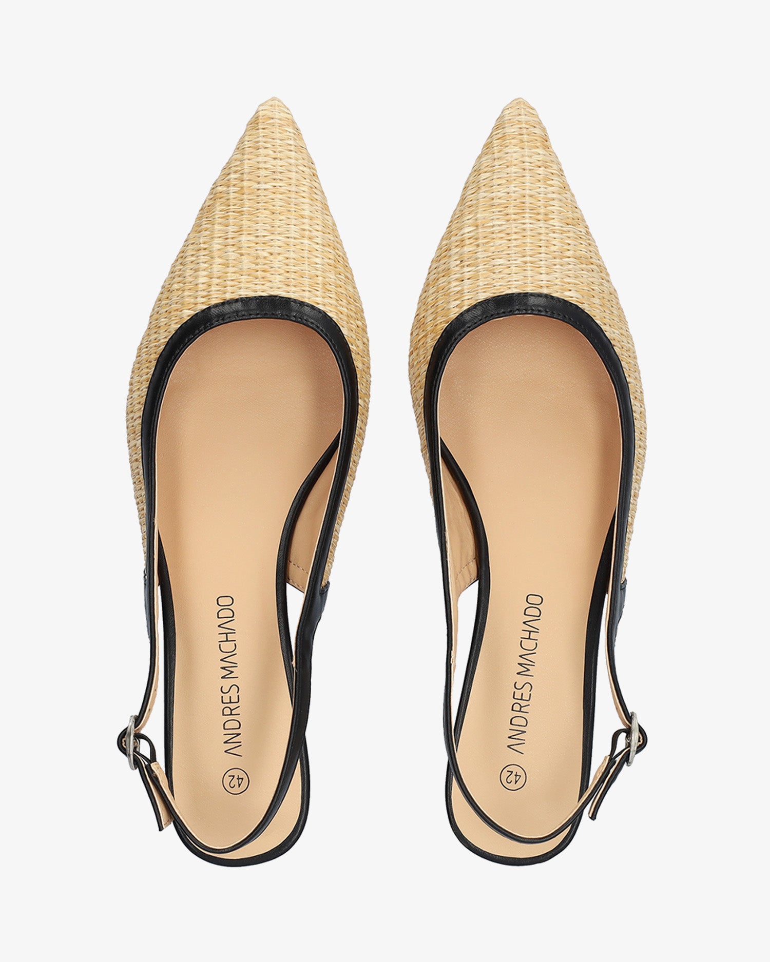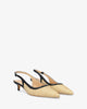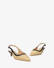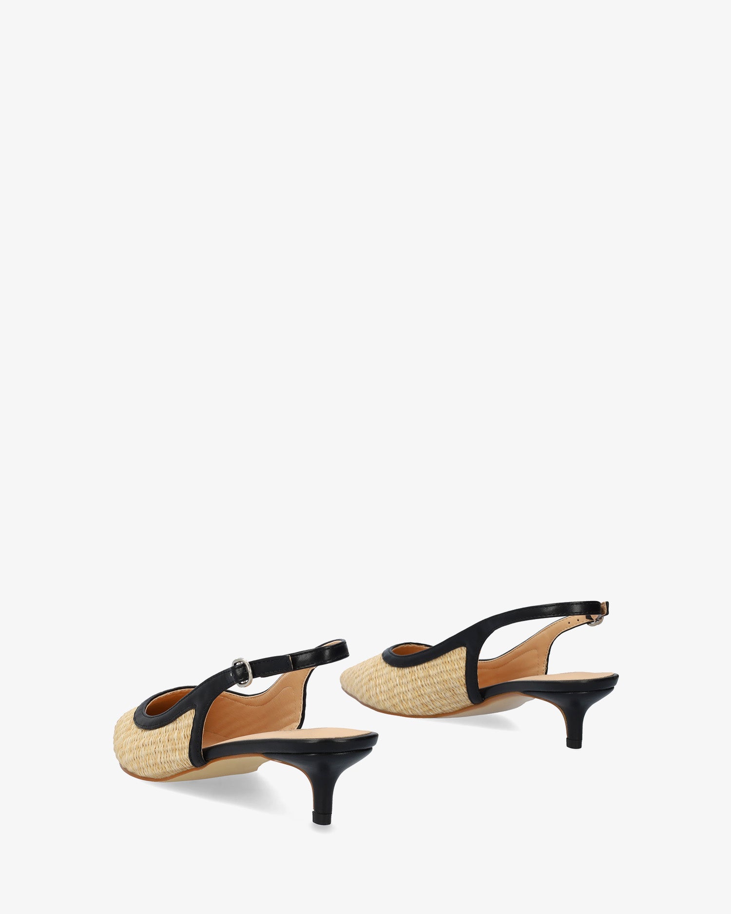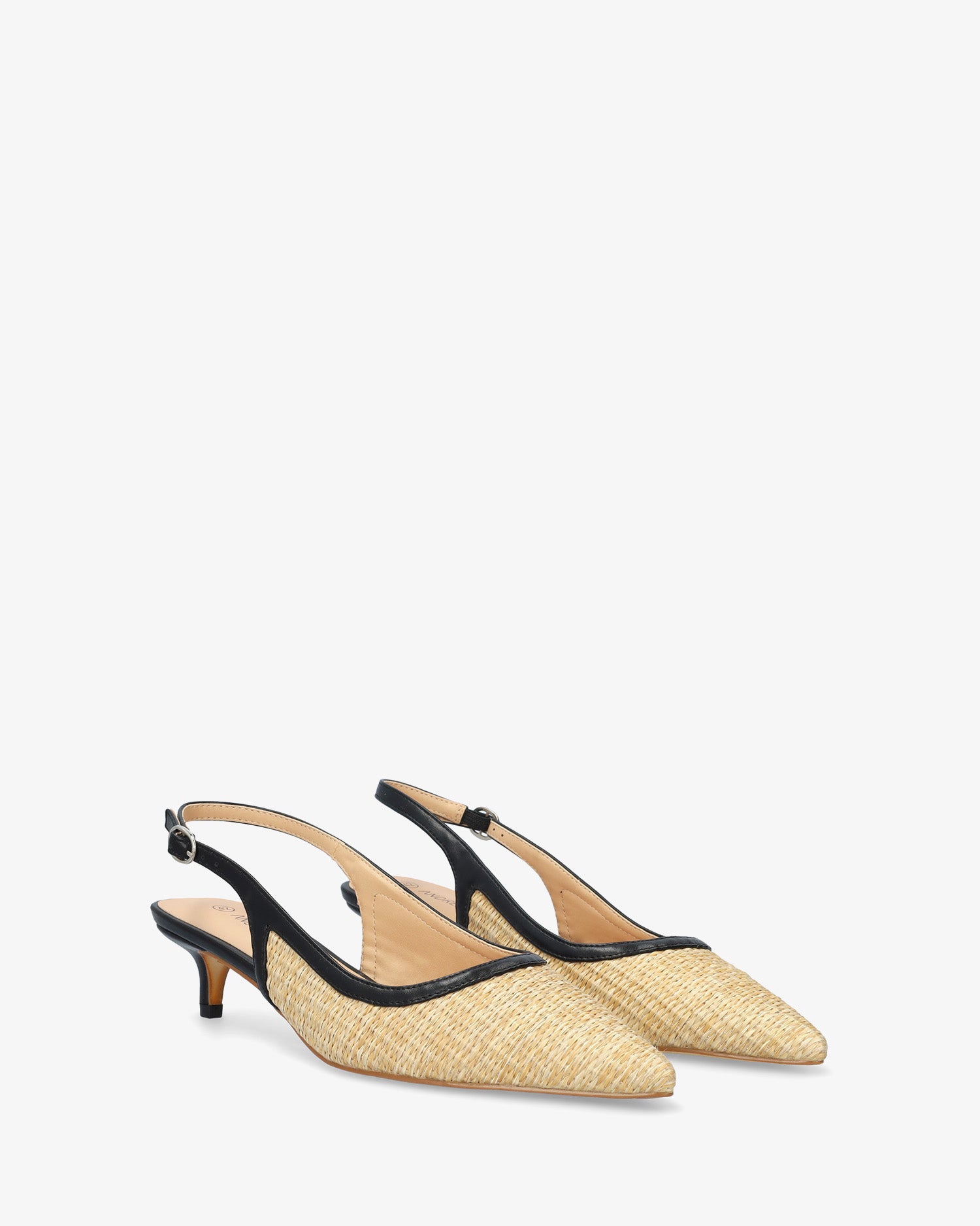 Escarpin ouvert à l’arrière en raphia synthétique, finition bout pointu, avec bride arrière effet liseré assorti, reliée par une fermeture latérale à boucle métallique. Talon recouvert ton sur ton.