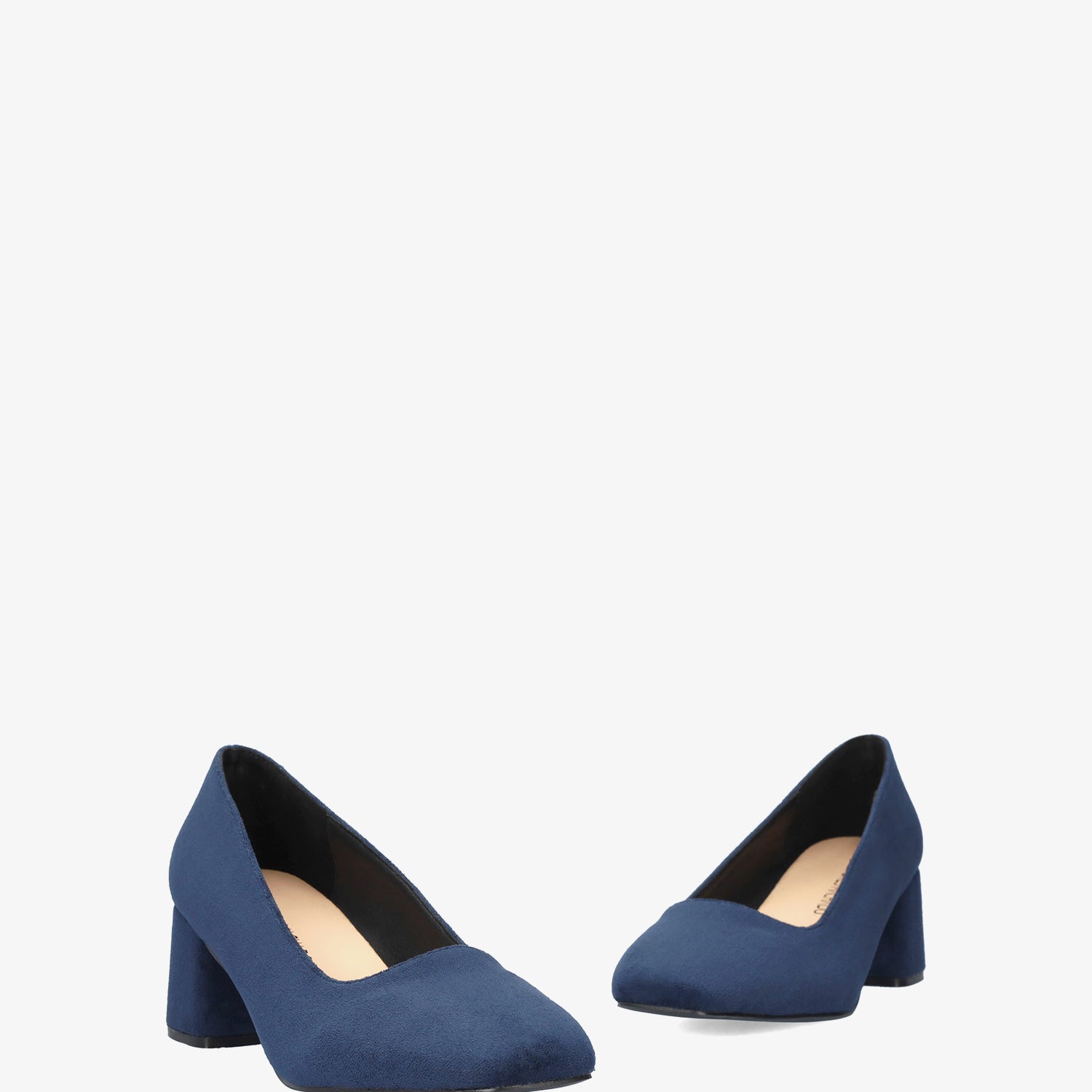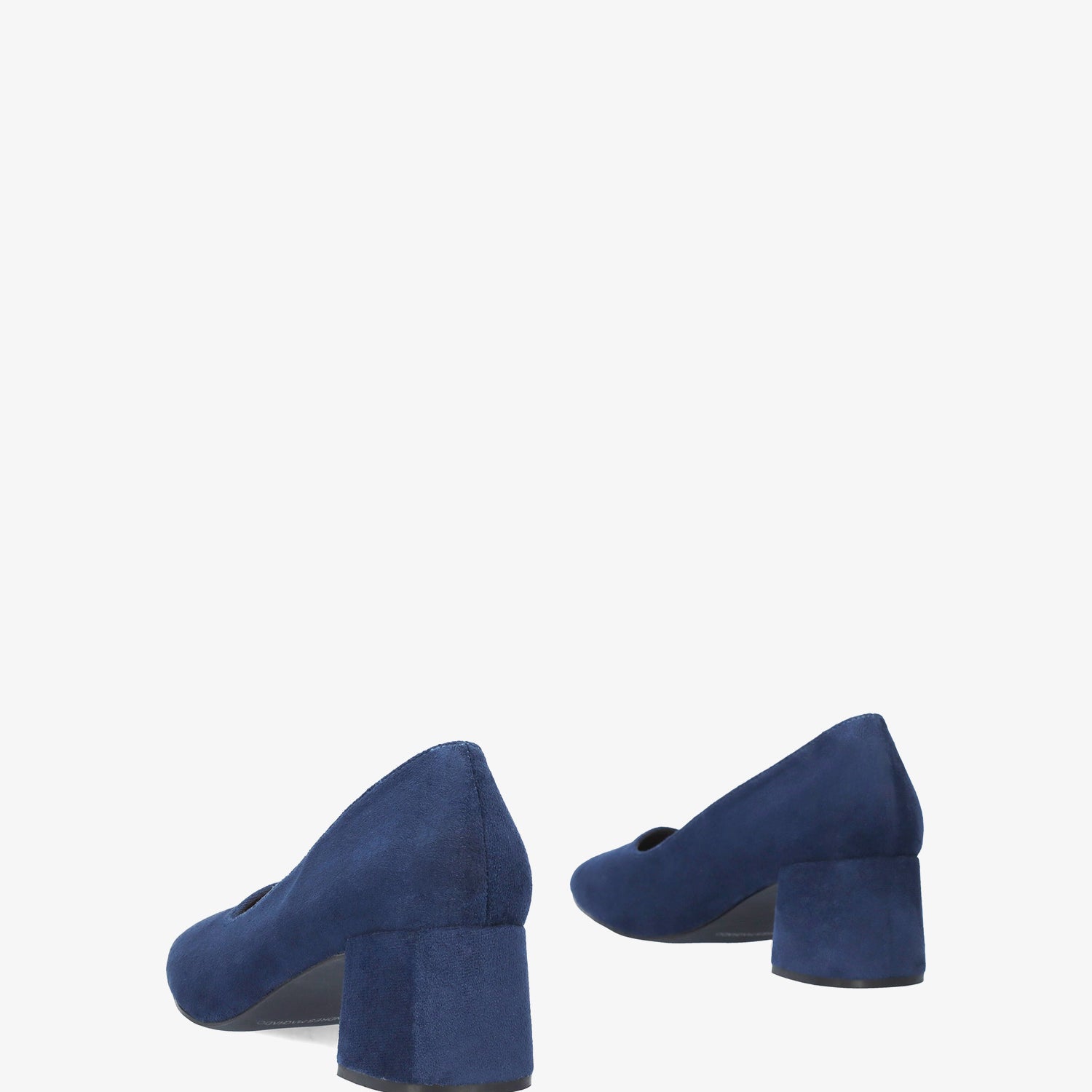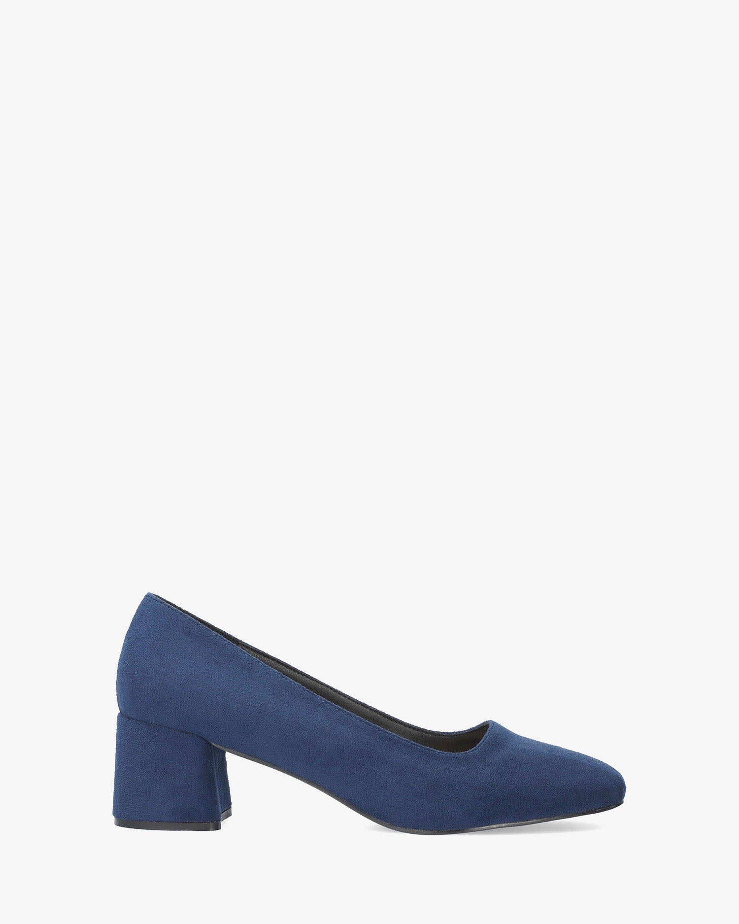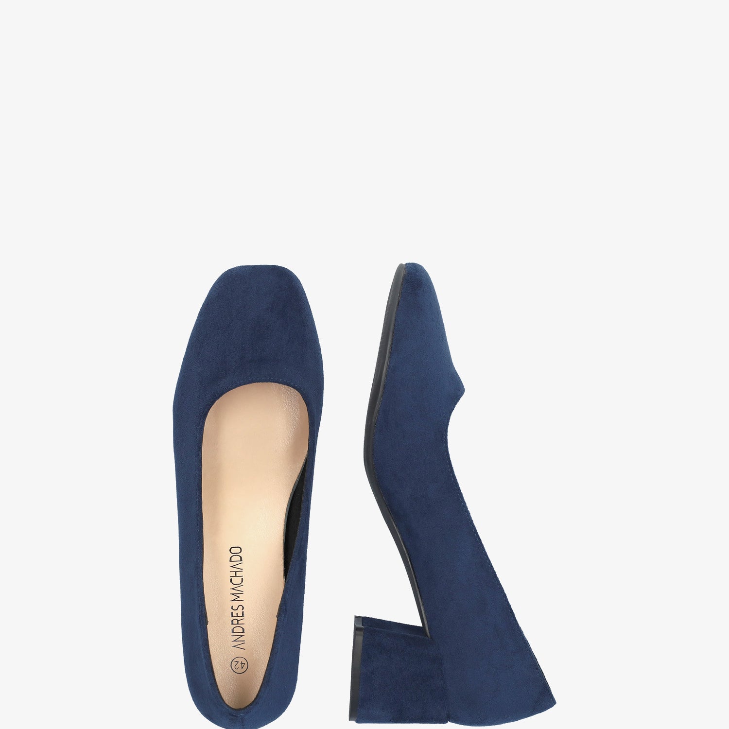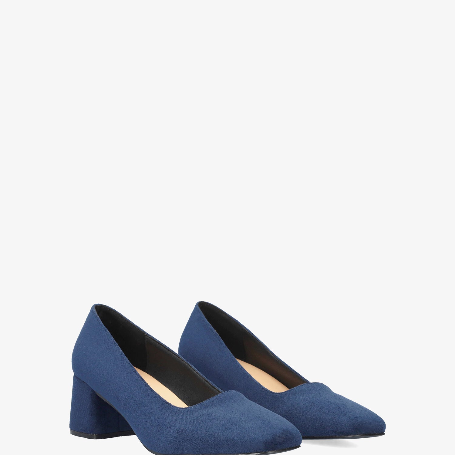 Escarpins à talon en suèdine bleu marine. Bout carré. Talon bloc doublé du même ton, hauteur de 6 cm pour les petites pointures du 32 au 35. Talon de 6 cm pour les grandes pointures du 42 au 46.