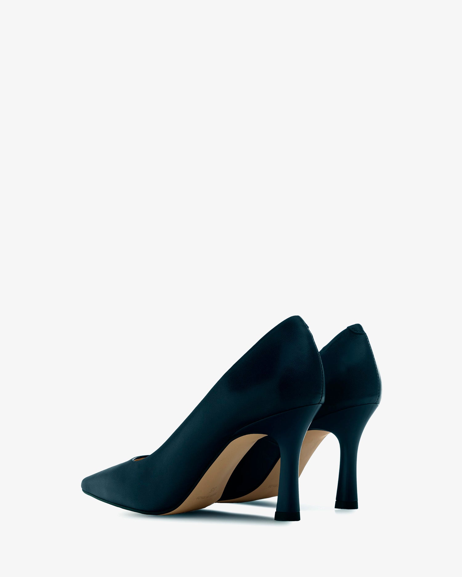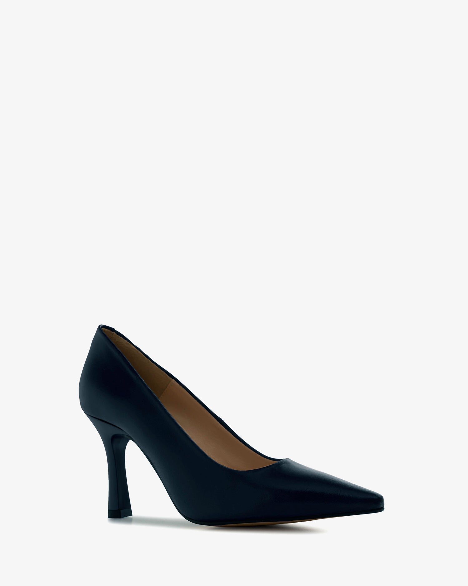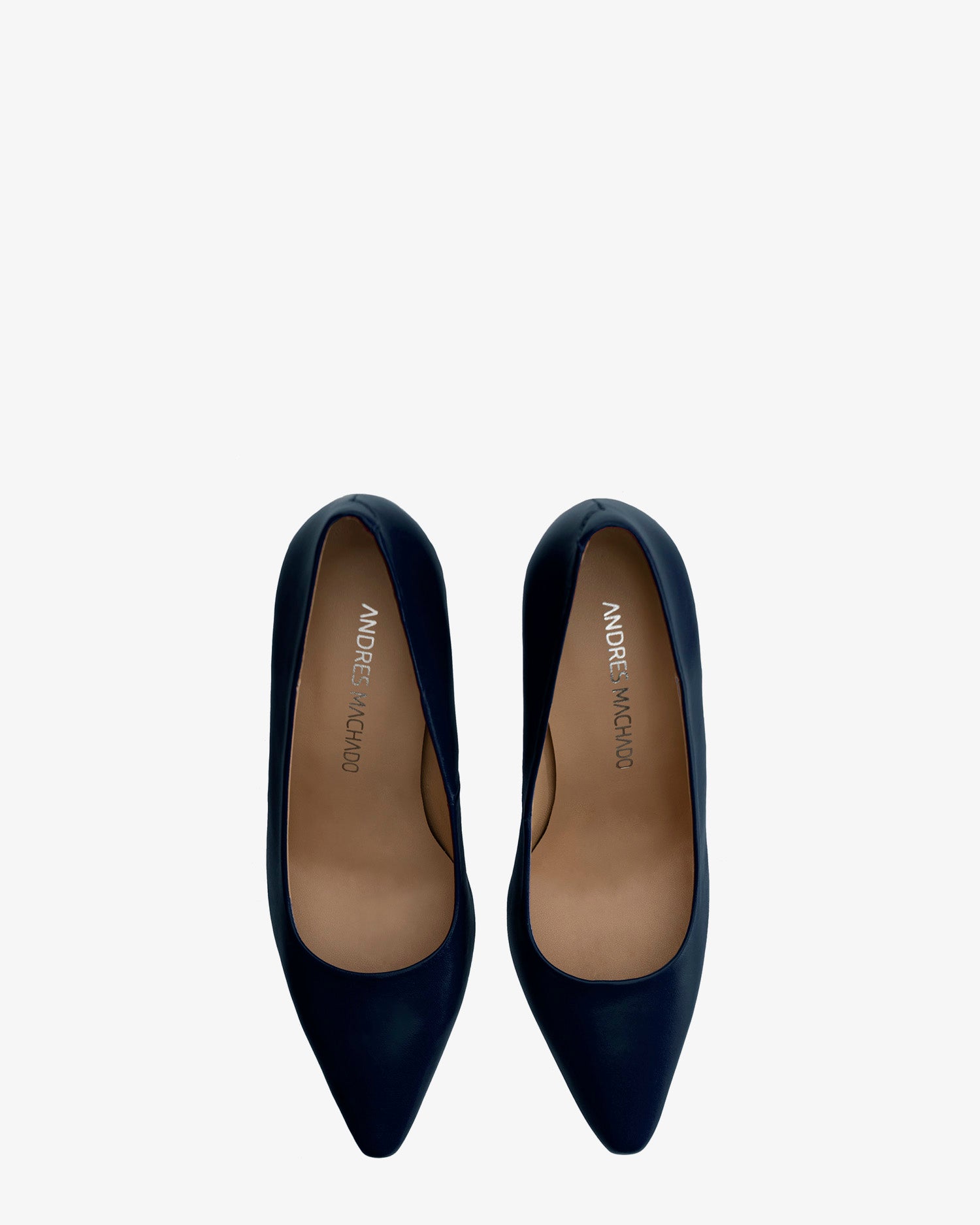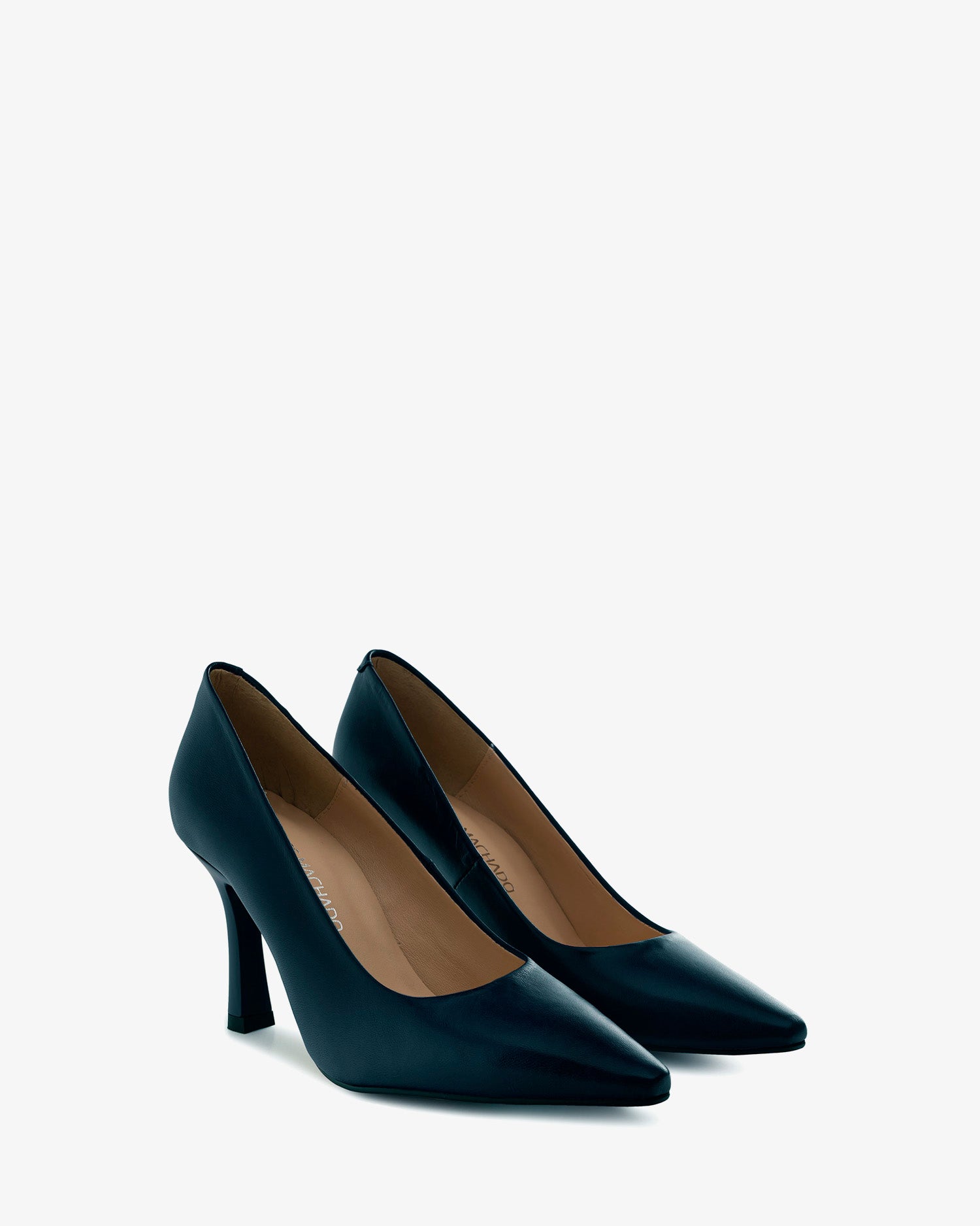 Escarpins en cuir de couleur Bleu Marine. Doublure en cuir et bout pointu. Talon fin de couleur Bleu Marine de 8 cm de haut pour les petites pointures du 32 au 35. Talon de 9 cm de haut pour les grandes pointures du 42 au 45. Fabrication espagnole.