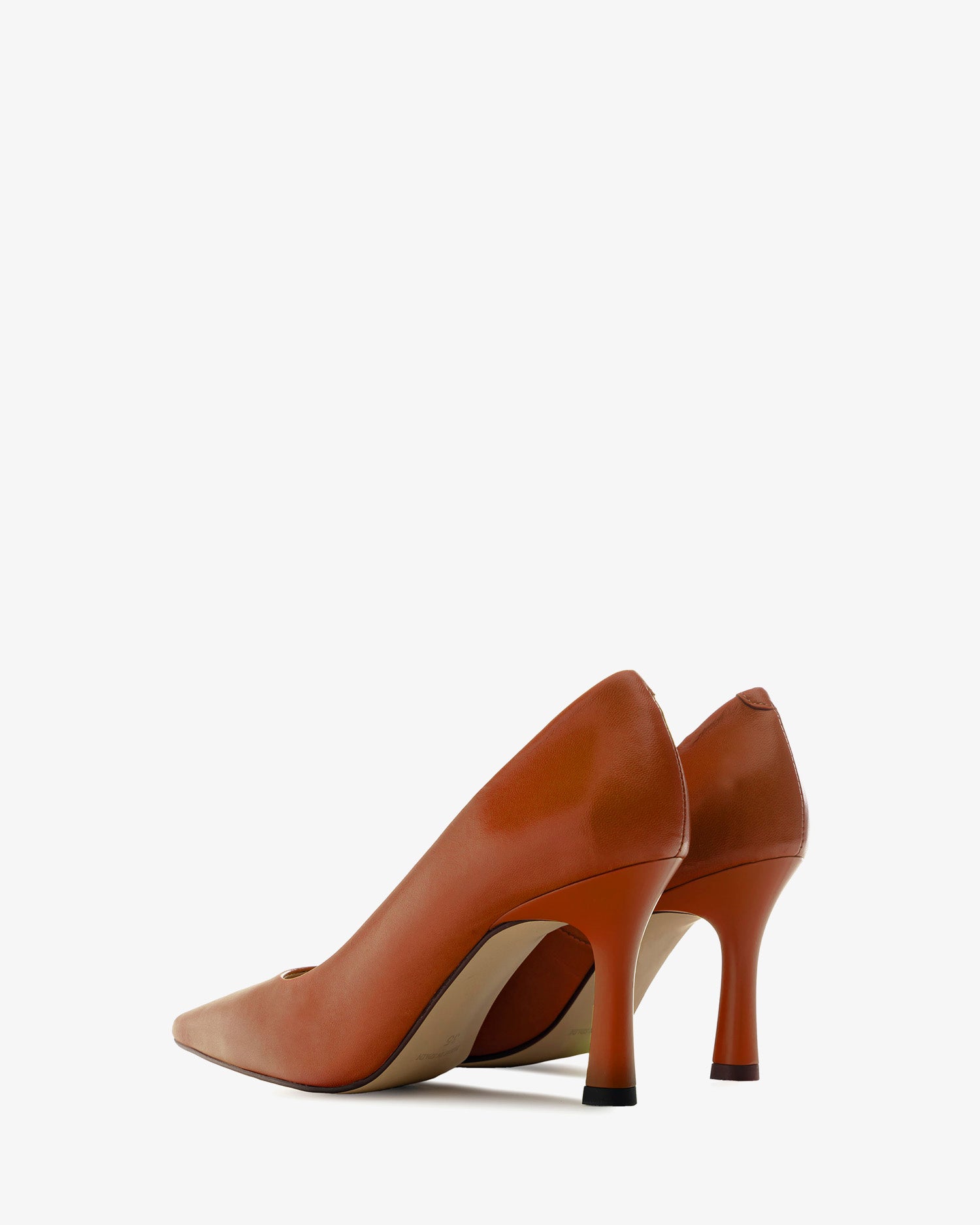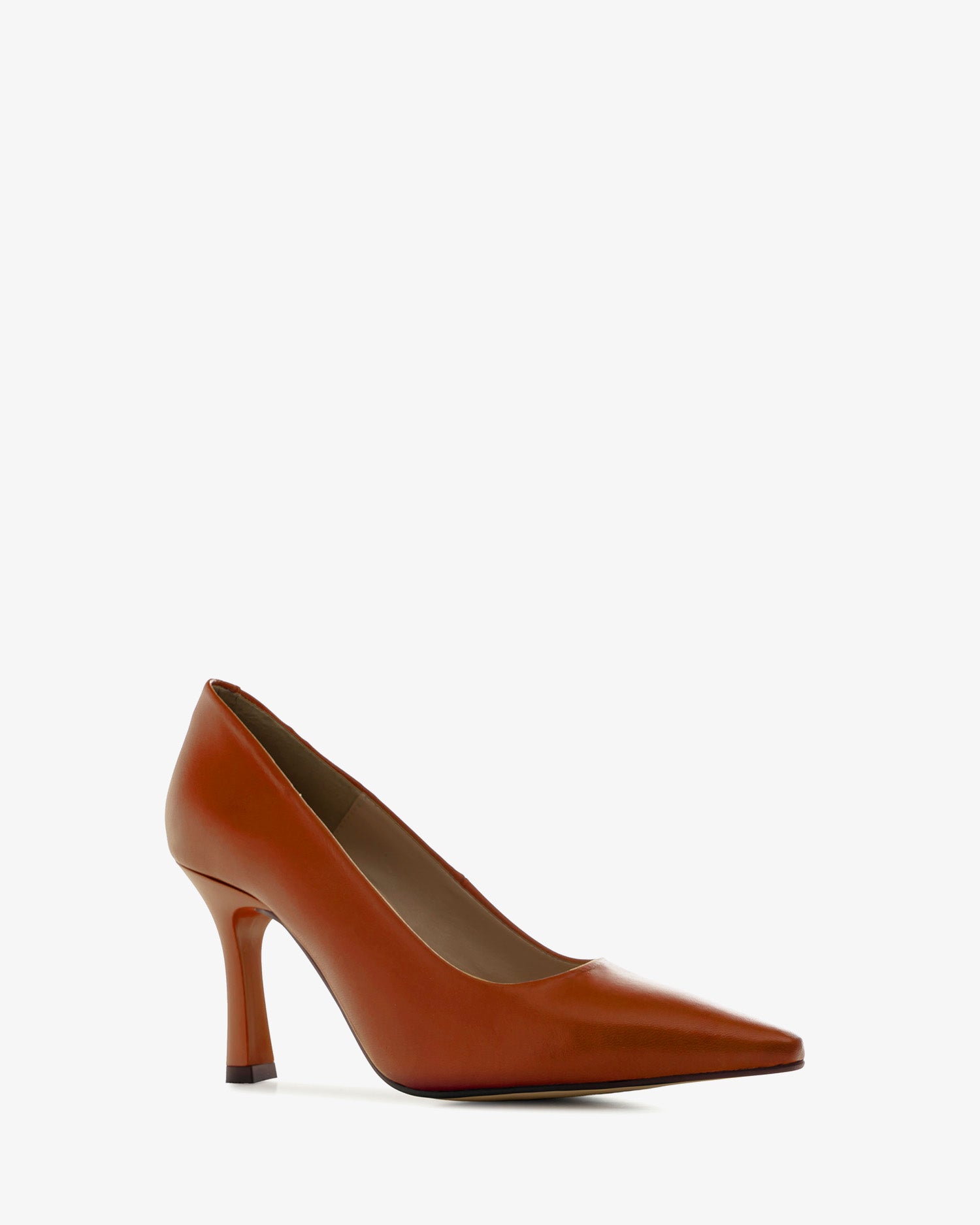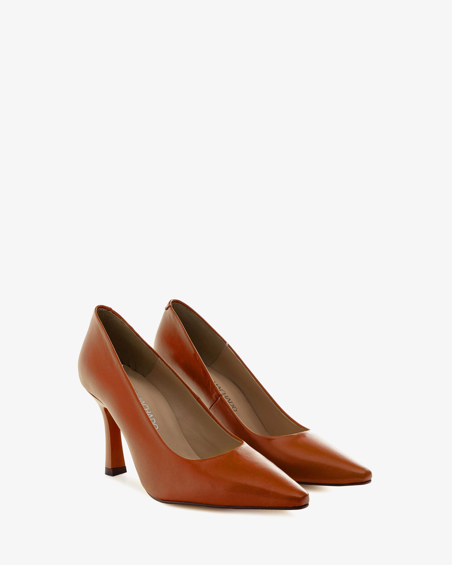 Escarpins en cuir de couleur Brique. Doublure en cuir et bout pointu. Talon fin de couleur Brique de 8 cm de haut pour les petites pointures du 32 au 35. Talon de 9 cm de haut pour les grandes pointures du 42 au 45. Fabrication espagnole.