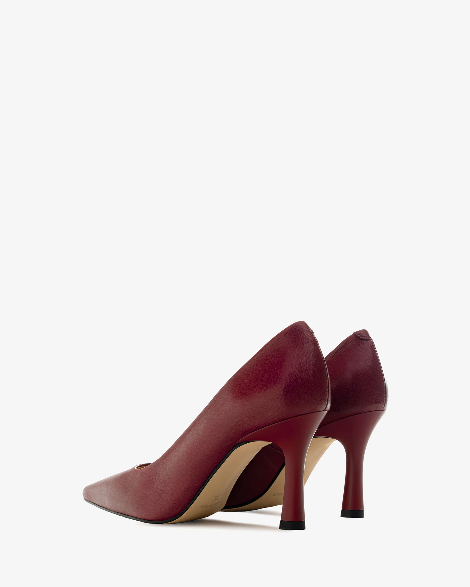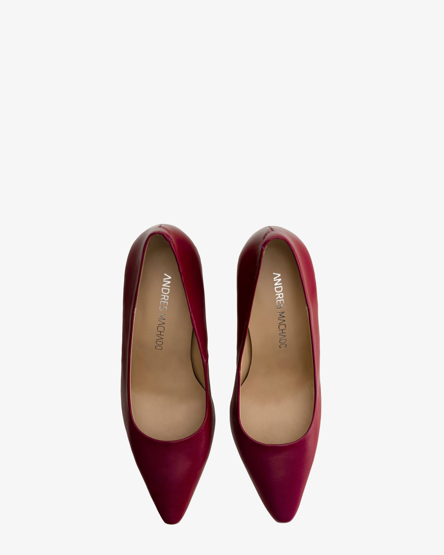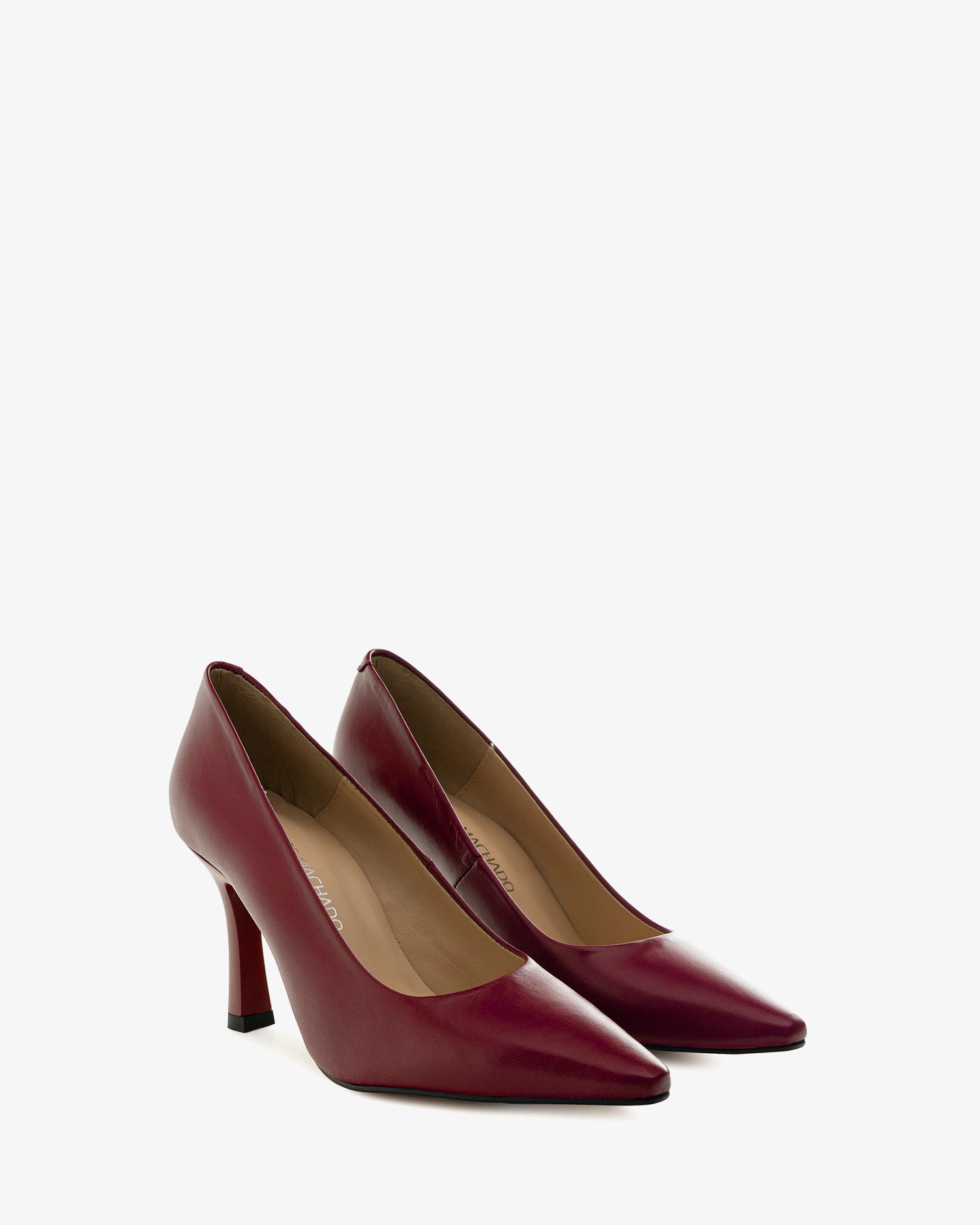 Escarpins en cuir de couleur Violet. Doublure en cuir et bout pointu. Talon fin effet bois de couleur Violet de 8 cm de haut pour les petites pointures du 32 au 35. Talon de 9 cm de haut pour les grandes pointures du 42 au 45. Fabrication espagnole.